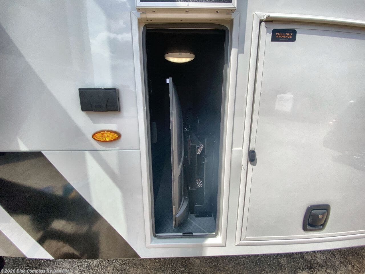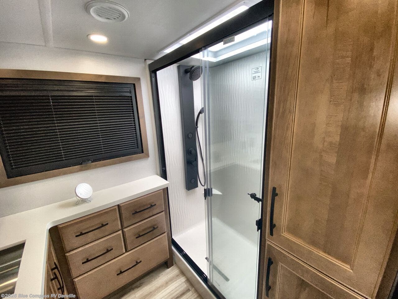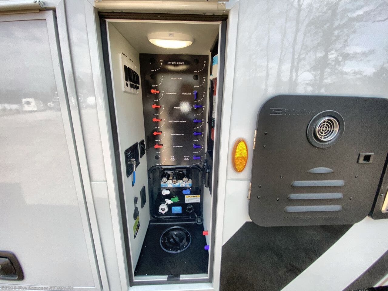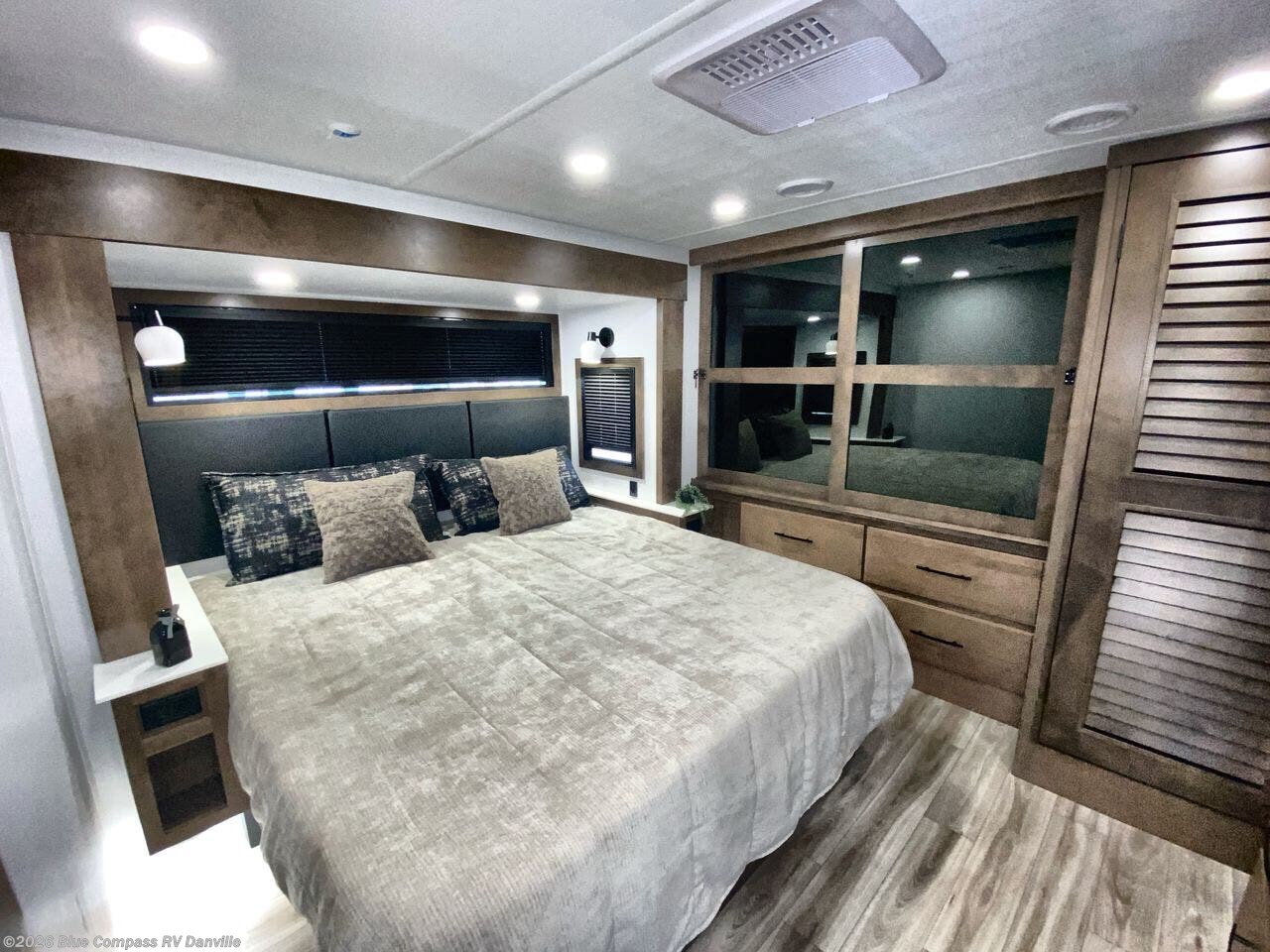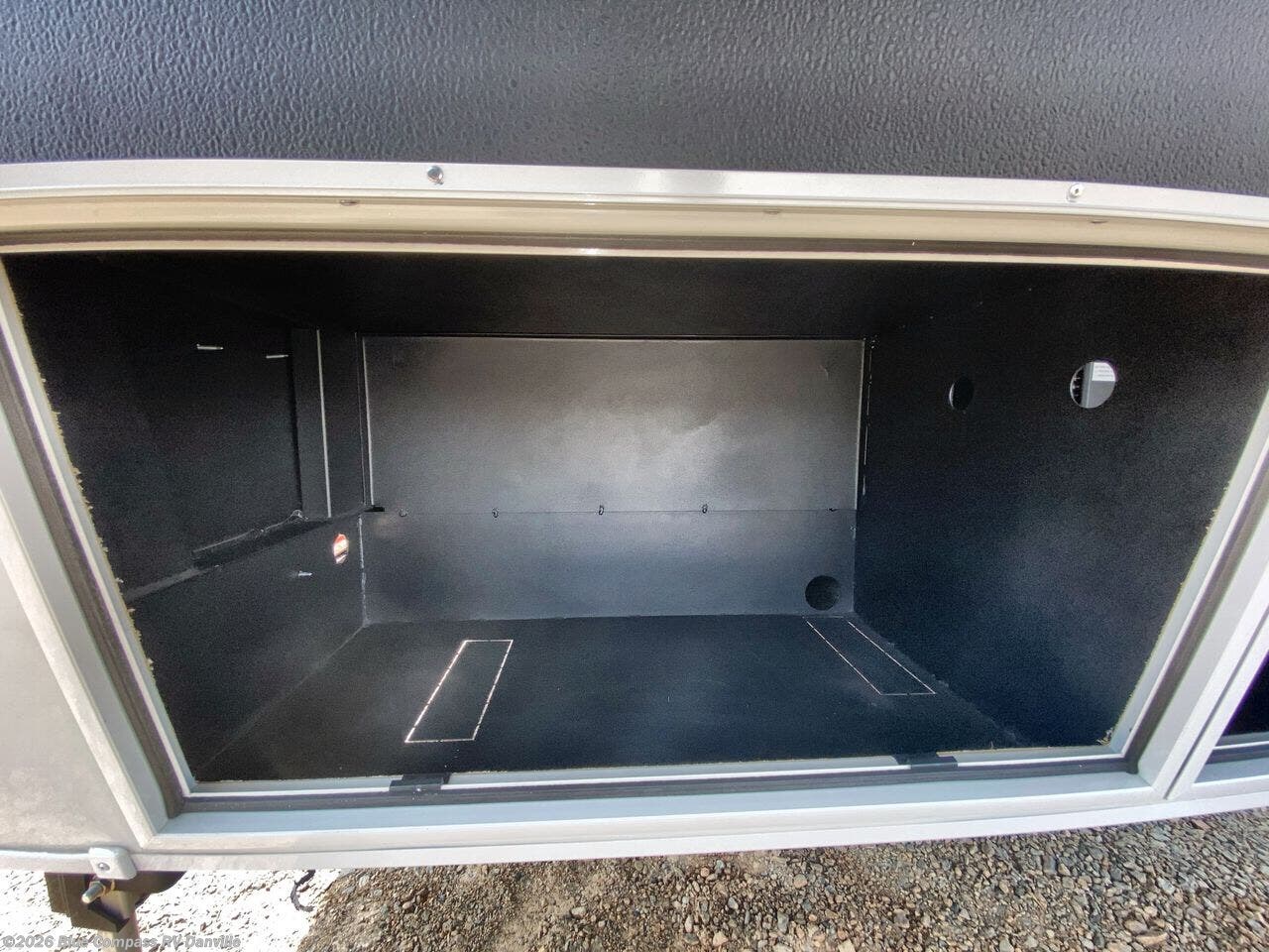It won't be hard to find comfort in this fifth wheel with triple slides for more space, a spacious front bedroom, and a rear living area with a comfy sofa! Once you've unloaded the exterior pull-out storage tray, you can put out the two awnings, then relax in your camp chairs. A four-burner range inside will let you make lunch for your crew, and a spacious kitchen island will provide more counter space. There is also a pantry, overhead cabinets, plus a second, swing-out hidden pantry behind the entertainment center with a fireplace. The pull-out dinette, power theater seating, and rear sofa will give you plenty of seating options, and the dual opposing slides in the combined kitchen and living area will create an open floorplan you are sure to love. Head towards the front to freshen up in the spacious bath with ample counter space, then enjoy a perfect night's rest in the front bedroom, complete with a king bed slide, dual nightstands, front wardrobe, plus a second wardrobe with washer and dryer prep.