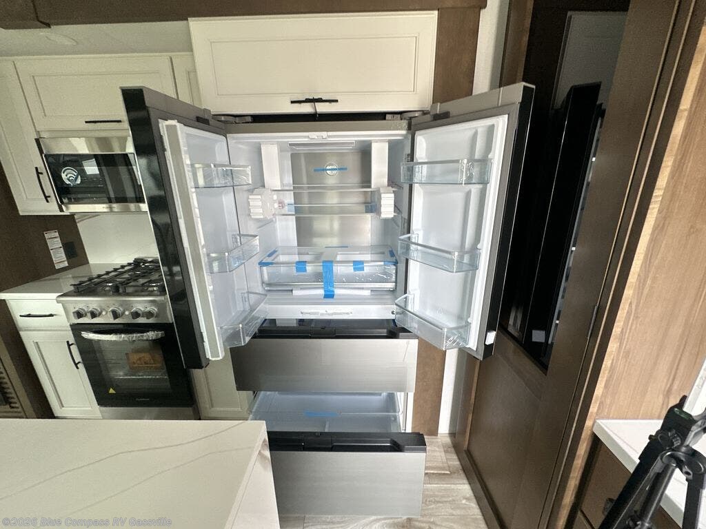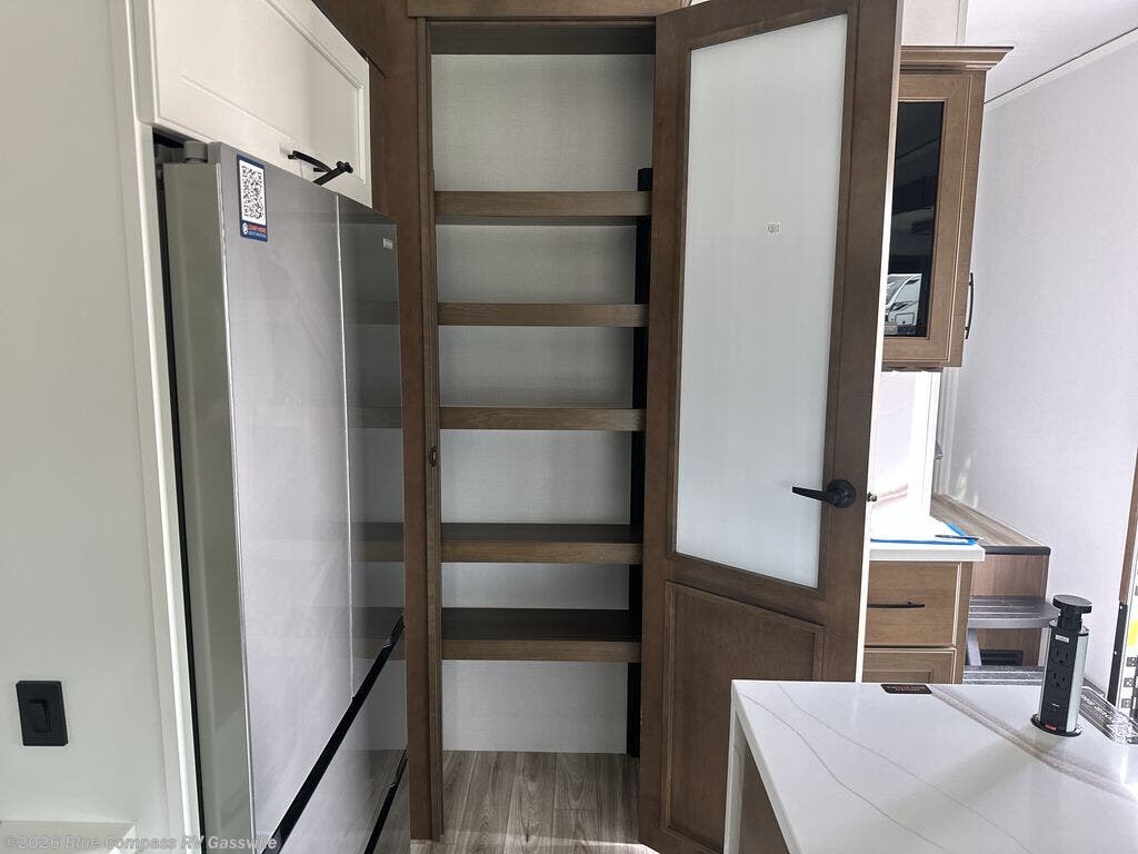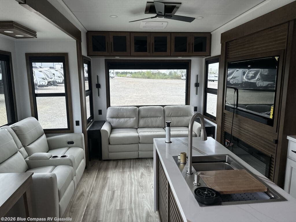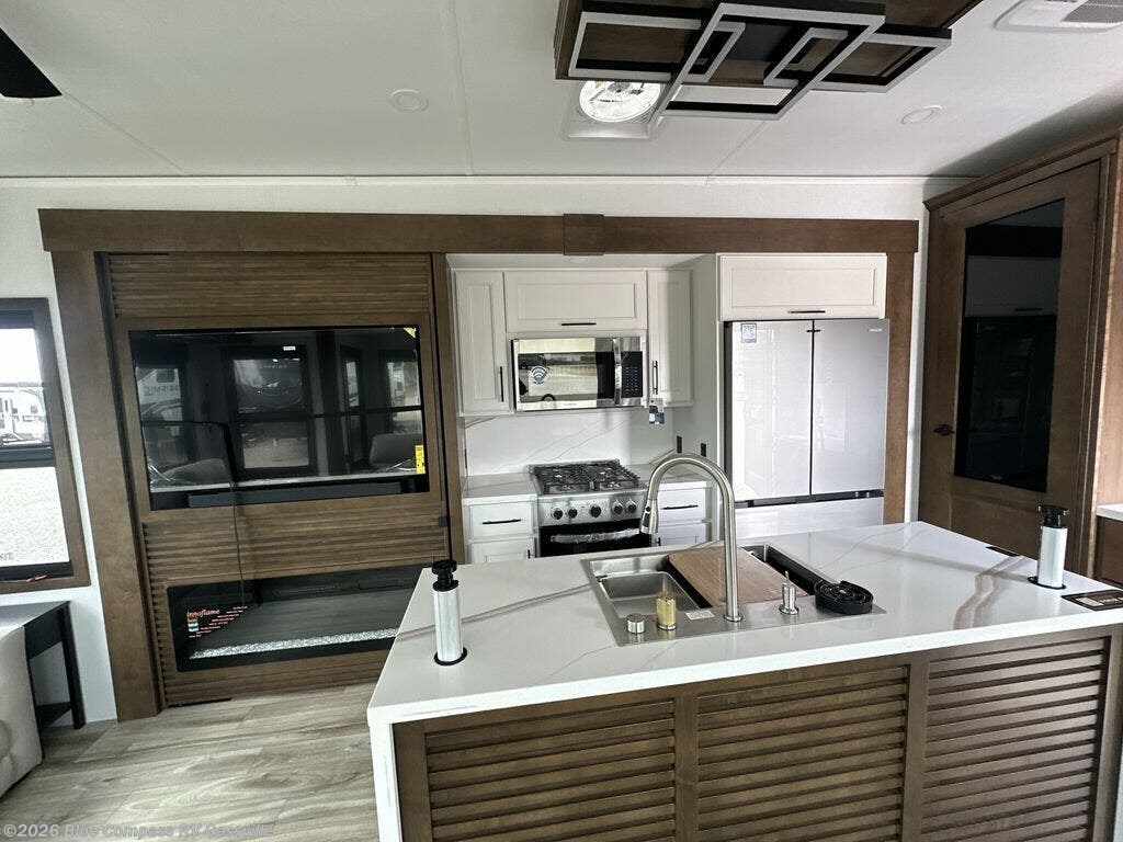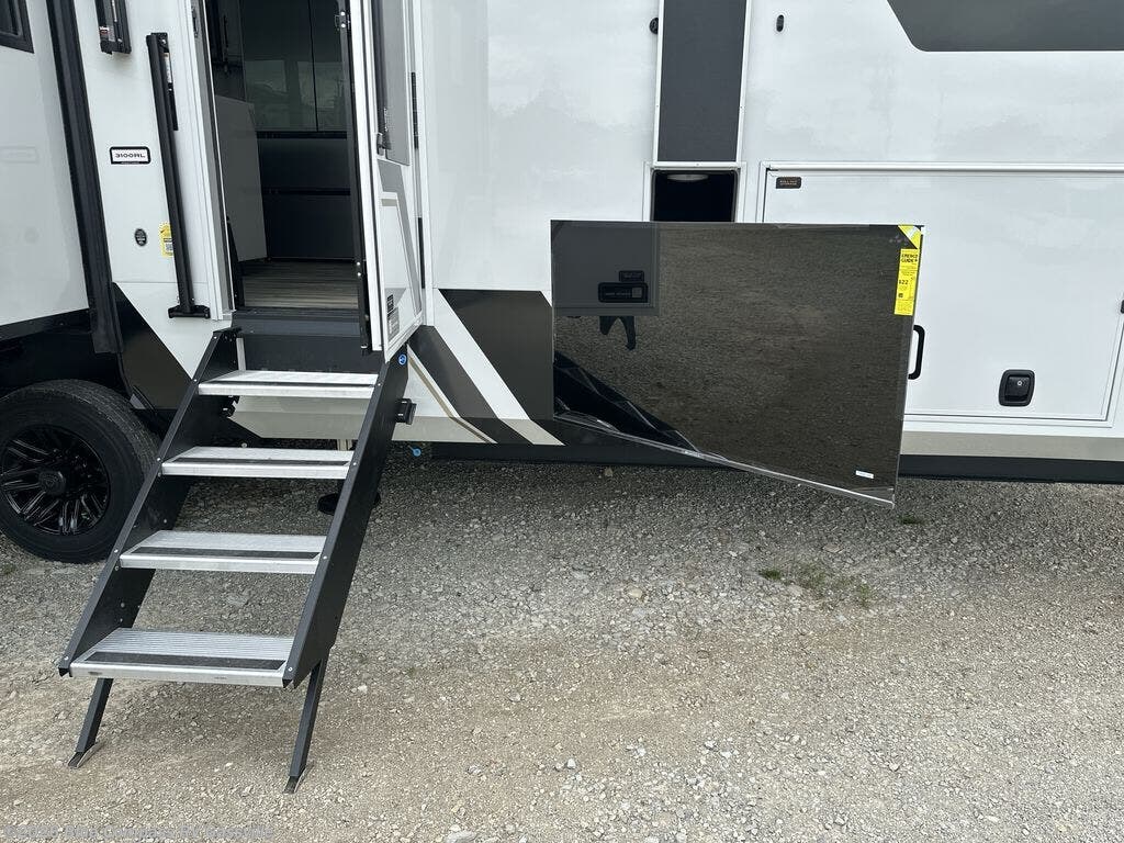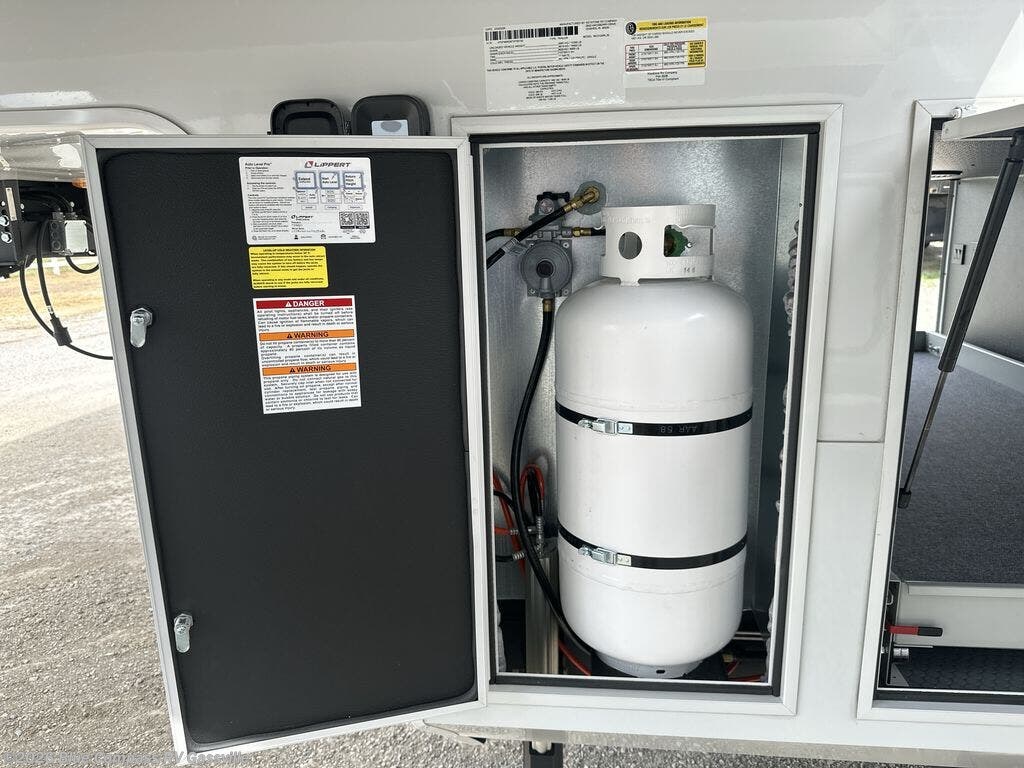 It won't be hard to find comfort in this fifth wheel with triple slides for more space, a spacious front bedroom, and a rear living area with a comfy sofa! Once you've unloaded the exterior pull-out storage tray, you can put out the two awnings, then relax in your camp chairs. A four-burner range inside will let you make lunch for your crew, and a spacious kitchen island will provide more counter space. There is also a pantry, overhead cabinets, plus a second, swing-out hidden pantry behind the entertainment center with a fireplace. The pull-out dinette, power theater seating, and rear sofa will give you plenty of seating options, and the dual opposing slides in the combined kitchen and living area will create an open floorplan you are sure to love. Head towards the front to freshen up in the spacious bath with ample counter space, then enjoy a perfect night's rest in the front bedroom, complete with a king bed slide, dual nightstands, front wardrobe, plus a second wardrobe with washer and dryer prep.