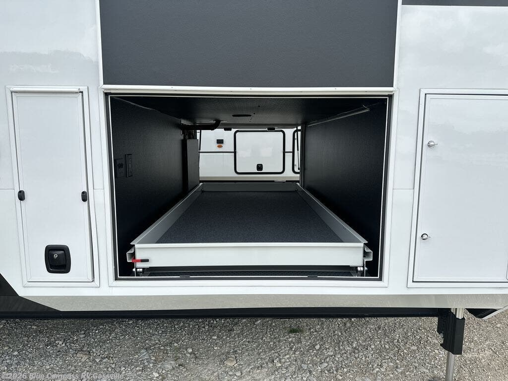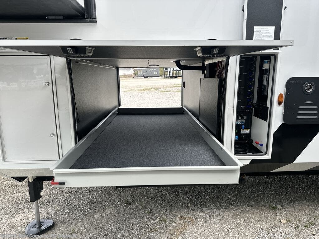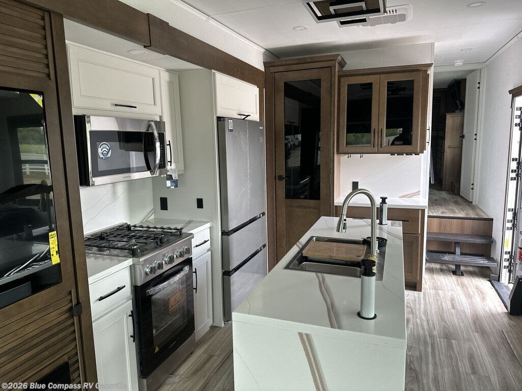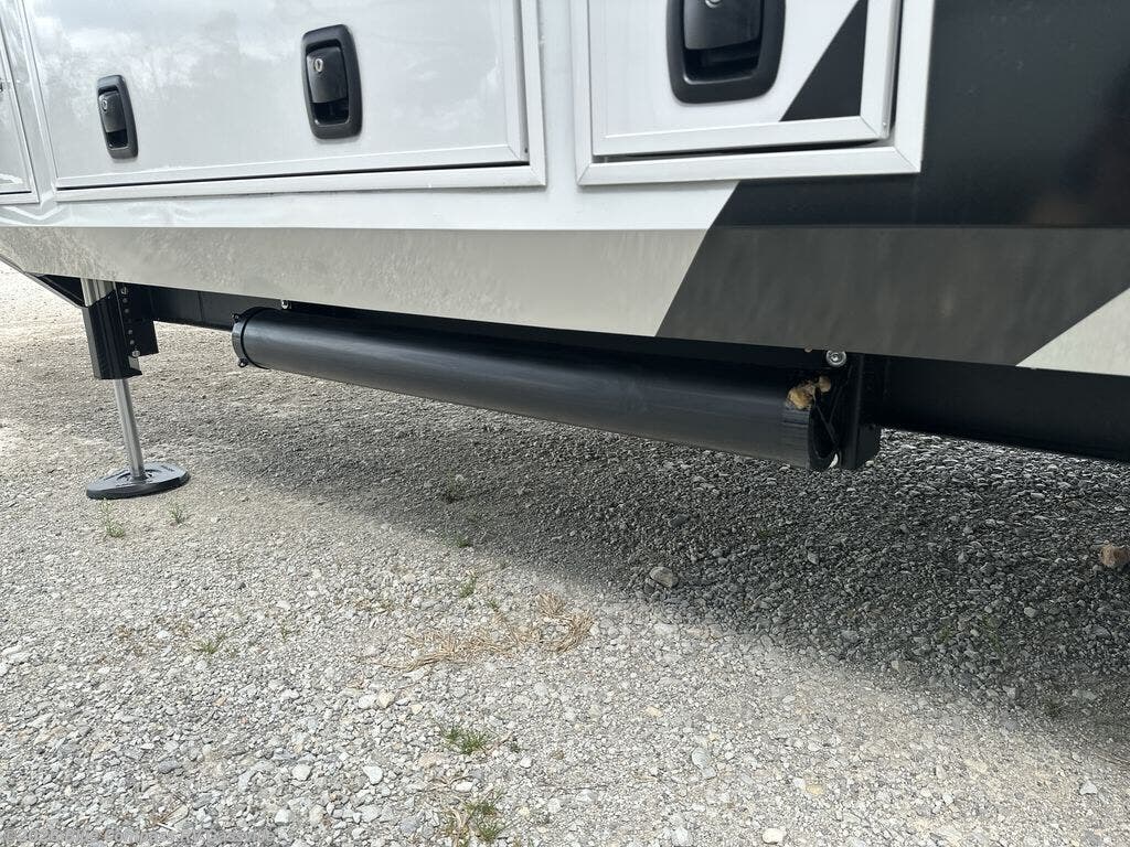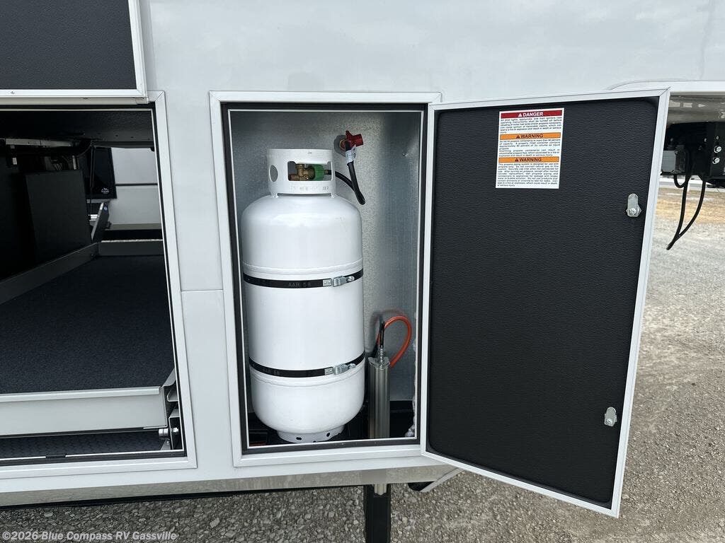 It won't be hard to find comfort in this fifth wheel with triple slides for more space, a spacious front bedroom, and a rear living area with a comfy sofa! Once you've unloaded the exterior pull-out storage tray, you can put out the two awnings, then relax in your camp chairs. A four-burner range inside will let you make lunch for your crew, and a spacious kitchen island will provide more counter space. There is also a pantry, overhead cabinets, plus a second, swing-out hidden pantry behind the entertainment center with a fireplace. The pull-out dinette, power theater seating, and rear sofa will give you plenty of seating options, and the dual opposing slides in the combined kitchen and living area will create an open floorplan you are sure to love. Head towards the front to freshen up in the spacious bath with ample counter space, then enjoy a perfect night's rest in the front bedroom, complete with a king bed slide, dual nightstands, front wardrobe, plus a second wardrobe with washer and dryer prep.