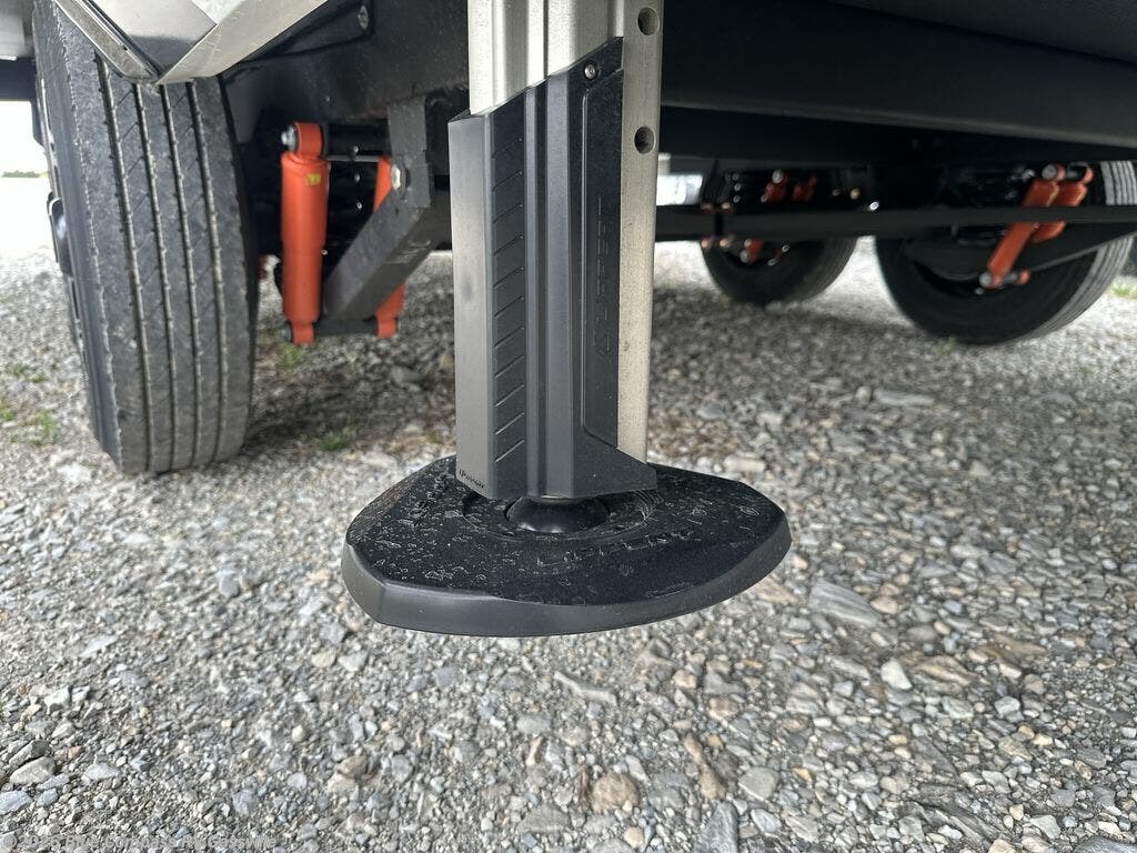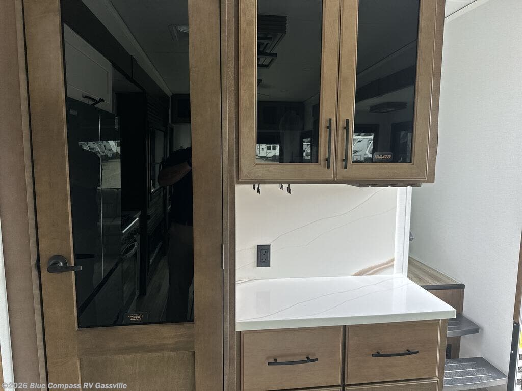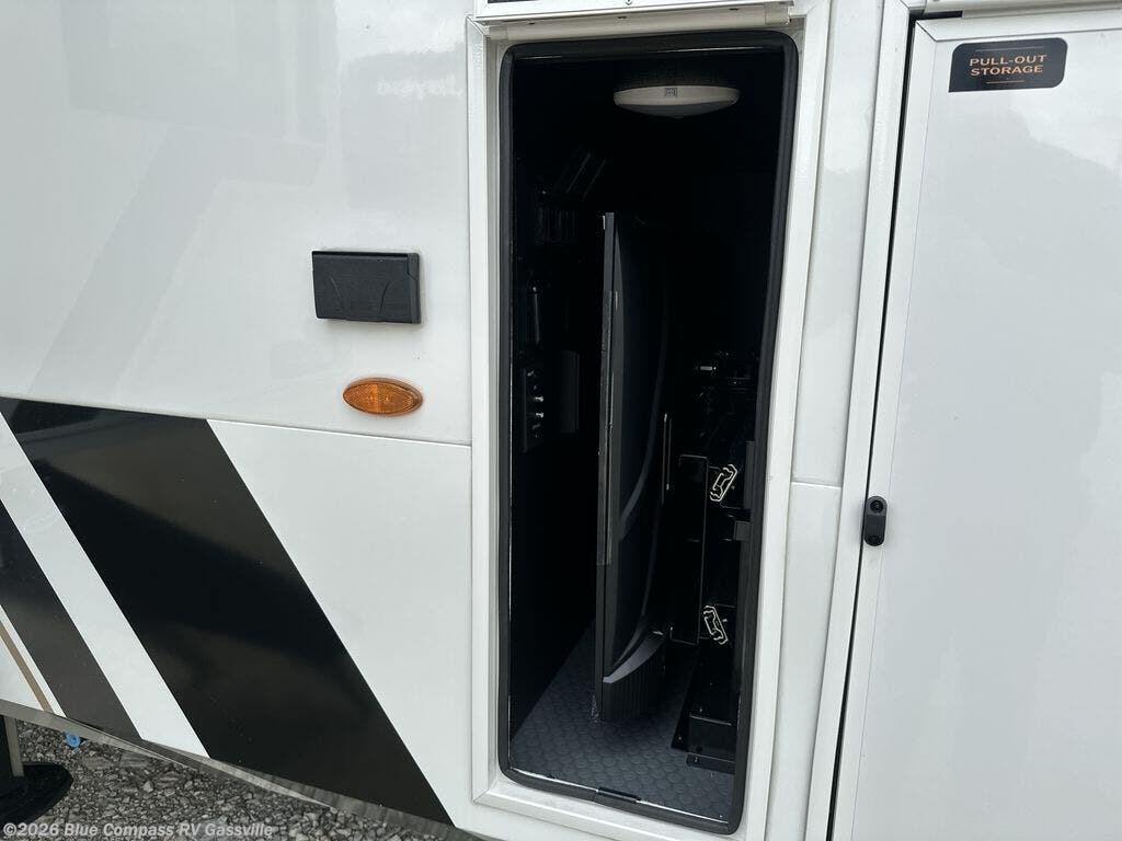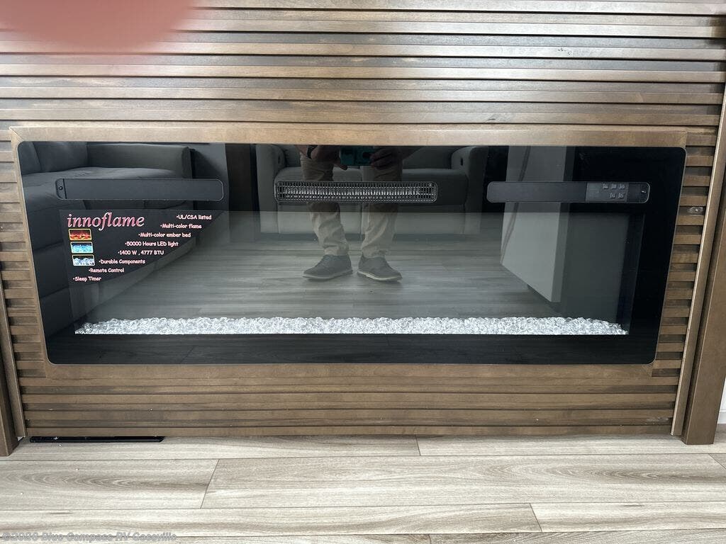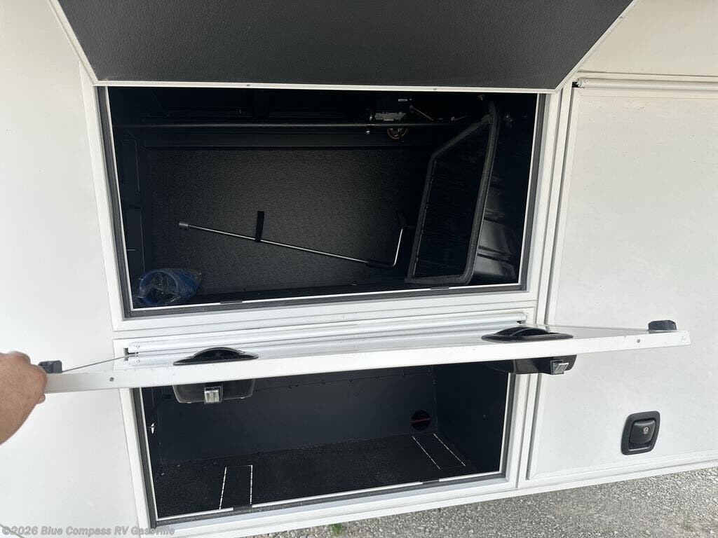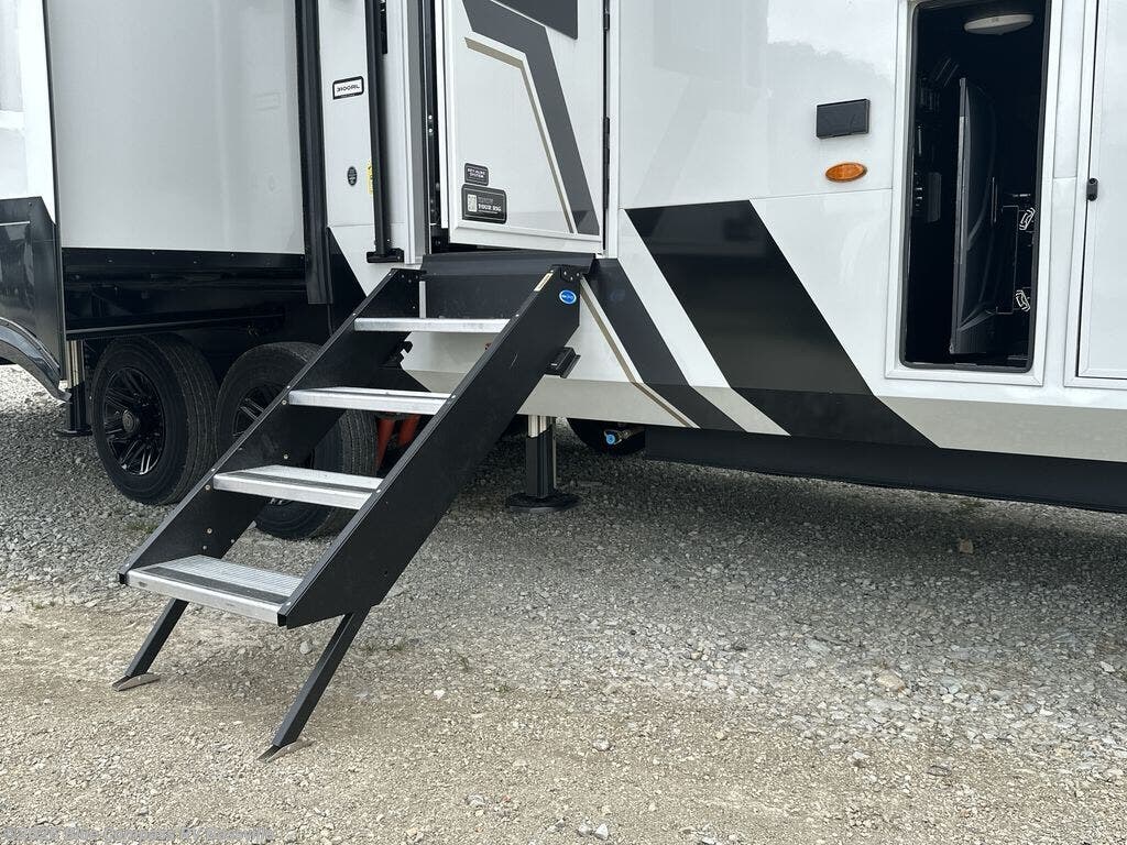 It won't be hard to find comfort in this fifth wheel with triple slides for more space, a spacious front bedroom, and a rear living area with a comfy sofa! Once you've unloaded the exterior pull-out storage tray, you can put out the two awnings, then relax in your camp chairs. A four-burner range inside will let you make lunch for your crew, and a spacious kitchen island will provide more counter space. There is also a pantry, overhead cabinets, plus a second, swing-out hidden pantry behind the entertainment center with a fireplace. The pull-out dinette, power theater seating, and rear sofa will give you plenty of seating options, and the dual opposing slides in the combined kitchen and living area will create an open floorplan you are sure to love. Head towards the front to freshen up in the spacious bath with ample counter space, then enjoy a perfect night's rest in the front bedroom, complete with a king bed slide, dual nightstands, front wardrobe, plus a second wardrobe with washer and dryer prep.