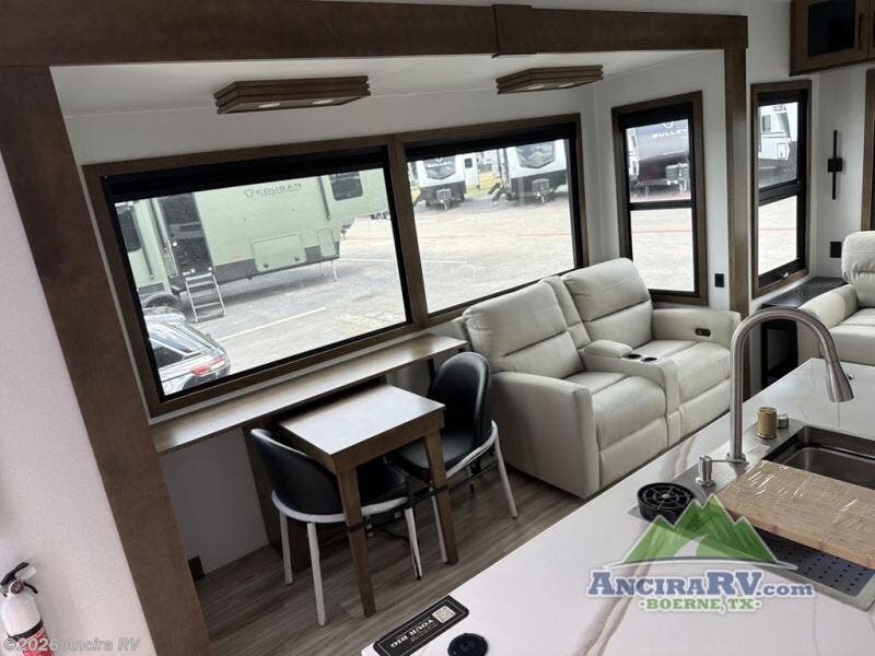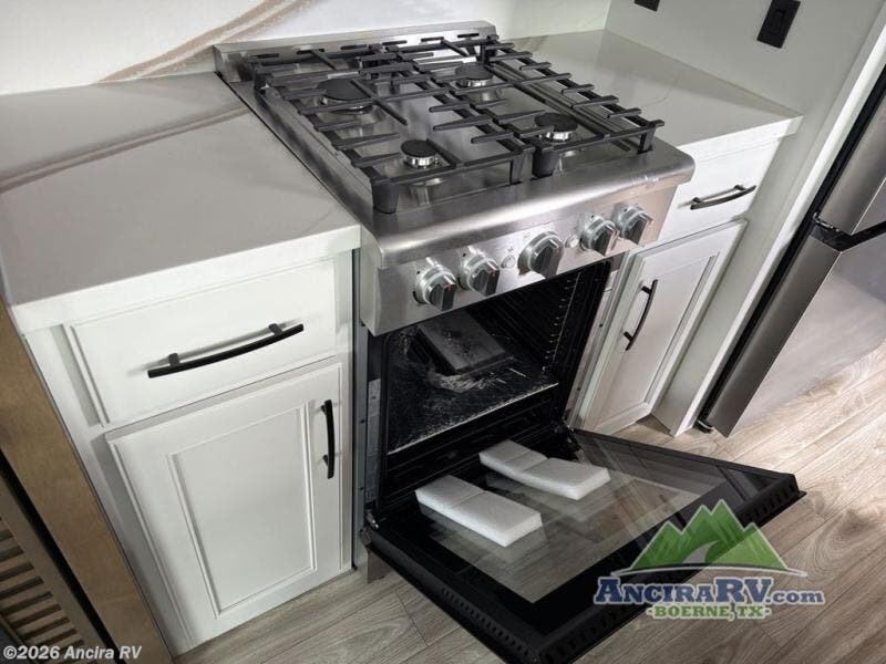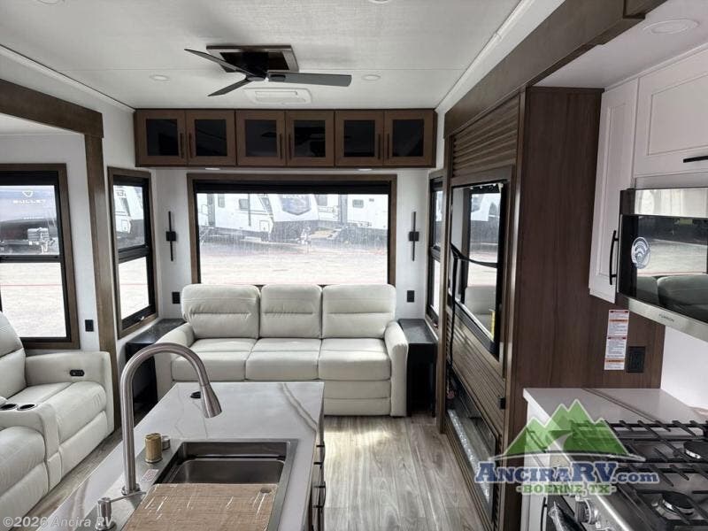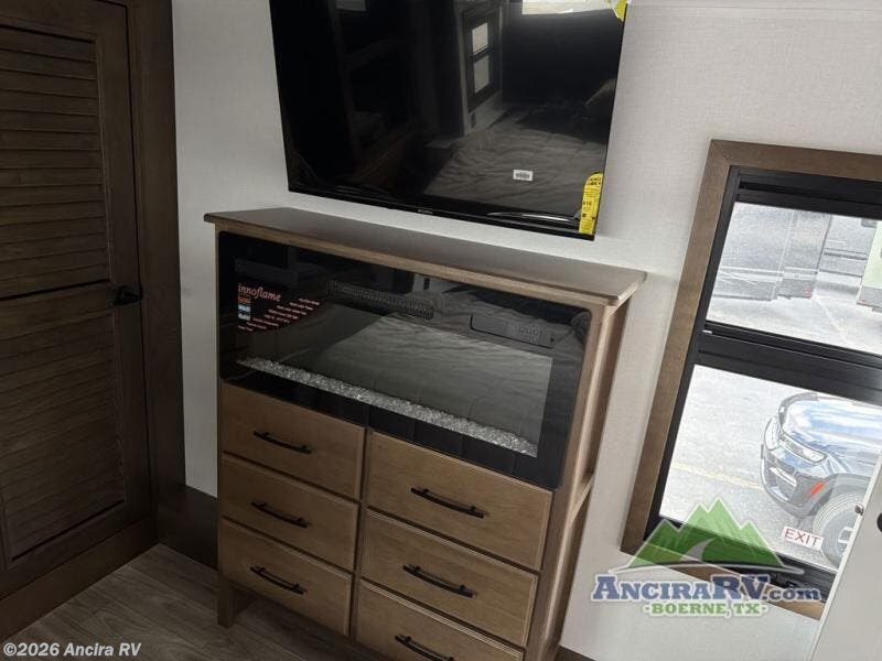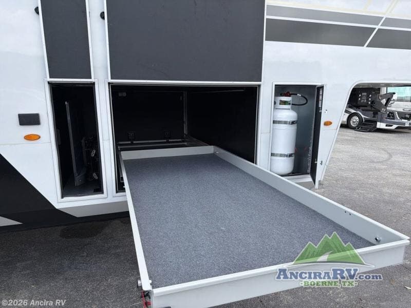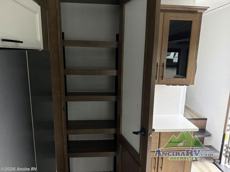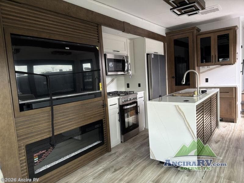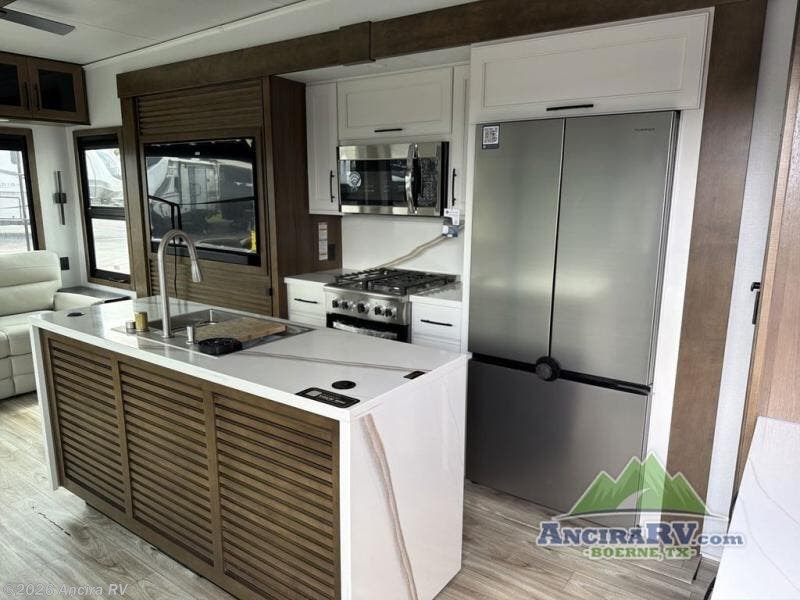 It won't be hard to find comfort in this fifth wheel with triple slides for more space, a spacious front bedroom, and a rear living area with a comfy sofa! Once you've unloaded the exterior pull-out storage tray, you can put out the two awnings, then relax in your camp chairs. A four-burner range inside will let you make lunch for your crew, and a spacious kitchen island will provide more counter space. There is also a pantry, overhead cabinets, plus a second, swing-out hidden pantry behind the entertainment center with a fireplace. The pull-out dinette, power theater seating, and rear sofa will give you plenty of seating options, and the dual opposing slides in the combined kitchen and living area will create an open floorplan you are sure to love. Head towards the front to freshen up in the spacious bath with ample counter space, then enjoy a perfect night's rest in the front bedroom, complete with a king bed slide, dual nightstands, front wardrobe, plus a second wardrobe with washer and dryer prep.