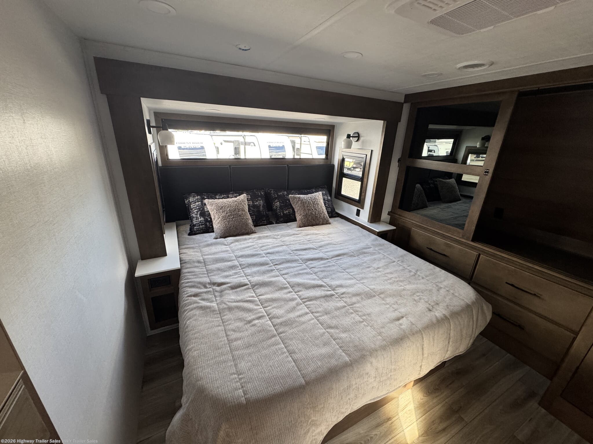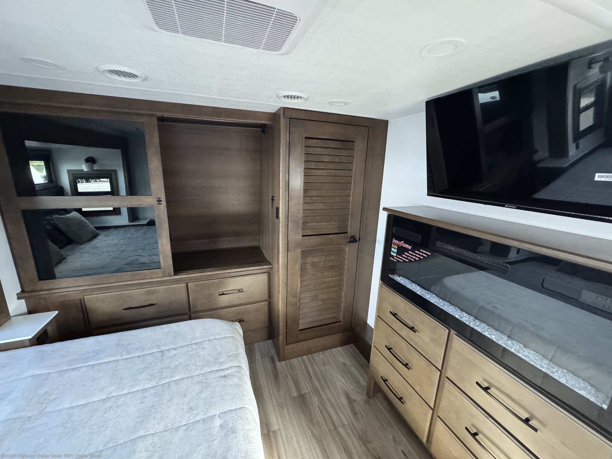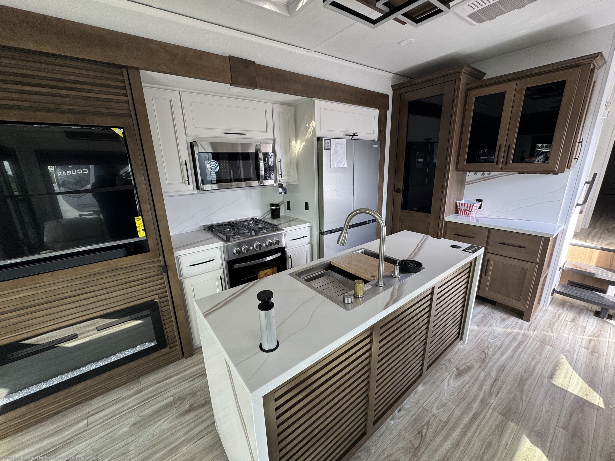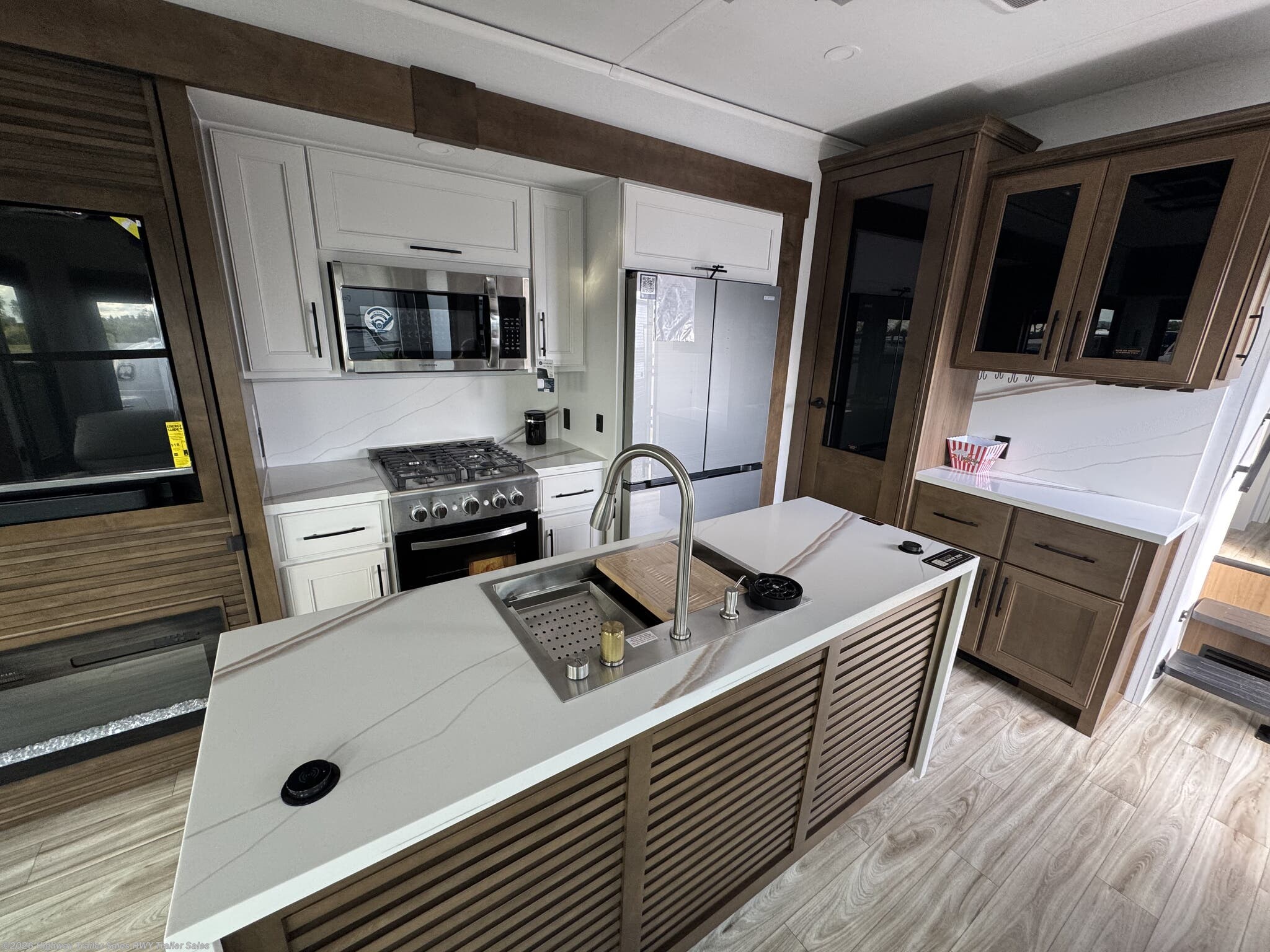 Fireplace, Free Standing Dinette w/Chairs, Glass Shower Door, Island Kitchen, King Size Bed, Kitchen Sink, Medicine Cabinet, Overhead Cabinetry, Roof Vents, Shower, Sofa Bed, Solid Surface Countertops, Theater Seating, Toilet, Wardrobe(s), Washer/Dryer Prep