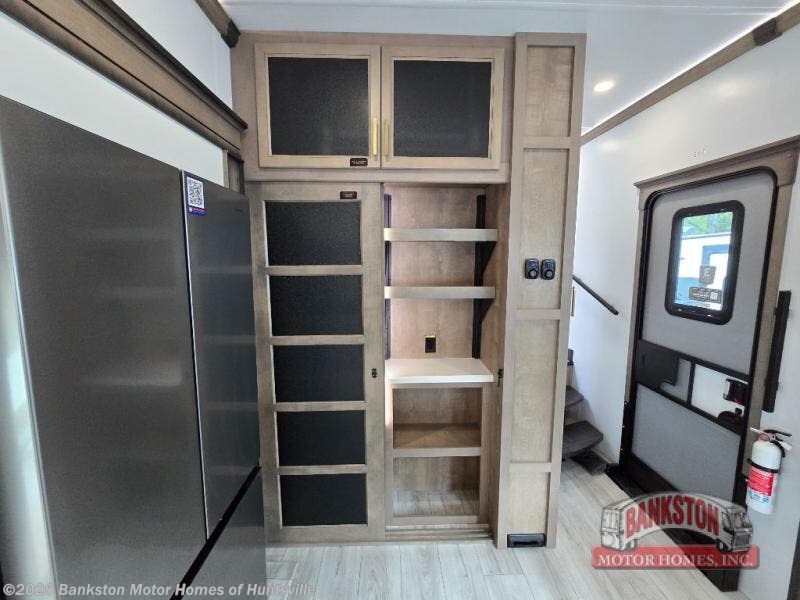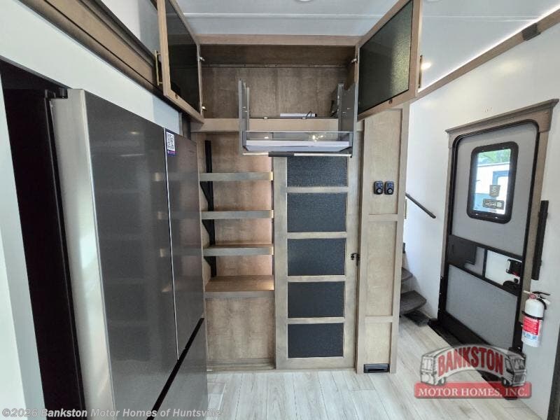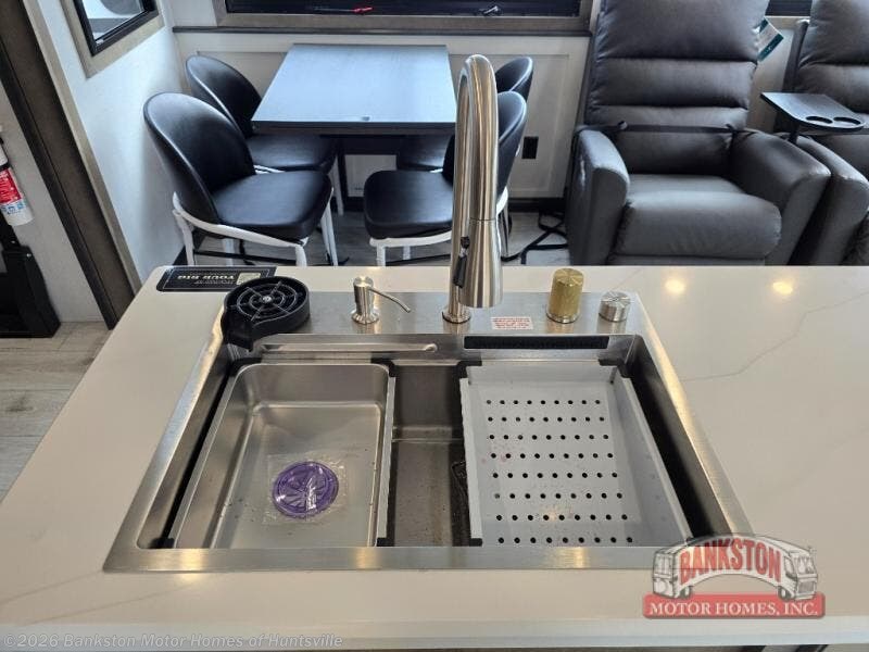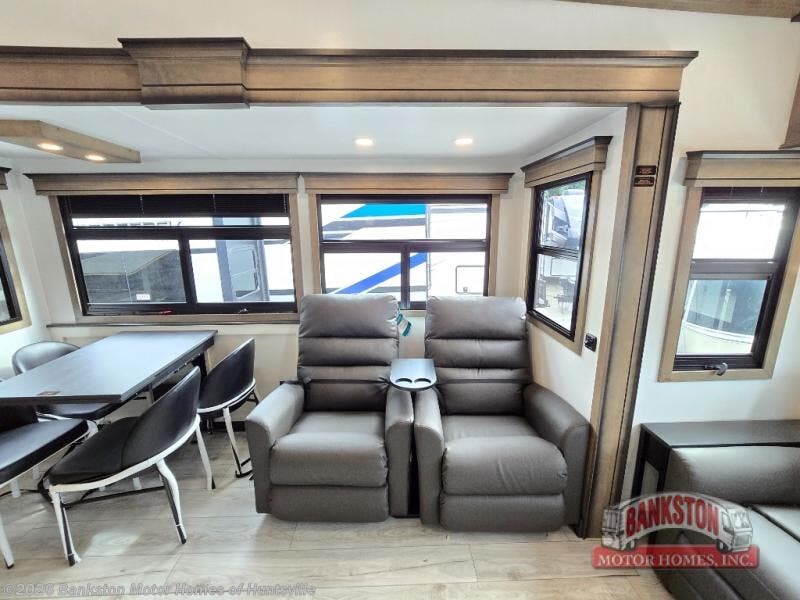 Luxury abounds throughout this fifth wheel! Starting in the kitchen with the island, pull down storage panty, 24" range, and residential convection microwave. The full bathroom has a 48" x 30" fiberglass shower with a seat, decorative glass enclosure, and a skylight above it for more natural lighting. Sleep like a baby in the front private bedroom on the king bed slide with storage underneath and keep your clothes looking their best with the front storage that has dual closets and additional storage. The rear living area offers true relaxation with a hide-a-bed sofa and residential power recliners, and there is a pivot dinette where you can dine at.