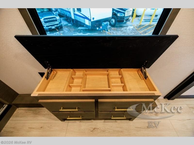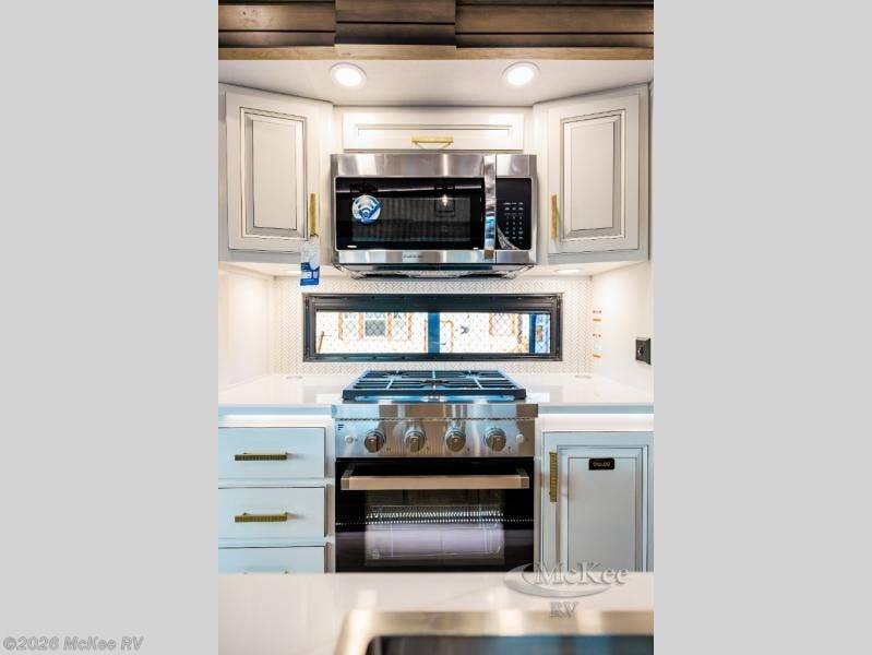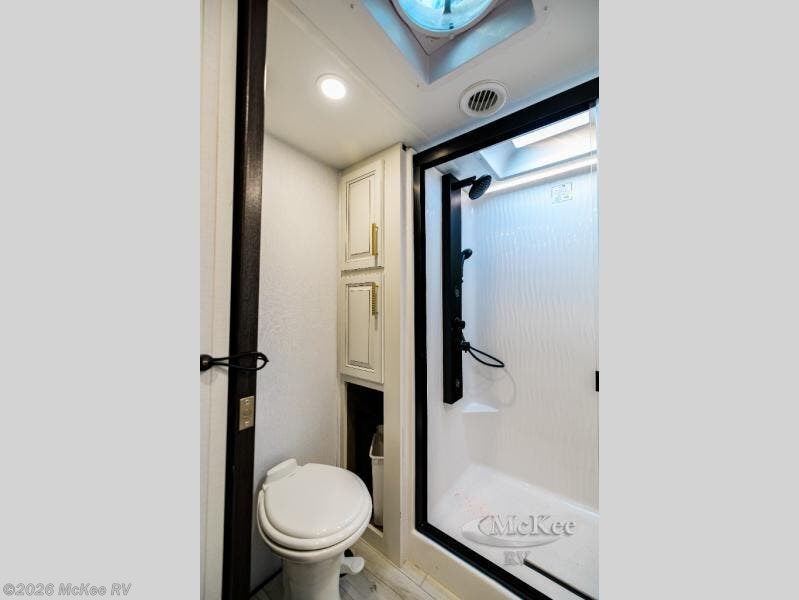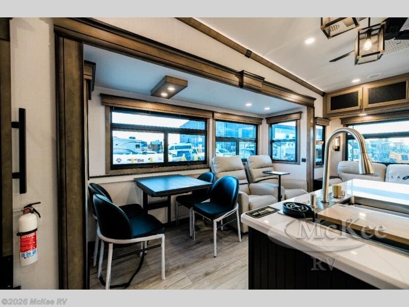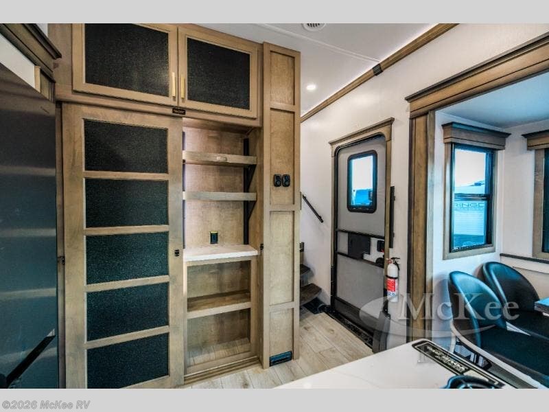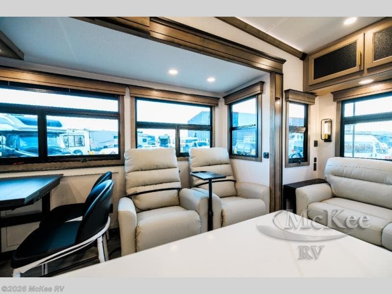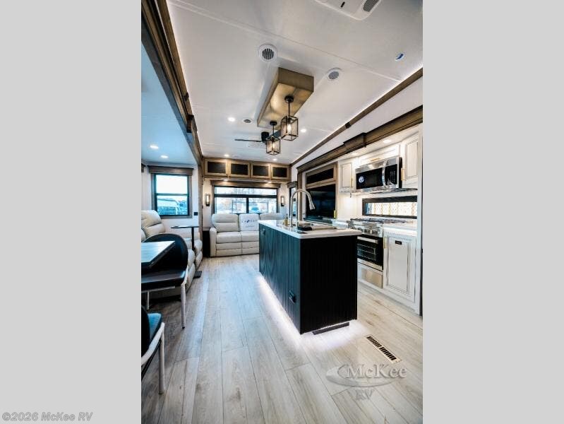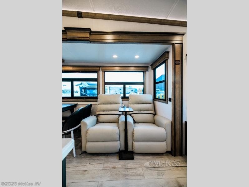 Luxury abounds throughout this fifth wheel! Starting in the kitchen with the island, pull down storage panty, 24" range, and residential convection microwave. The full bathroom has a 48" x 30" fiberglass shower with a seat, decorative glass enclosure, and a skylight above it for more natural lighting. Sleep like a baby in the front private bedroom on the king bed slide with storage underneath and keep your clothes looking their best with the front closet that has dual closets and additional storage. The rear living area offers true relaxation with a hide-a-bed sofa and residential power recliners, and there is a pivot dinette where you can dine at.