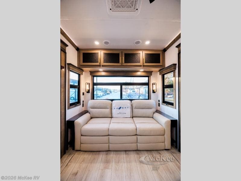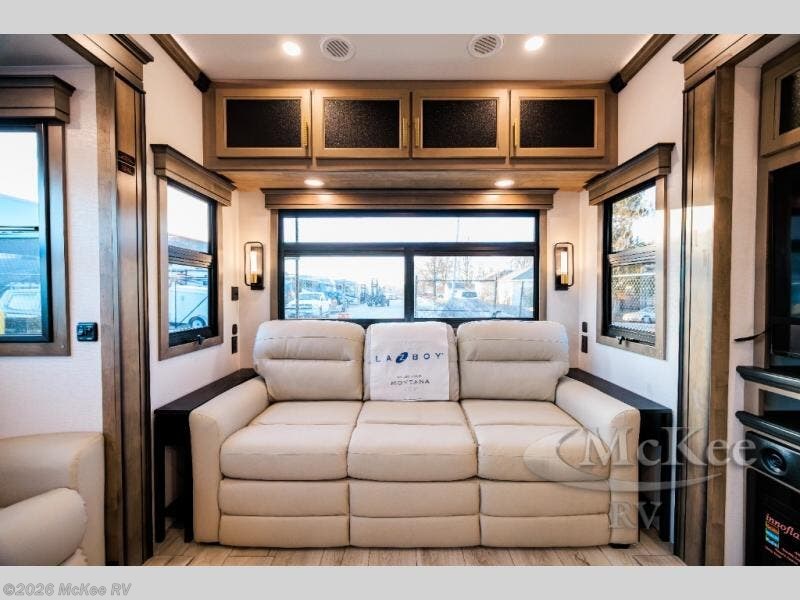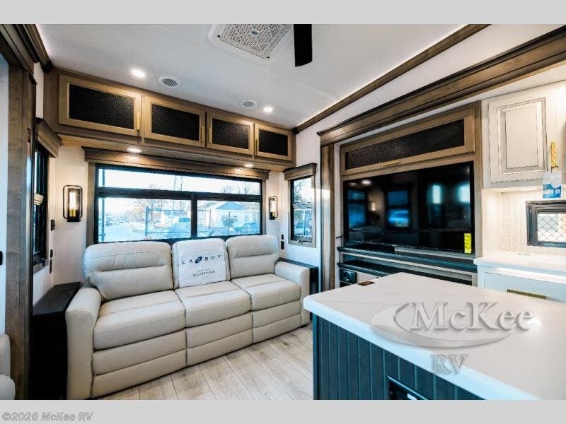 Enjoy luxury, innovation, and the outdoors in any one of Montana's finest fifth wheels. Each set the standard with exceptional features, and exciting factory installed options to provide you a great home on the road. Keystone's 12" I-beam chassis with z-frame technology provides a strong and durable foundation to your fifth wheel, and the four season living package will help extend your camping season. A few other construction features you will appreciate include a MORryde CRE3000 suspension, a fully walkable roof with an alpha seamless TPO membrane system, and 4k square frameless tinted safety glass windows. Each feature stylish interiors with two decor choices paired with beautiful hardwood cabinetry, Beauflor vinyl flooring throughout, central vacuum, plus a La-Z-Boy furniture package for all-around comfort!