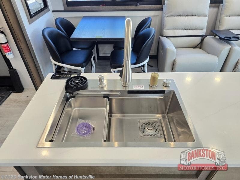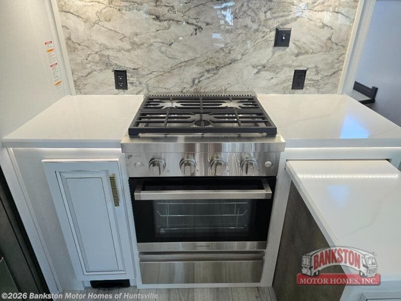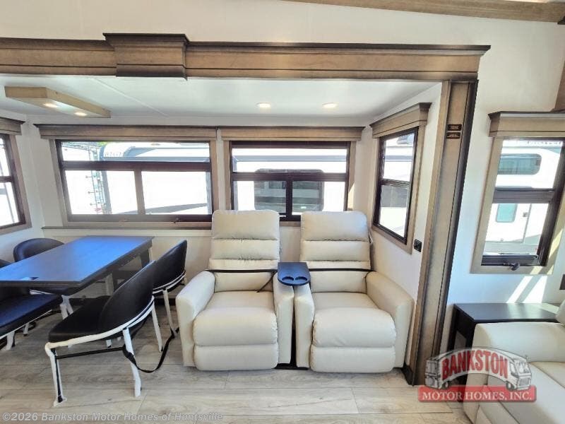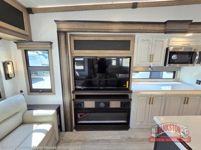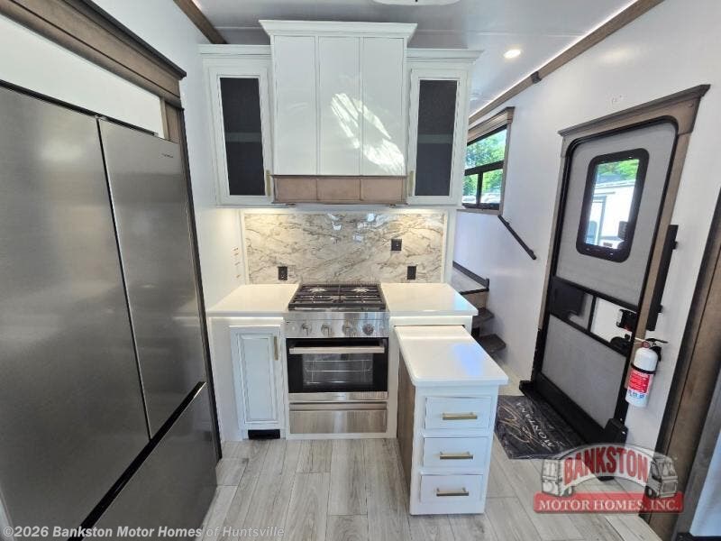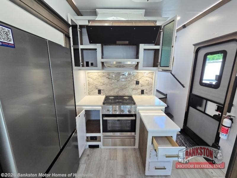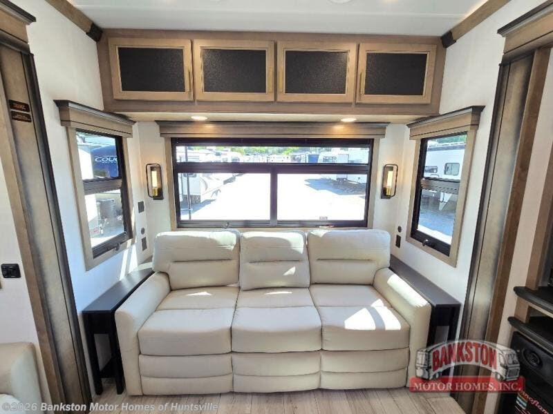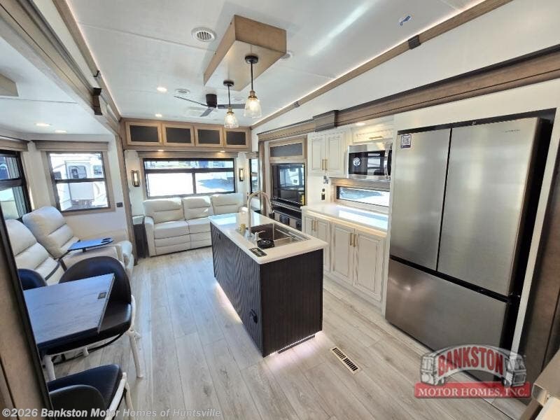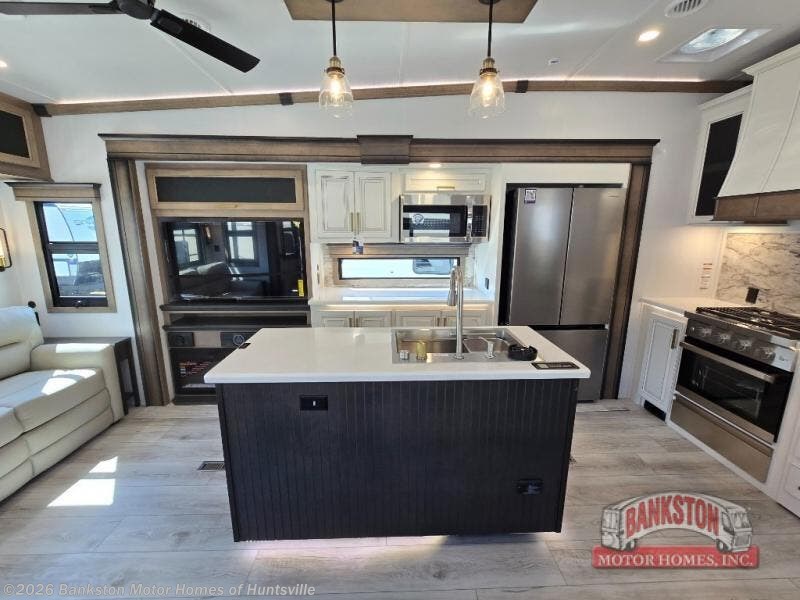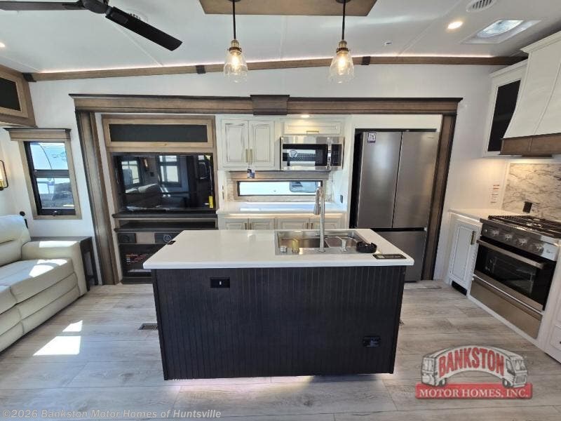 Luxury abounds throughout this fifth wheel! Starting in the kitchen with the island, two pull out pantries with extra countertop space above it, a 24" range with hidden storage, and a pull out countertop for more prepping space. The full bathroom has a 48" x 30" fiberglass shower with a seat, decorative glass enclosure, and skylight above it for more natural lighting as two get ready at once with the dual sink vanity. Sleep like a baby in the front private bedroom on the king bed slide with storage underneath and keep your clothes looking their best with two closets and additional storage. The rear living area offers true relaxation with a hide-a-bed sofa and residential power recliners across from the entertainment center with a 5,000 BTU decorative fireplace heater and 50" Smart TV to watch your favorite movies!