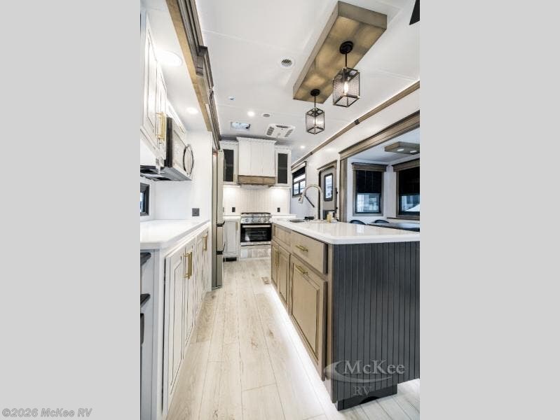 Luxury abounds throughout this fifth wheel! Starting in the kitchen with the island, two pull out pantries with extra countertop space above it, a 24" range with hidden storage, and a pull out countertop for more prepping space. The full bathroom has a 48" x 30" fiberglass shower with a seat, decorative glass enclosure, and skylight above it for more natural lighting as two get ready at once with the dual sink vanity. Sleep like a baby in the front private bedroom on the king bed slide with storage underneath and keep your clothes looking their best with two closets and additional storage. The rear living area offers true relaxation with a hide-a-bed sofa and residential power recliners across from the entertainment center with a 5,000 BTU decorative fireplace heater and 50" Smart TV to watch your favorite movies!