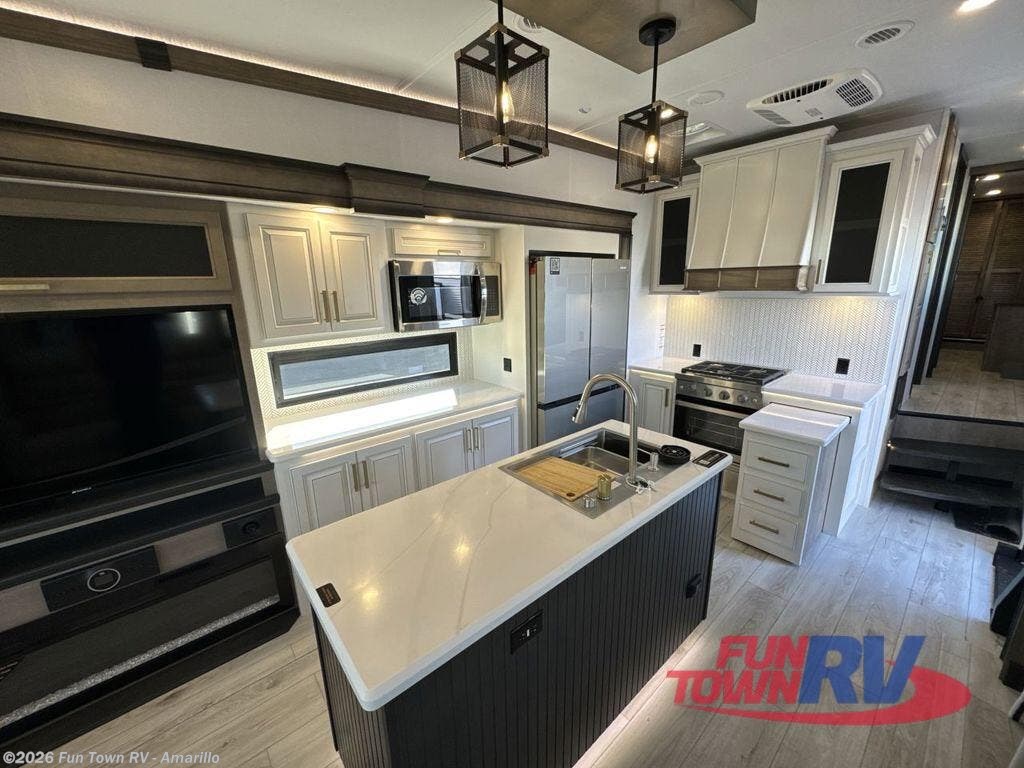 Luxury abounds throughout this fifth wheel! Starting in the kitchen with the island, two pull out pantries with extra countertop space above it, a 24" range with hidden storage, and a pull out countertop for more prepping space. The full bathroom has a 48" x 30" fiberglass shower with a seat, decorative glass enclosure, and skylight above it for more natural lighting as two get ready at once with the dual sink vanity. Sleep like a baby in the front private bedroom on the king bed slide with storage underneath and keep your clothes looking their best with two closets and additional storage. The rear living area offers true relaxation with a hide-a-bed sofa and residential power recliners across from the entertainment center with a 5,000 BTU decorative fireplace heater and 50" Smart TV to watch your favorite movies!
