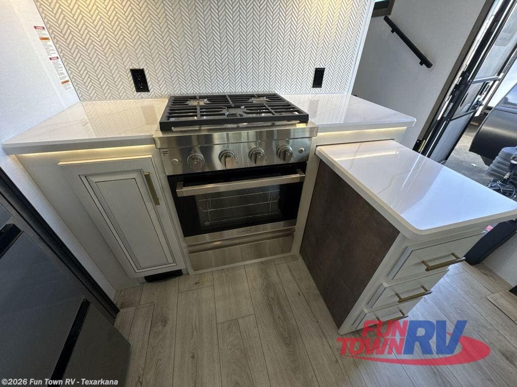 Luxury abounds throughout this fifth wheel! Starting in the kitchen with the island, two pull out pantries with extra countertop space above it, a 24" range with hidden storage, and a pull out countertop for more prepping space. The full bathroom has a 48" x 30" fiberglass shower with a seat, decorative glass enclosure, and skylight above it for more natural lighting as two get ready at once with the dual sink vanity. Sleep like a baby in the front private bedroom on the king bed slide with storage underneath and keep your clothes looking their best with two closets and additional storage. The rear living area offers true relaxation with a hide-a-bed sofa and residential power recliners across from the entertainment center with a 5,000 BTU decorative fireplace heater and 50" Smart TV to watch your favorite movies!