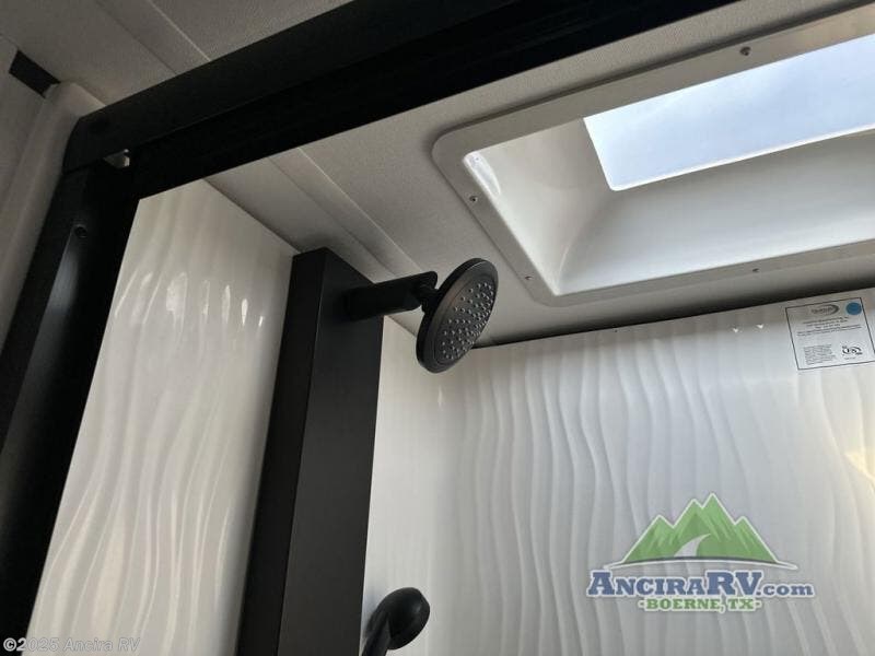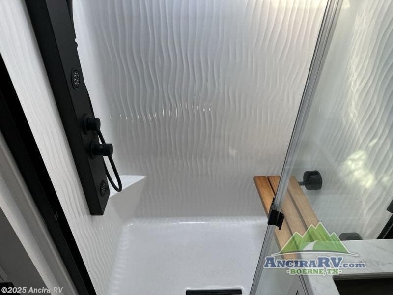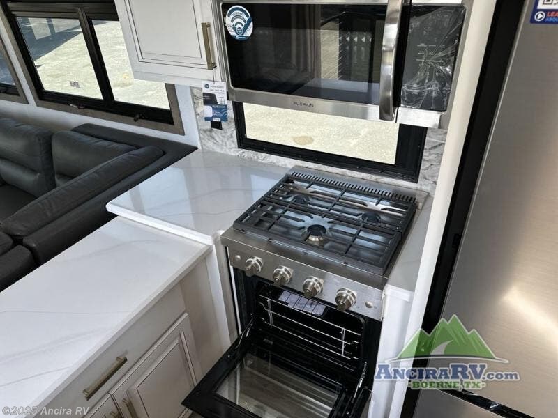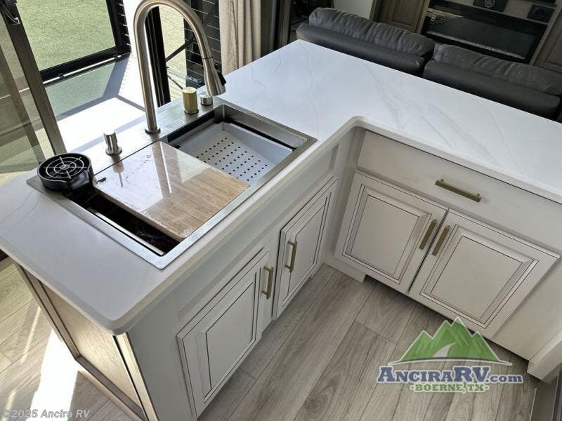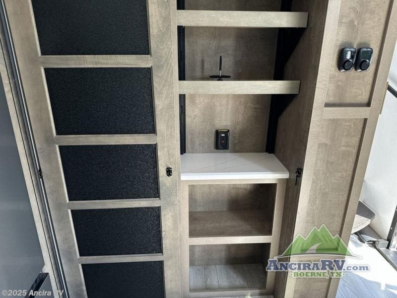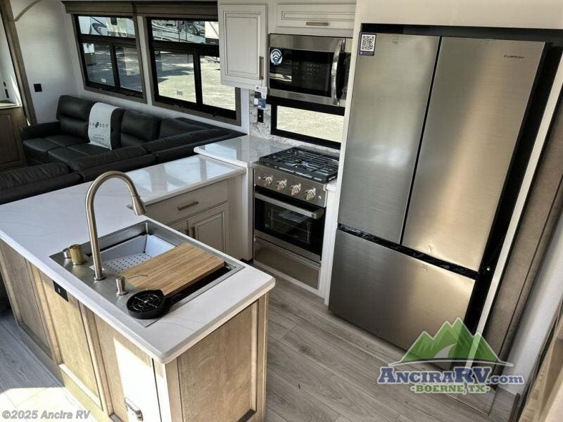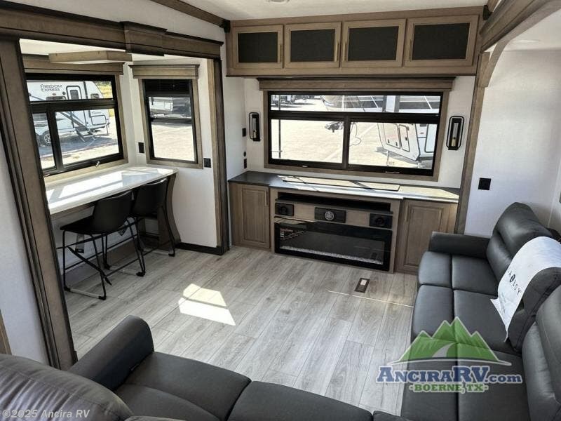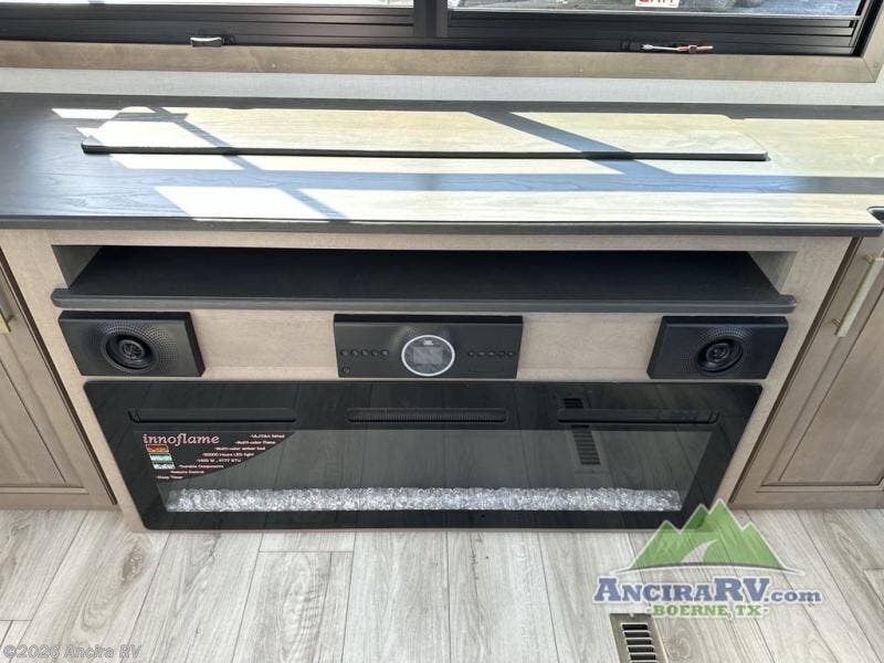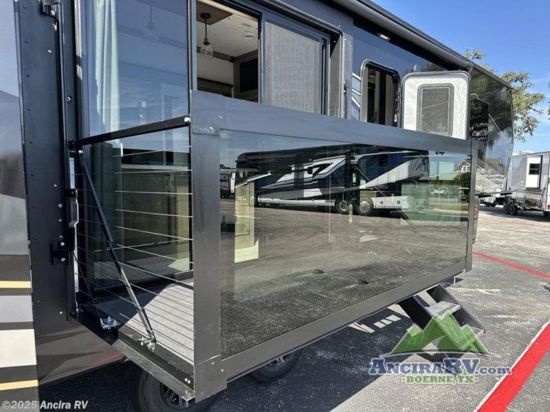 Luxury abounds throughout this fifth wheel starting in the centrally located kitchen featuring an L-shaped counter, a pull down storage pantry, a 24" range with an overhead convection microwave, and an 18 cu. ft. residential refrigerator with ice an maker. Just up the steps to the right of the entry, you will find a spacious bathroom featuring a 48" x 30" fiberglass shower with a seat, decorative glass enclosure, linen cabinet, and skylight above it for more natural lighting. Sleep like a baby in the front private bedroom on the king bed slide with storage underneath, and keep your clothes looking their best with the front closets. The rear entertainment living area offers true relaxation with L-shaped seating including a hide-a-bed sofa along the roadside, and powered theater seating facing the entertainment center with a 5,000 BTU decorative fireplace heater and Smart TV to watch your favorite movies! And don't overlook the best part, the powered side patio to entertain guests!