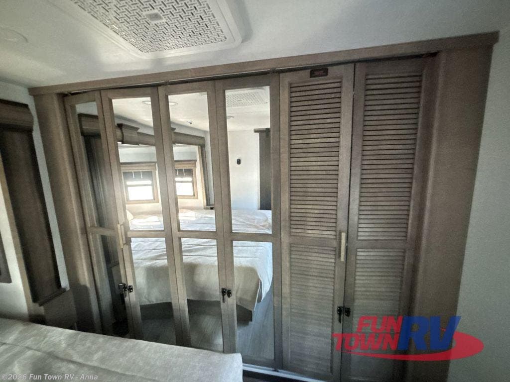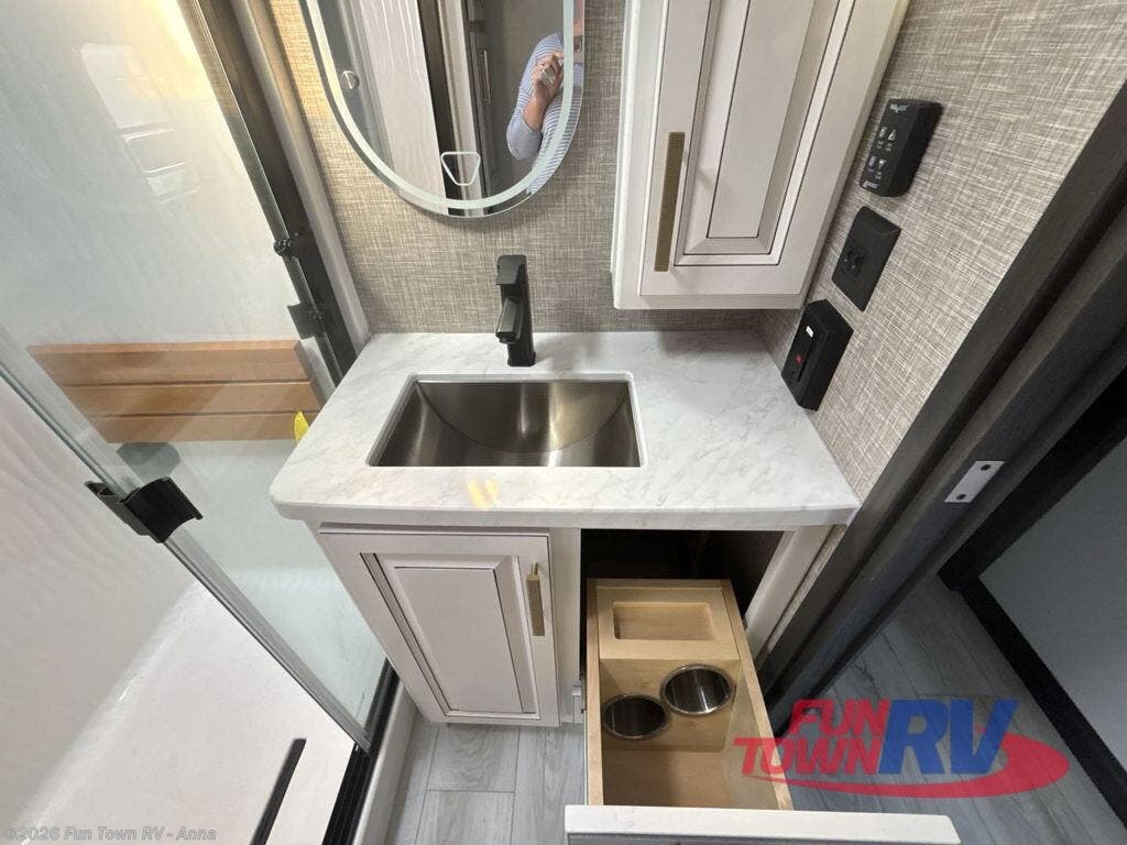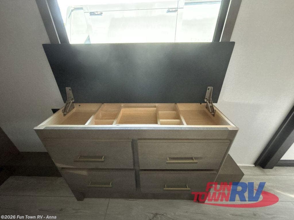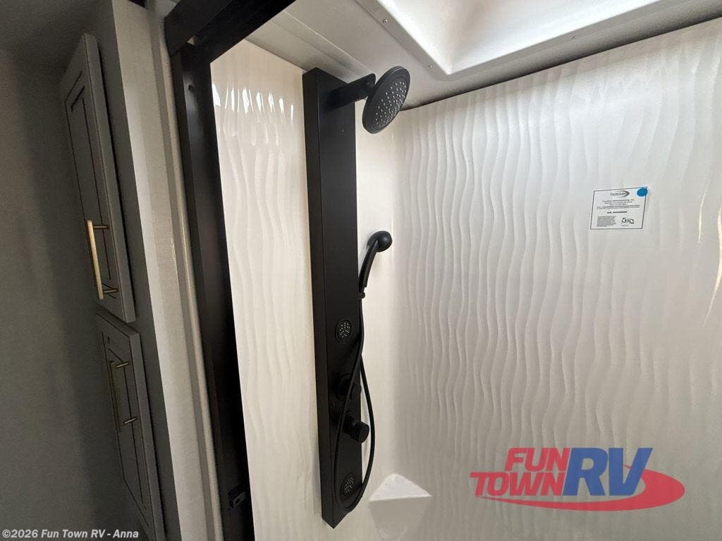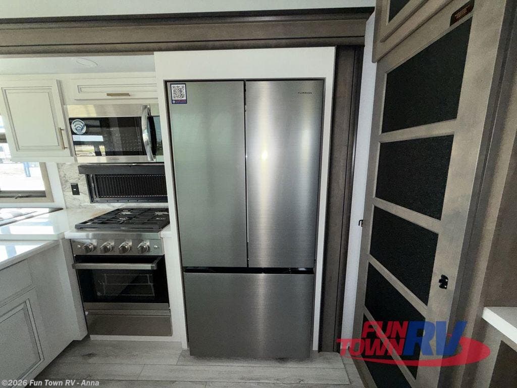 Luxury abounds throughout this fifth wheel starting in the centrally located kitchen featuring an L-shaped counter, a pull down storage pantry, a 24" range with an overhead convection microwave, and an 18 cu. ft. residential refrigerator with ice an maker. Just up the steps to the right of the entry, you will find a spacious bathroom featuring a 48" x 30" fiberglass shower with a seat, decorative glass enclosure, linen cabinet, and skylight above it for more natural lighting. Sleep like a baby in the front private bedroom on the king bed slide with storage underneath, and keep your clothes looking their best with the front closets. The rear entertainment living area offers true relaxation with L-shaped seating including a hide-a-bed sofa along the roadside, and powered theater seating facing the entertainment center with a 5,000 BTU decorative fireplace heater and Smart TV to watch your favorite movies! And don't overlook the best part, the powered side patio to entertain guests!