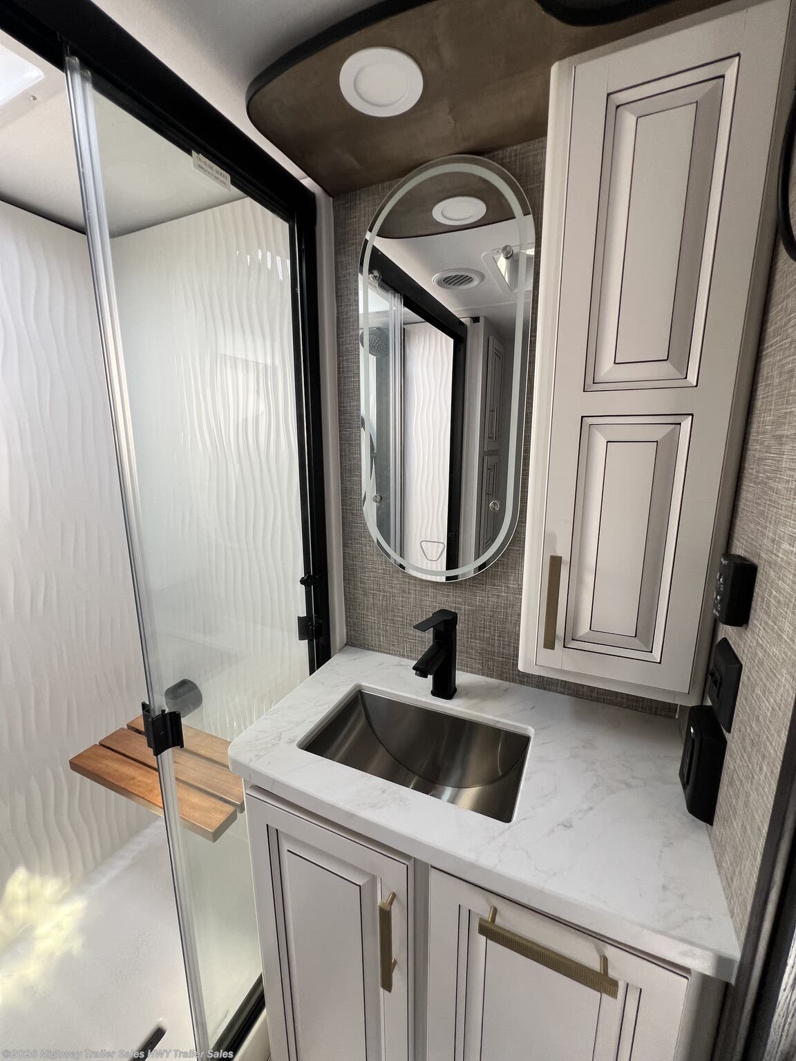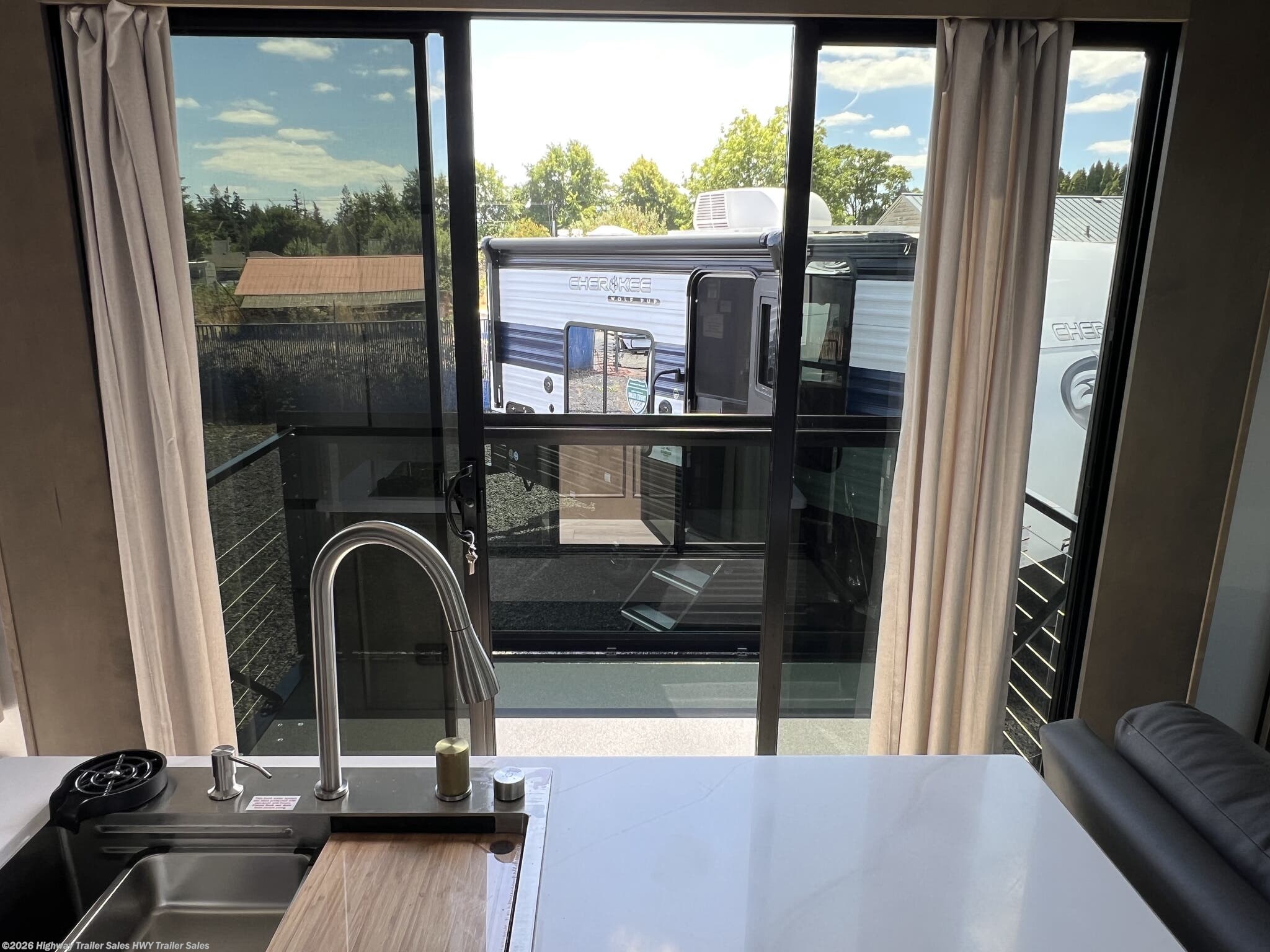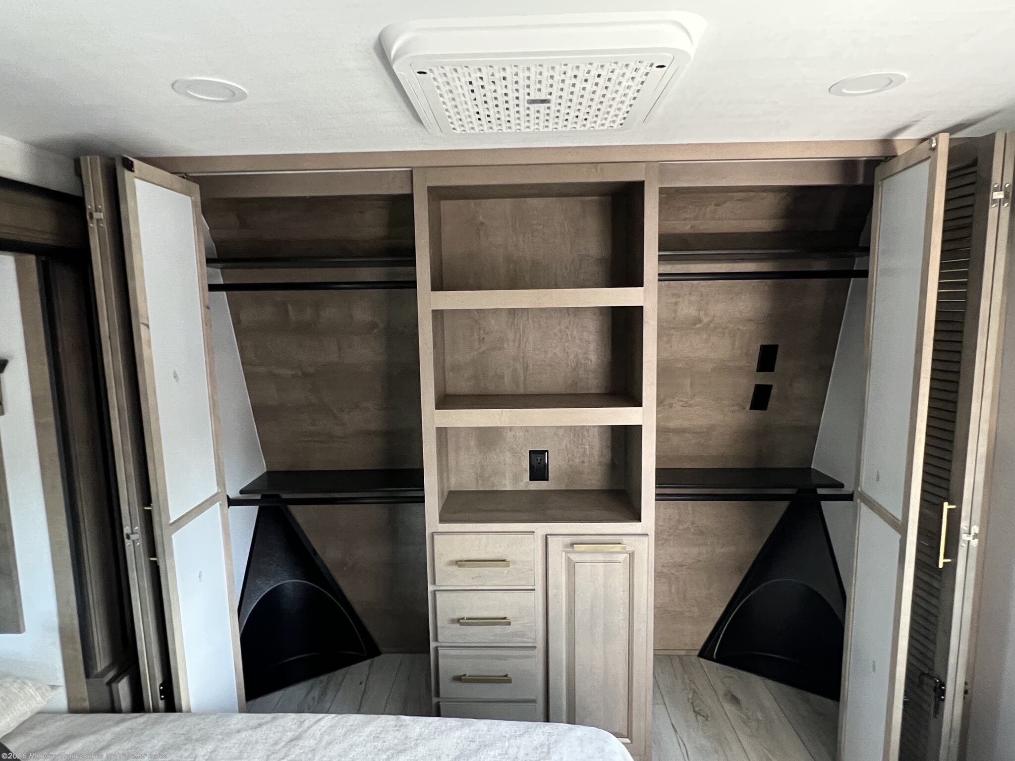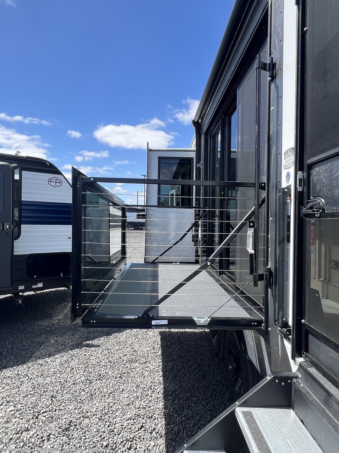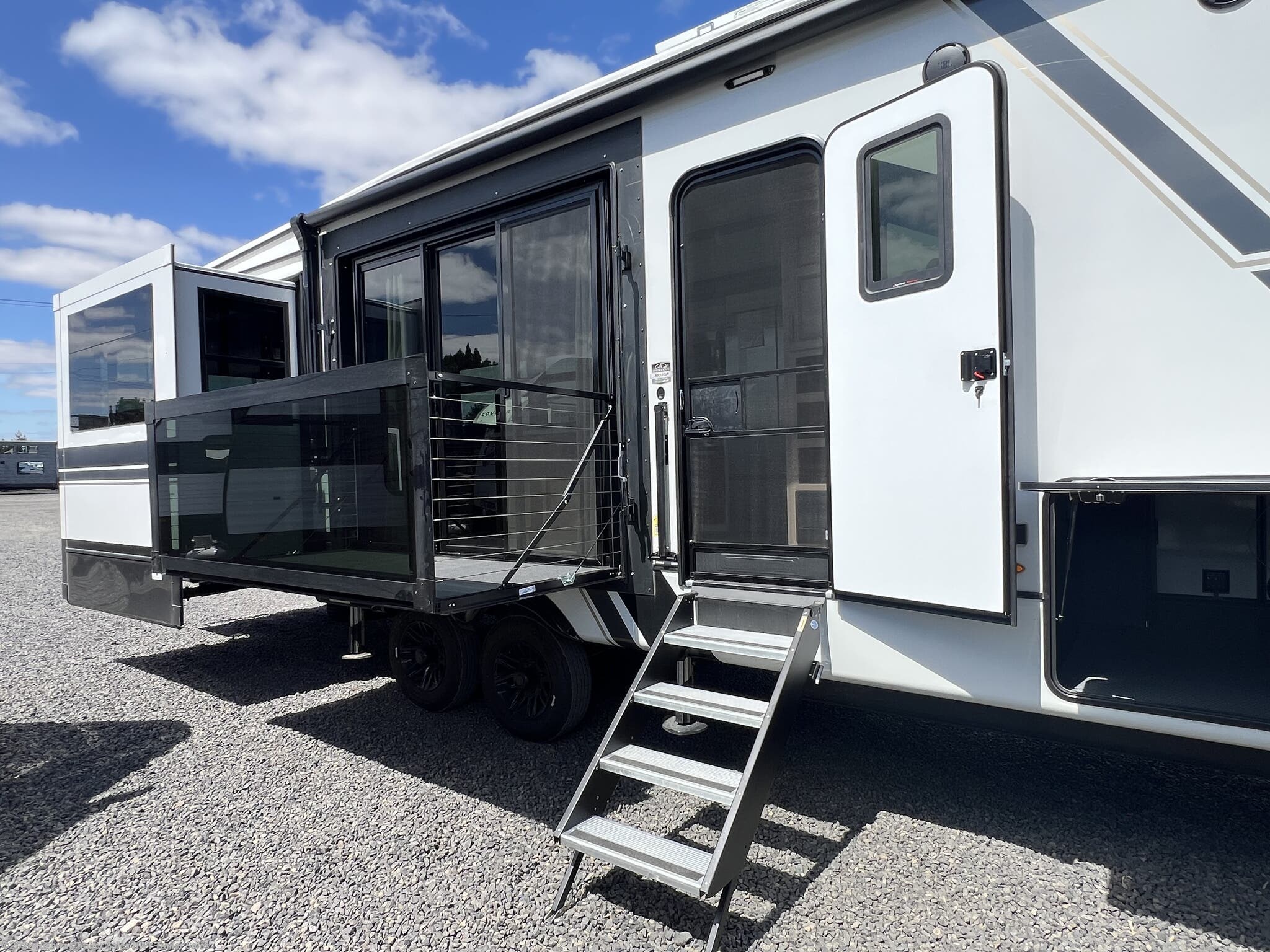 Alloy Wheels, Aluminum Entrance Steps, Automatic Leveling Jacks, Black Tank Flush, Detachable Power Cord, Enclosed Underbelly, Exterior Speakers, External Shower, Fiberglass Sidewalls, Heated Underbelly, Hitch, Ladder, Pass Thru Storage, Power Awning, Power Roof Vent, Powered Landing Legs, Roof Vent, Screen Door, Second Roof A/C, Skylight, Slam Latch Baggage Doors, Slideout, Spare Tire Kit, Upgraded Insulation Package -
