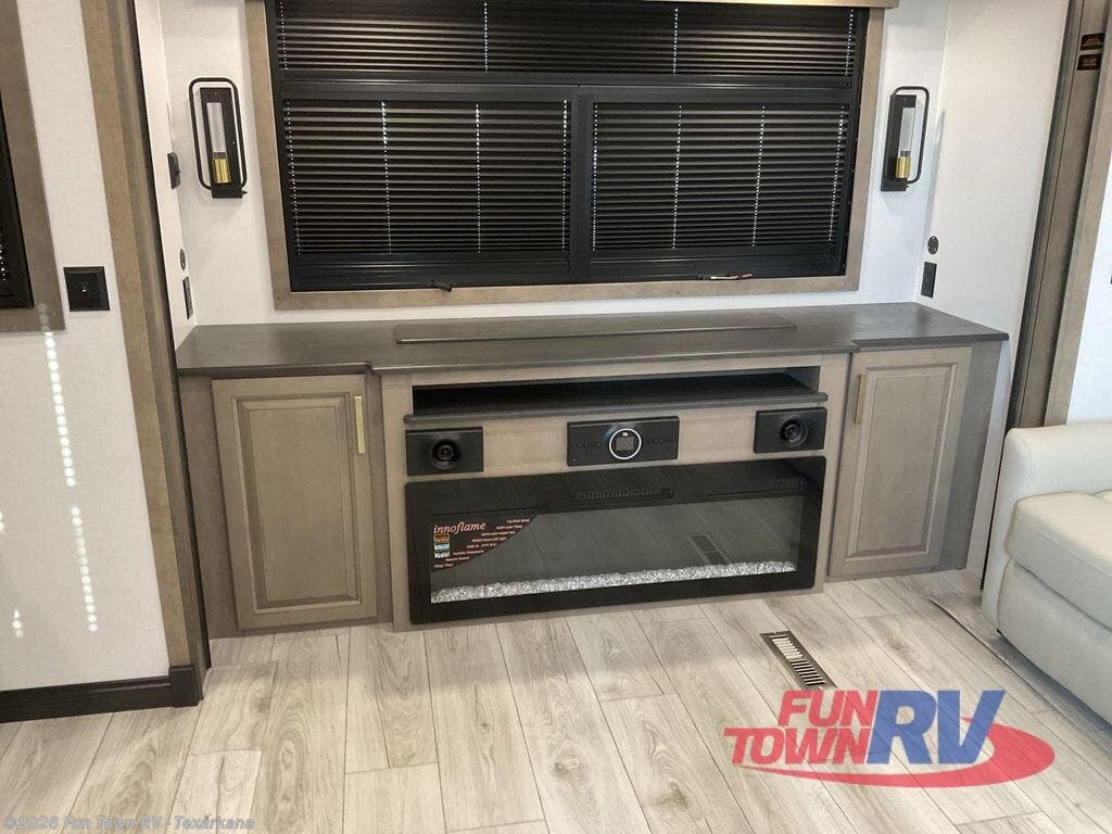 Luxury abounds throughout this fifth wheel starting in the centrally located kitchen featuring an L-shaped counter, a pull down storage pantry, a 24" range with an overhead convection microwave, and an 18 cu. ft. residential refrigerator with ice an maker. Just up the steps to the right of the entry, you will find a spacious bathroom featuring a 48" x 30" fiberglass shower with a seat, decorative glass enclosure, linen cabinet, and skylight above it for more natural lighting. Sleep like a baby in the front private bedroom on the king bed slide with storage underneath, and keep your clothes looking their best with the front closets. The rear entertainment living area offers true relaxation with L-shaped seating including a hide-a-bed sofa along the roadside, and powered theater seating facing the entertainment center with a 5,000 BTU decorative fireplace heater and Smart TV to watch your favorite movies! And don't overlook the best part, the powered side patio to entertain guests!