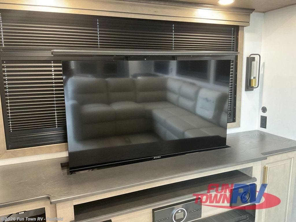 Luxury abounds throughout this fifth wheel starting in the centrally located kitchen featuring an L-shaped counter, a pull down storage pantry, a 24" range with an overhead convection microwave, and an 18 cu. ft. residential refrigerator with ice an maker. Just up the steps to the right of the entry, you will find a spacious bathroom featuring a 48" x 30" fiberglass shower with a seat, decorative glass enclosure, linen cabinet, and skylight above it for more natural lighting. Sleep like a baby in the front private bedroom on the king bed slide with storage underneath, and keep your clothes looking their best with the front closets. The rear entertainment living area offers true relaxation with L-shaped seating including a hide-a-bed sofa along the roadside, and powered theater seating facing the entertainment center with a 5,000 BTU decorative fireplace heater and Smart TV to watch your favorite movies! And don't overlook the best part, the powered side patio to entertain guests!