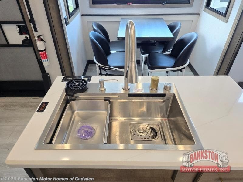 Life will be easier at the campground in this fifth wheel with a bath and a half! The full rear bathroom has a 48" x 30" fiberglass shower with a seat and skylight above, a linen closet to keep your towels close, a dual sink vanity for two to get ready at once, and a barn door to close off the master suite. The bedroom also has a king bed slide with storage underneath across from a dresser with a 32" Smart TV and wardrobe, as well as a large closet with stackable washer and dryer prep. The chef can prepare their best meals with the kitchen island, convection microwave and 24" range, plus there is a pantry/buffet and a pivot dinette to enjoy your meals at. The front living area will have you feeling right at home with the front entertainment center that has a telescoping 50" Smart TV, a 5,000 BTU decorative fireplace heater, and storage on either side. There is also opposing hide-a-bed sofa slides for extra sleeping spaces and power theater seating for even more comfort!