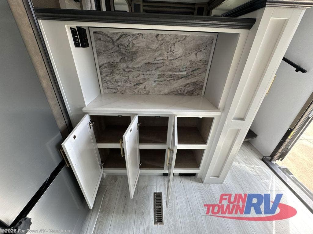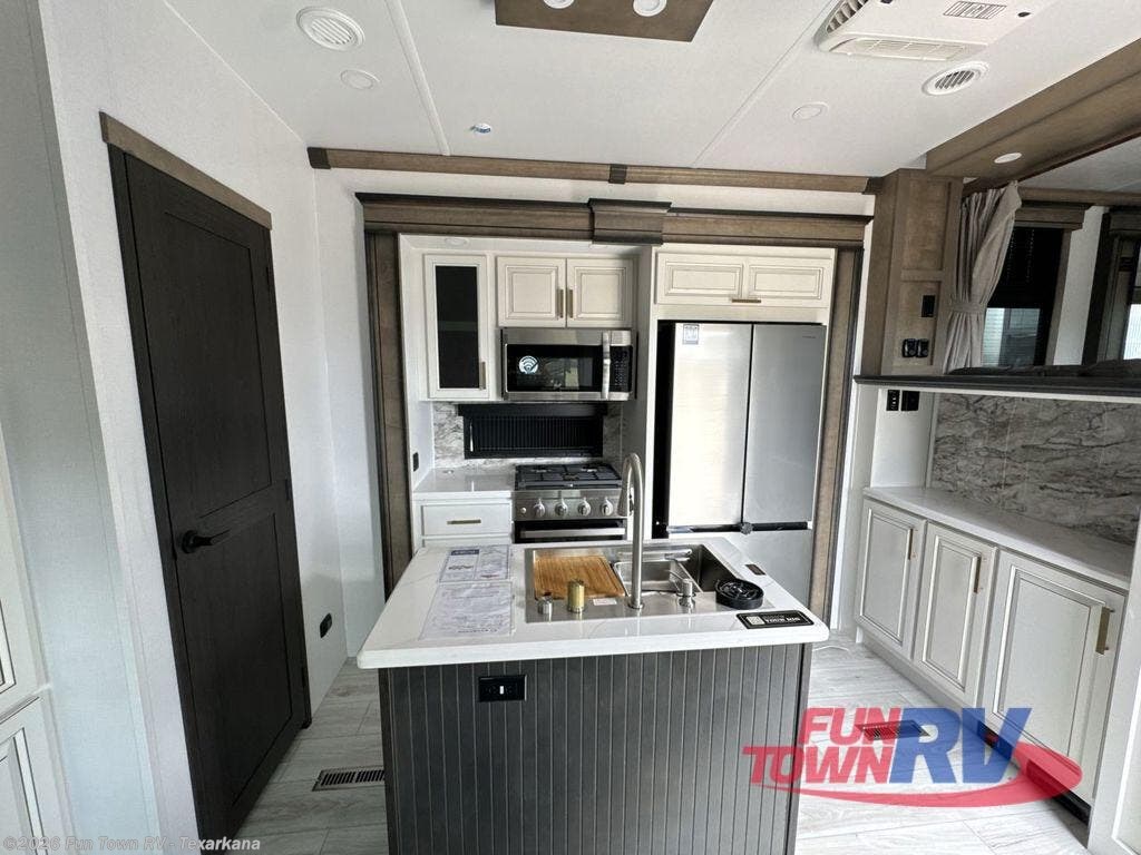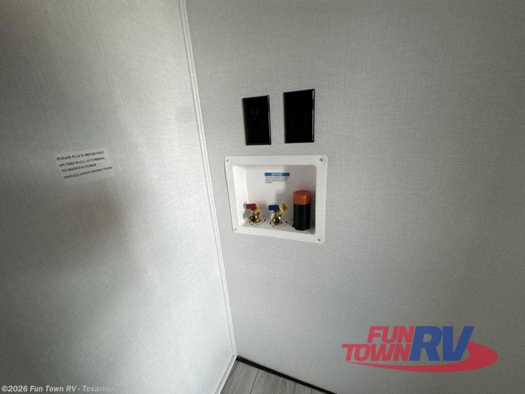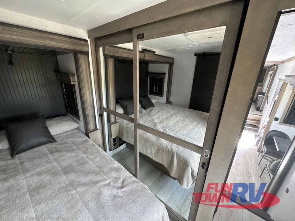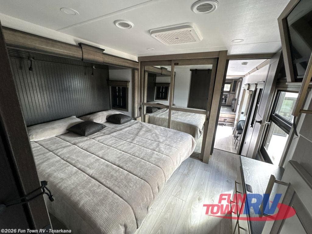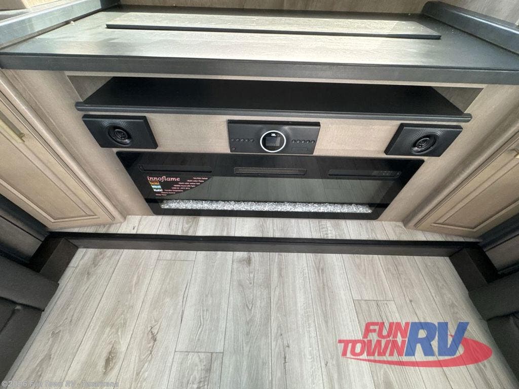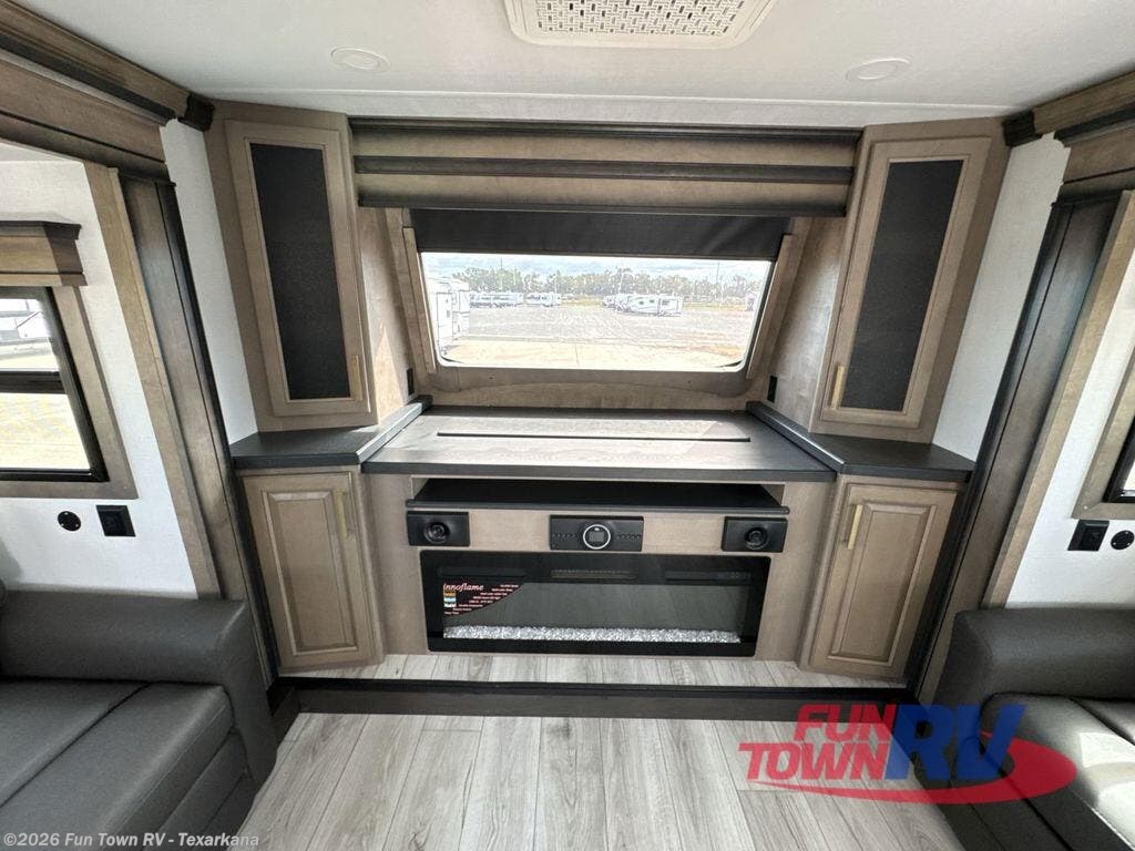 Life will be easier at the campground in this fifth wheel with a bath and a half! The full rear bathroom has a 48" x 30" fiberglass shower with a seat and skylight above, a linen closet to keep your towels close, a dual sink vanity for two to get ready at once, and a barn door to close off the master suite. The bedroom also has a king bed slide with storage underneath across from a dresser with a 32" Smart TV and wardrobe, as well as a large closet with stackable washer and dryer prep. The chef can prepare their best meals with the kitchen island, convection microwave and 24" range, plus there is a pantry/buffet and a pivot dinette to enjoy your meals at. The front living area will have you feeling right at home with the front entertainment center that has a telescoping 50" Smart TV, a 5,000 BTU decorative fireplace heater, and storage on either side. There is also opposing hide-a-bed sofa slides for extra sleeping spaces and power theater seating for even more comfort!
