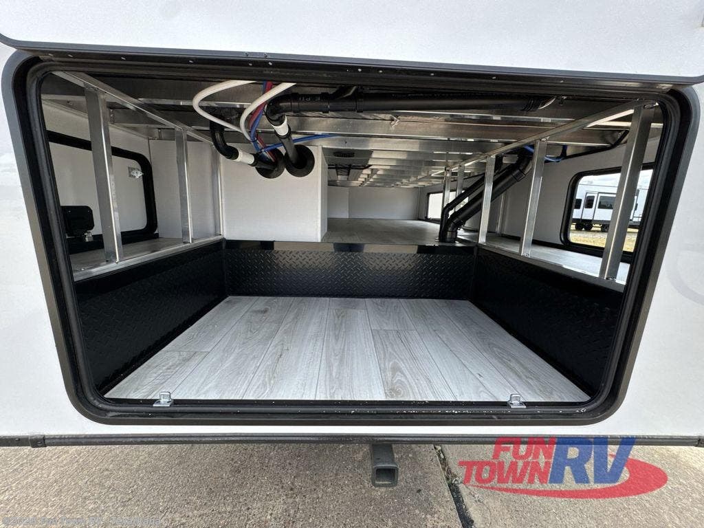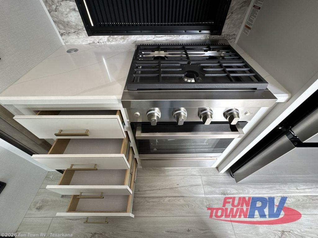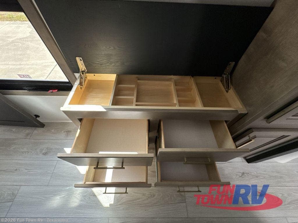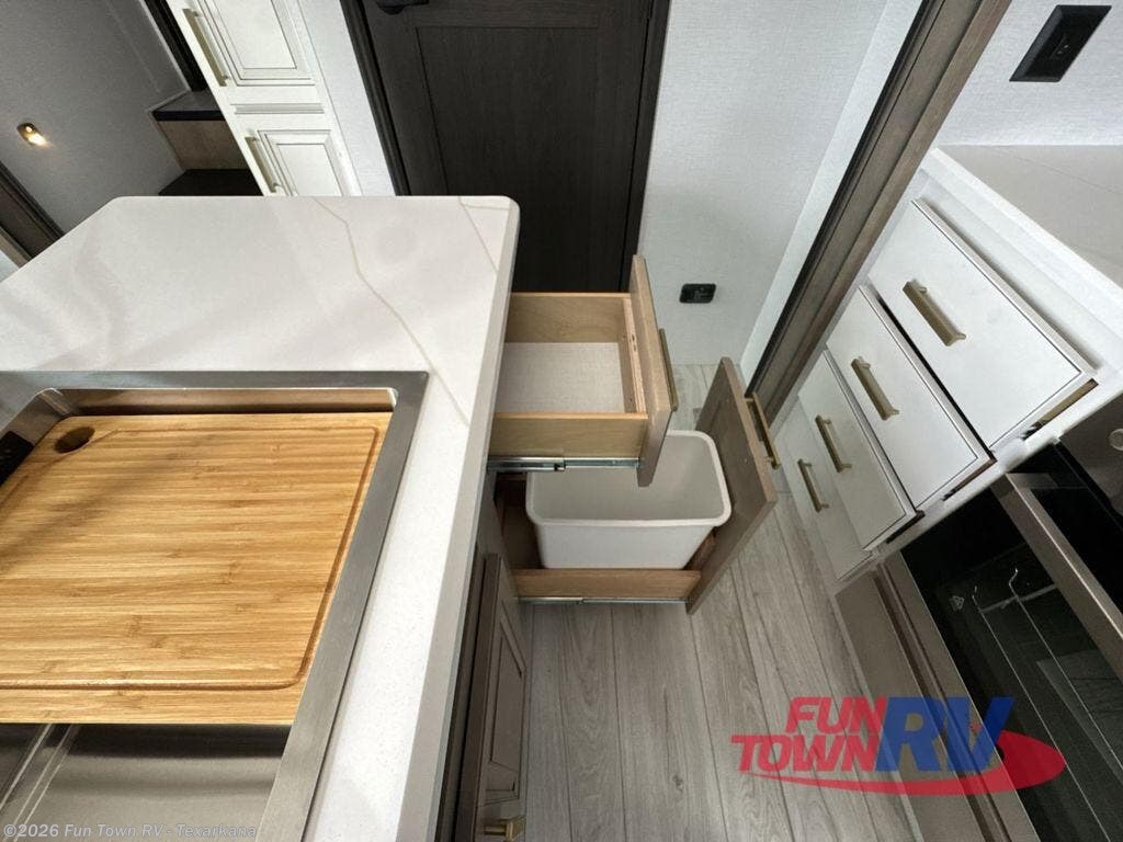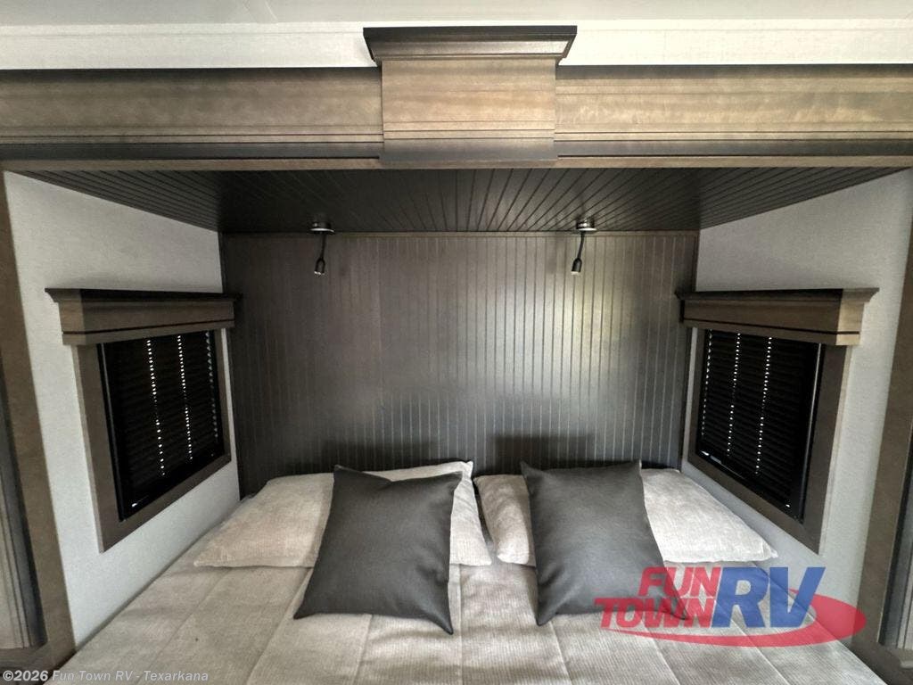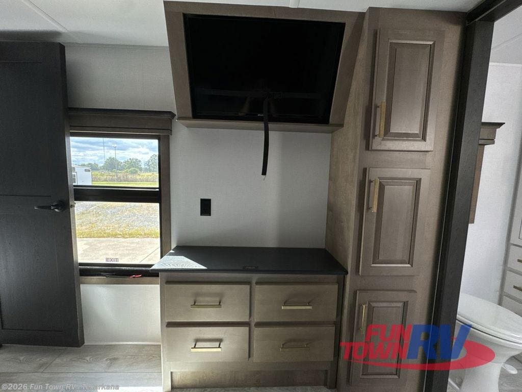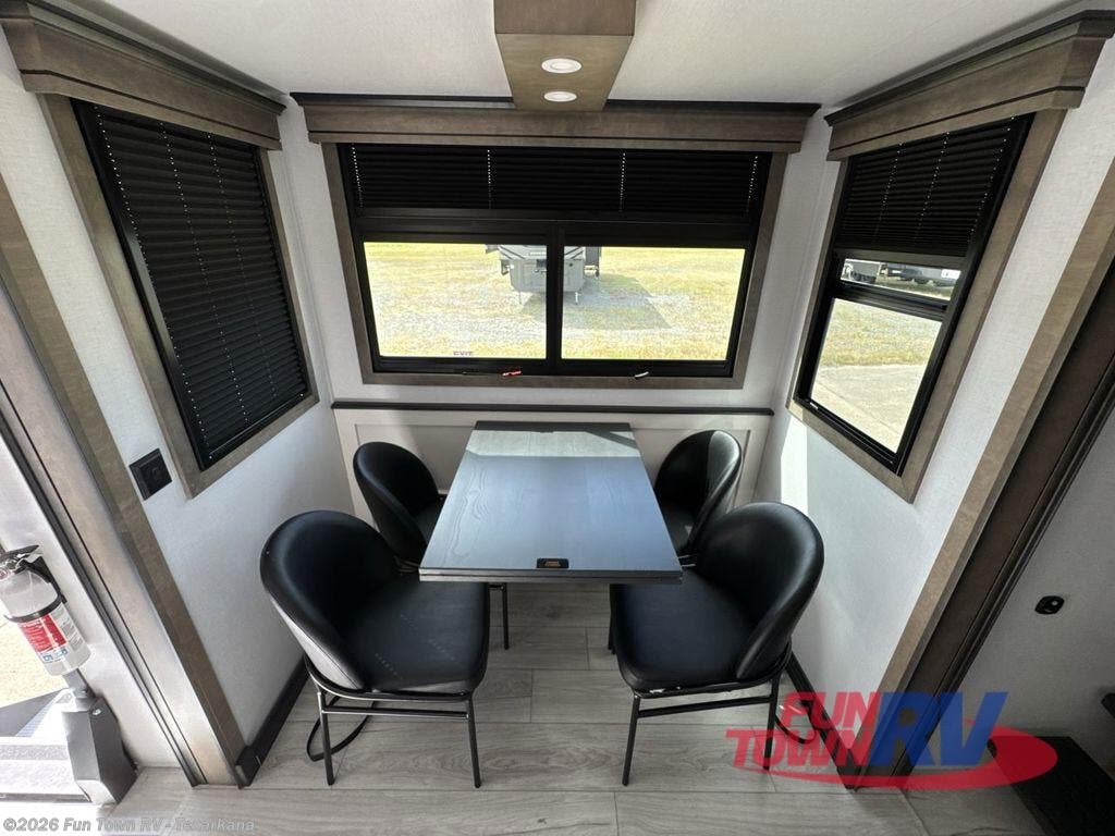 Life will be easier at the campground in this fifth wheel with a bath and a half! The full rear bathroom has a 48" x 30" fiberglass shower with a seat and skylight above, a linen closet to keep your towels close, a dual sink vanity for two to get ready at once, and a barn door to close off the master suite. The bedroom also has a king bed slide with storage underneath across from a dresser with a 32" Smart TV and wardrobe, as well as a large closet with stackable washer and dryer prep. The chef can prepare their best meals with the kitchen island, convection microwave and 24" range, plus there is a pantry/buffet and a pivot dinette to enjoy your meals at. The front living area will have you feeling right at home with the front entertainment center that has a telescoping 50" Smart TV, a 5,000 BTU decorative fireplace heater, and storage on either side. There is also opposing hide-a-bed sofa slides for extra sleeping spaces and power theater seating for even more comfort!