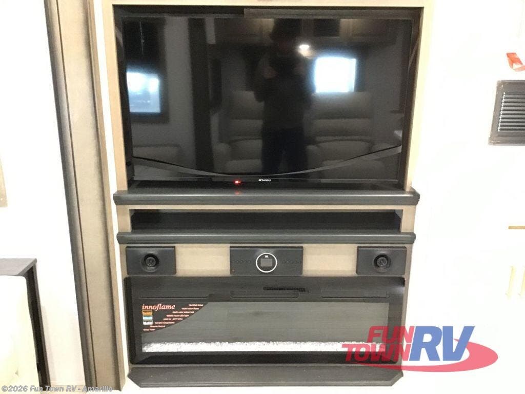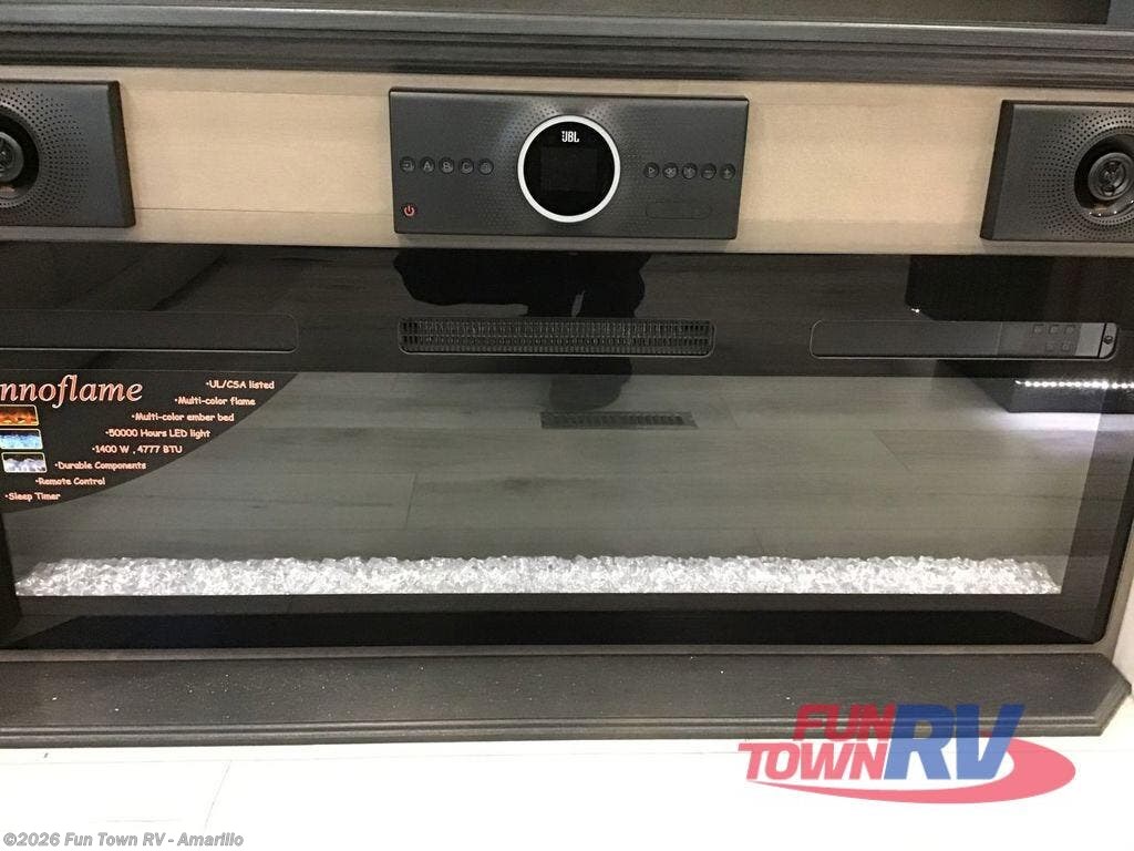 Enjoy a home away from home with this fifth wheel! The front private bedroom has a king bed slide with storage underneath across from a 32" Smart HDTV with drawers below it, a large front closet, and a sliding door to close it all off. Freshen up each morning in the full bathroom with the 48" x 30" fiberglass shower with a seat and skylight above for more natural lighting as you get ready at the dual sink vanity. The kitchen has everything you need to prepare your best meals including extra countertop space on the kitchen island and even a closet with washer/dryer prep so you can quickly grab a clean dish towel. Enjoy your meals at the pivot dinette and then relax on the rear hide-a-bed sofa or the residential power recliners across from the entertainment center with a 5,000 BTU decorative fireplace heater. There is even a 50" Smart HDTV to watch your favorite movies!