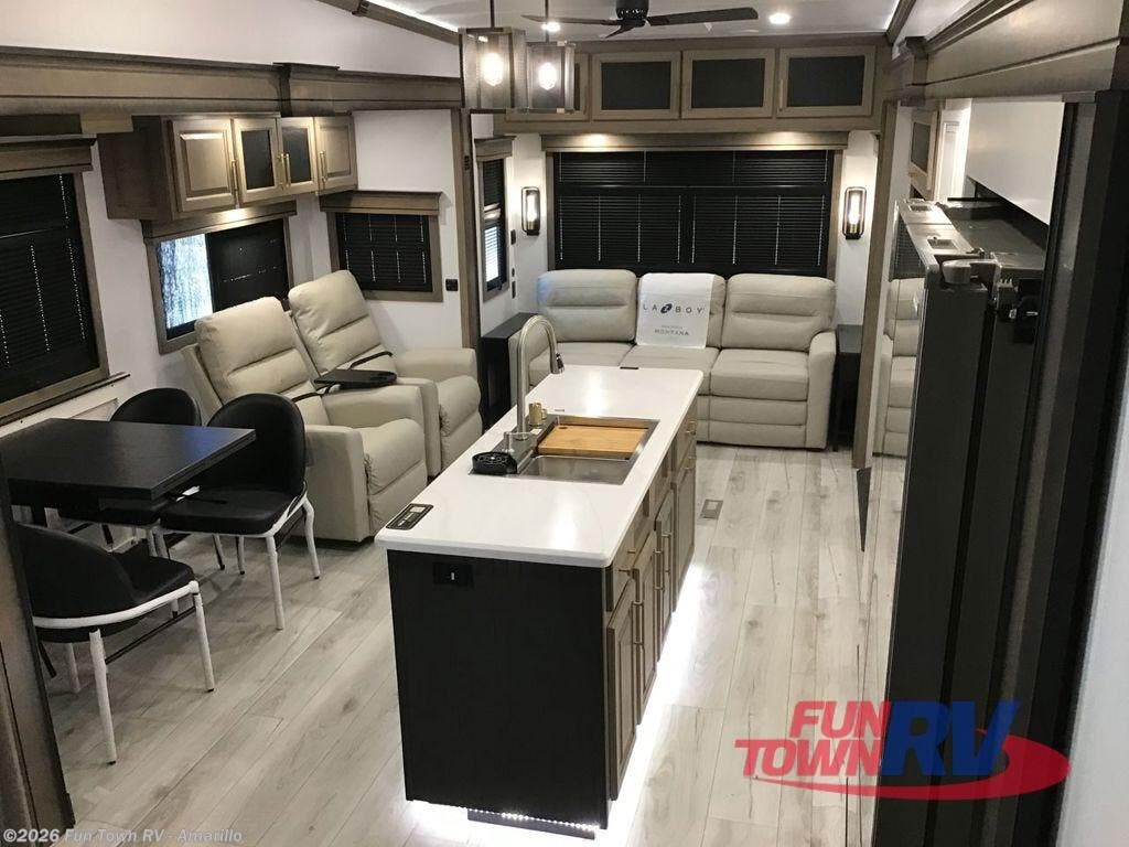 Enjoy luxury, innovation, and the outdoors in any one of Montana's finest fifth wheels. Each set the standard with exceptional features, and exciting factory installed options to provide you a great home on the road. Keystone's 12" I-beam chassis with z-frame technology provides a strong and durable foundation to your fifth wheel, and the four season living package will help extend your camping season. A few other construction features you will appreciate include a MORryde CRE3000 suspension, a fully walkable roof with an alpha seamless TPO membrane system, and 4k square frameless tinted safety glass windows. Each feature stylish interiors with two decor choices paired with beautiful hardwood cabinetry, Beauflor vinyl flooring throughout, central vacuum, plus a La-Z-Boy furniture package for all-around comfort!