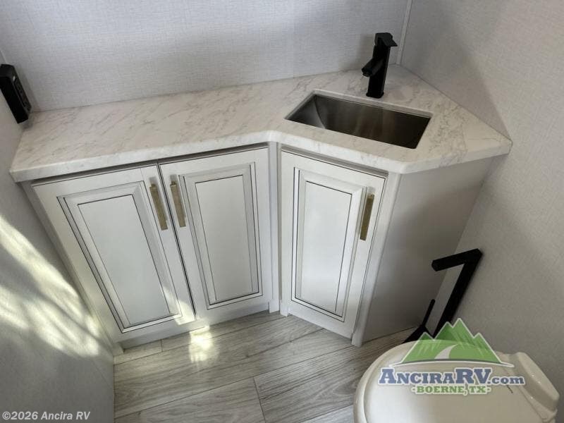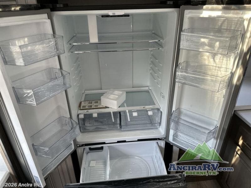 The perfect RV when you like to take "home"' with you when you travel! This Montana fifth wheel gives you the space you want and it feels like home with plenty of features to love and keep you comfortable when you are out enjoying your adventures. Five slides in total give each space plenty of room, the raised rear kitchen has everything you need to cook up meals and snacks just like at home. An 18 cu. ft. residential refrigerator with an ice maker, convection microwave oven and large sink, plus pantry space will make any chef happy. The mid-coach space just inside the door features a living room and half bath for convenience. There is also a pivot dinette within the roadside slide. Step up in front through a sliding barn door to a double slide space with a king bed and dresser. A second sliding door leads into the front spacious master bath featuring dual sinks, a 48" x 30" shower, and a large walk-in wardrobe with washer and dryer prep!