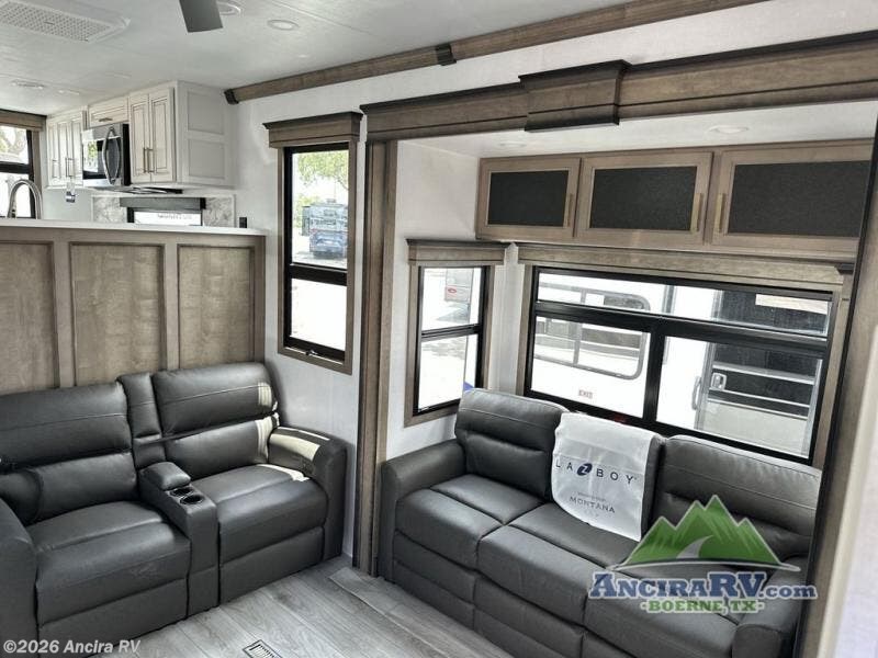 Enjoy luxury, innovation, and the outdoors in any one of Montana's finest fifth wheels. Each set the standard with exceptional features, and exciting factory installed options to provide you a great home on the road. Keystone's 12" I-beam chassis with z-frame technology provides a strong and durable foundation to your fifth wheel, and the four season living package will help extend your camping season. A few other construction features you will appreciate include a MORryde CRE3000 suspension, a fully walkable roof with an alpha seamless TPO membrane system, and 4k square frameless tinted safety glass windows. Each feature stylish interiors with two decor choices paired with beautiful hardwood cabinetry, Beauflor vinyl flooring throughout, central vacuum, plus a La-Z-Boy furniture package for all-around comfort!