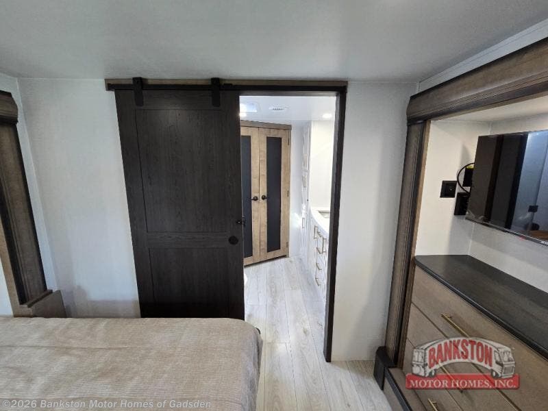 The perfect RV when you like to take "home"' with you when you travel! This Montana fifth wheel gives you the space you want and it feels like home with plenty of features to love and keep you comfortable when you are out enjoying your adventures. Five slides in total give each space plenty of room, the raised rear kitchen has everything you need to cook up meals and snacks just like at home. An 18 cu. ft. residential refrigerator with an ice maker, convection microwave oven and large sink, plus pantry space will make any chef happy. The mid-coach space just inside the door features a living room and half bath for convenience. There is also a pivot dinette within the roadside slide. Step up in front through a sliding barn door to a double slide space with a king bed and dresser. A second sliding door leads into the front spacious master bath featuring dual sinks, a 48" x 30" shower, and a large walk-in wardrobe with washer and dryer prep!