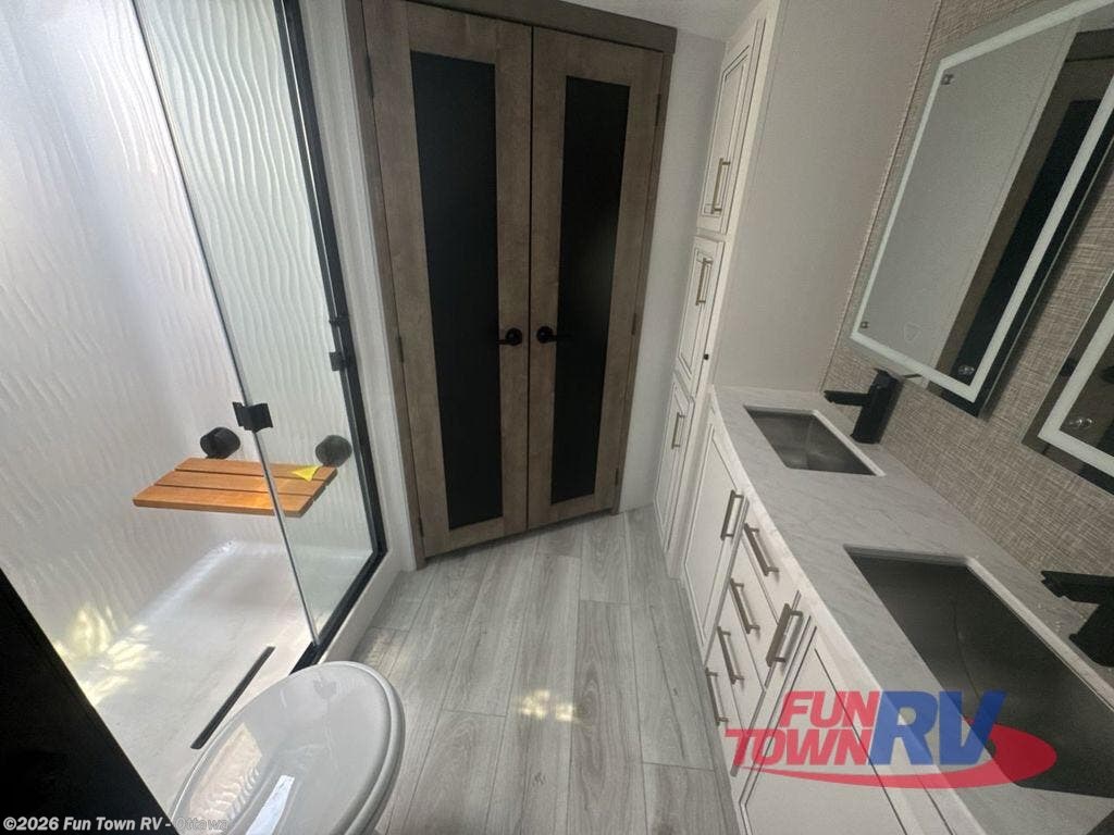 The perfect RV when you like to take "home"' with you when you travel! This Montana fifth wheel gives you the space you want and it feels like home with plenty of features to love and keep you comfortable when you are out enjoying your adventures. Five slides in total give each space plenty of room, the raised rear kitchen has everything you need to cook up meals and snacks just like at home. An 18 cu. ft. residential refrigerator with an ice maker, convection microwave oven and large sink, plus pantry space will make any chef happy. The mid-coach space just inside the door features a living room and half bath for convenience. There is also a pivot dinette within the roadside slide. Step up in front through a sliding barn door to a double slide space with a king bed and dresser. A second sliding door leads into the front spacious master bath featuring dual sinks, a 48" x 30" shower, and a large walk-in wardrobe with washer and dryer prep!