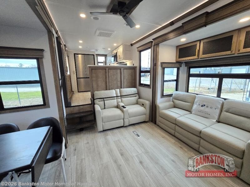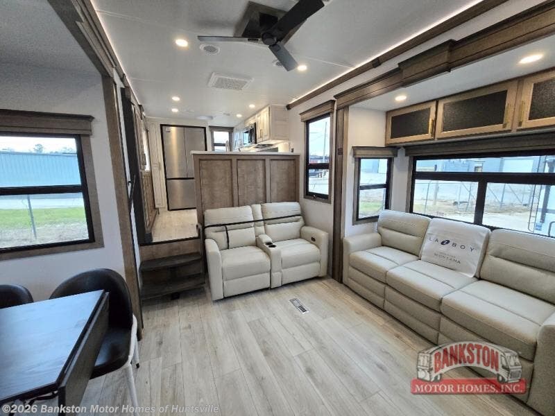 Enjoy luxury, innovation, and the outdoors in any one of Montana's finest fifth wheels. Each set the standard with exceptional features, and exciting factory installed options to provide you a great home on the road. Keystone's 12" I-beam chassis with z-frame technology provides a strong and durable foundation to your fifth wheel, and the four season living package will help extend your camping season. A few other construction features you will appreciate include a MORryde CRE3000 suspension, a fully walkable roof with an alpha seamless TPO membrane system, and 4k square frameless tinted safety glass windows. Each feature stylish interiors with two decor choices paired with beautiful hardwood cabinetry, Beauflor vinyl flooring throughout, central vacuum, plus a La-Z-Boy furniture package for all-around comfort!