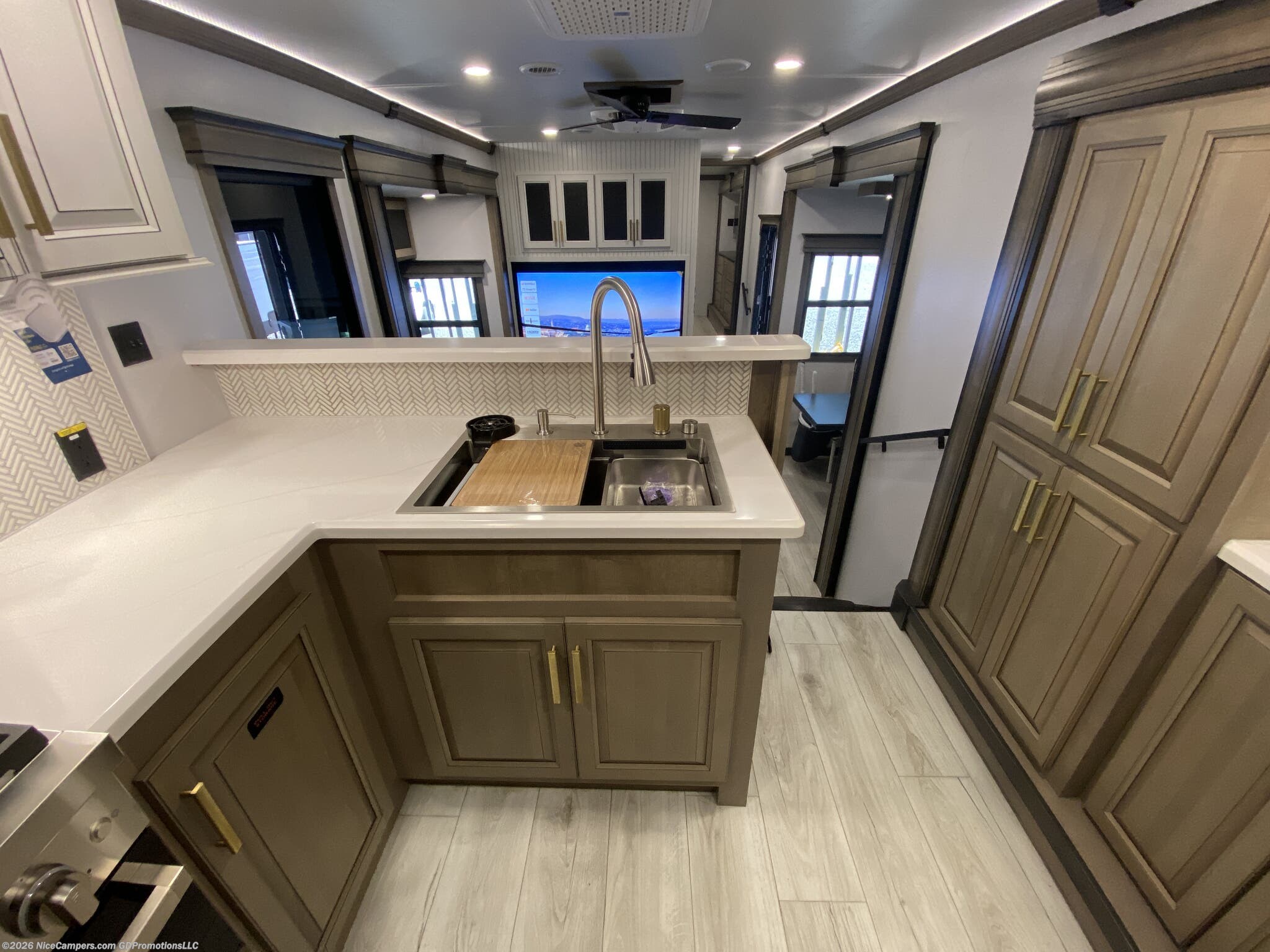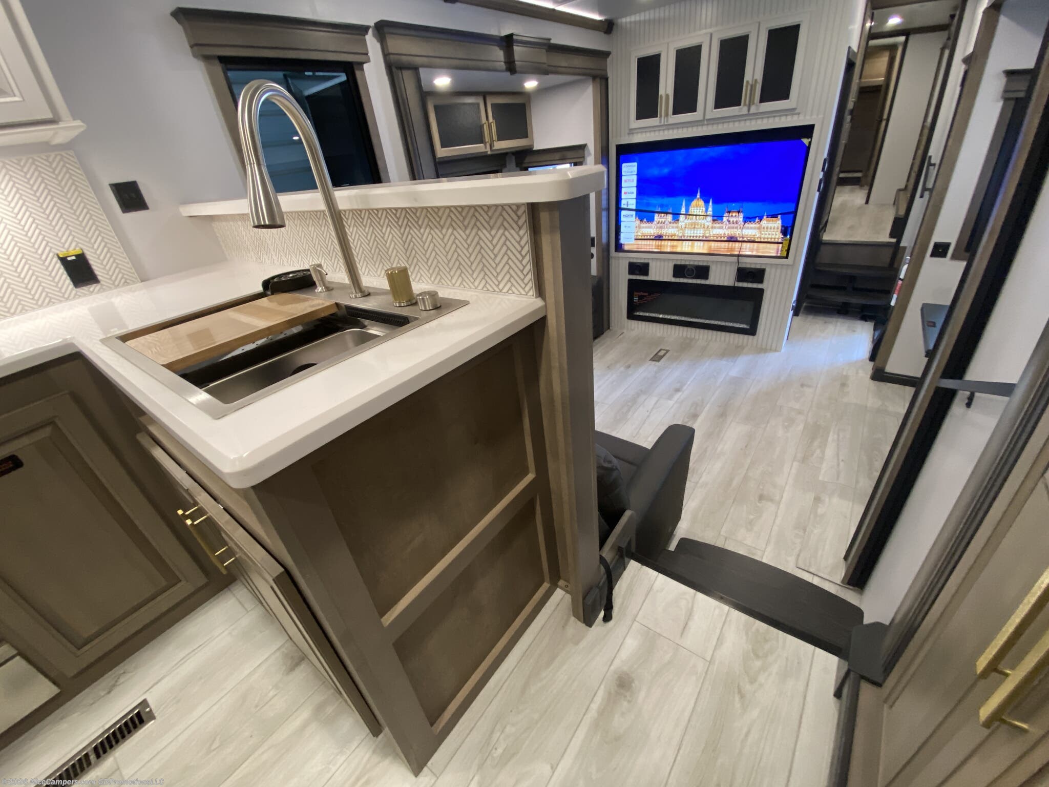 The floorplan 3901RK is crafted to maximize comfort and usability. With five slideouts, the living and kitchen areas open up into a generous, inviting layout. The master suite features a king-size bed for restful nights, while a complete residential-style kitchen—complete with premium appliances—supports family meals and entertaining on the go. A dedicated laundry area and central vacuum keep daily chores convenient, and modern tech elements like a Smart TV and fireplace add a touch of luxury to every stay.