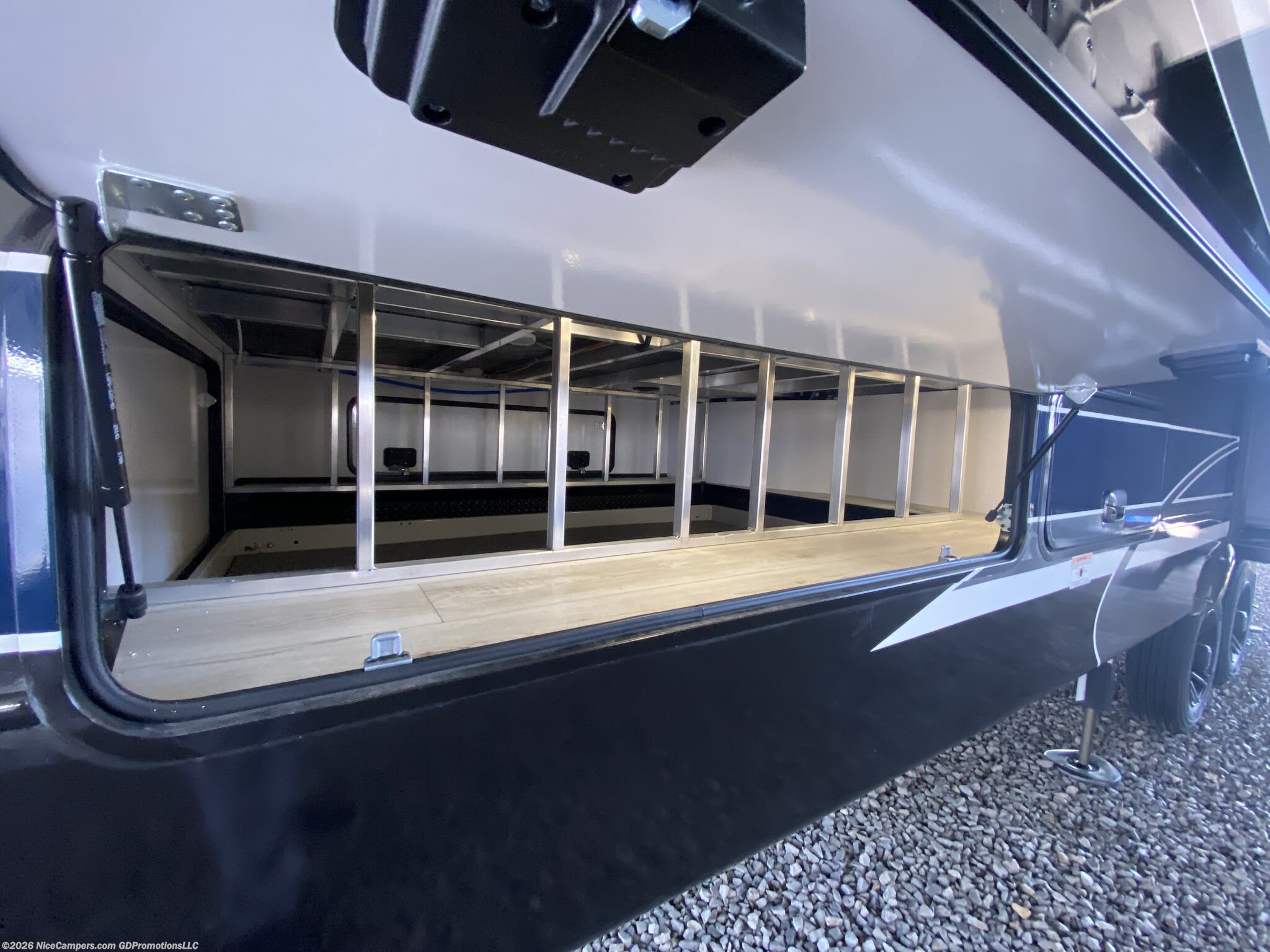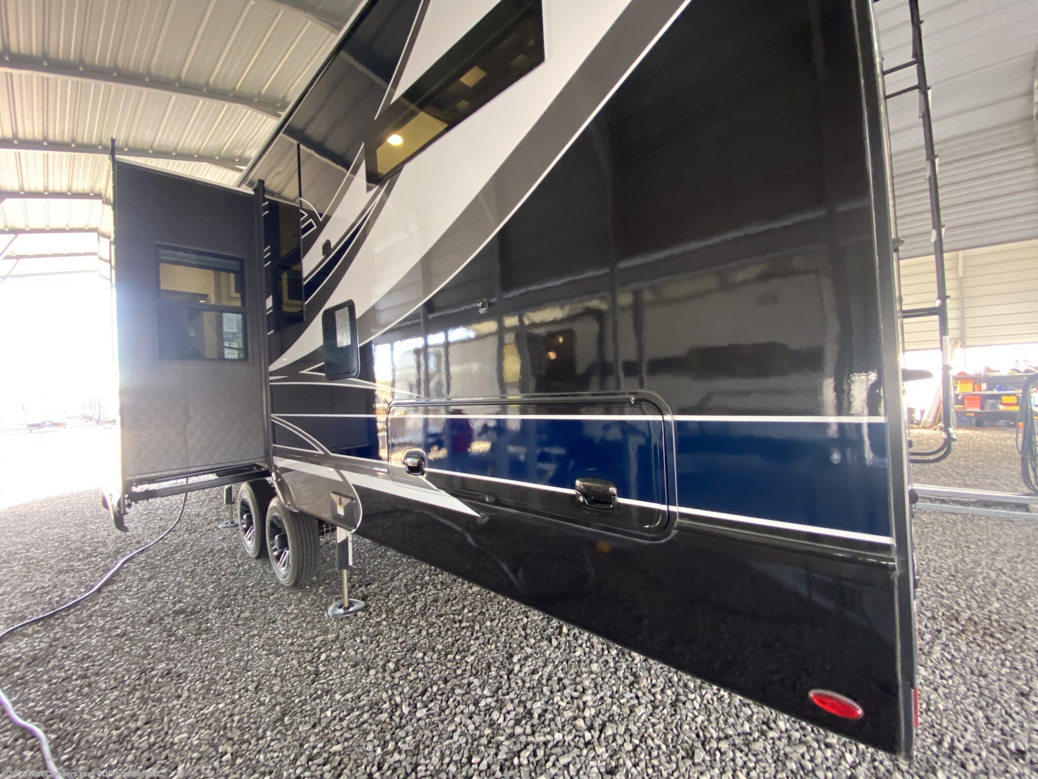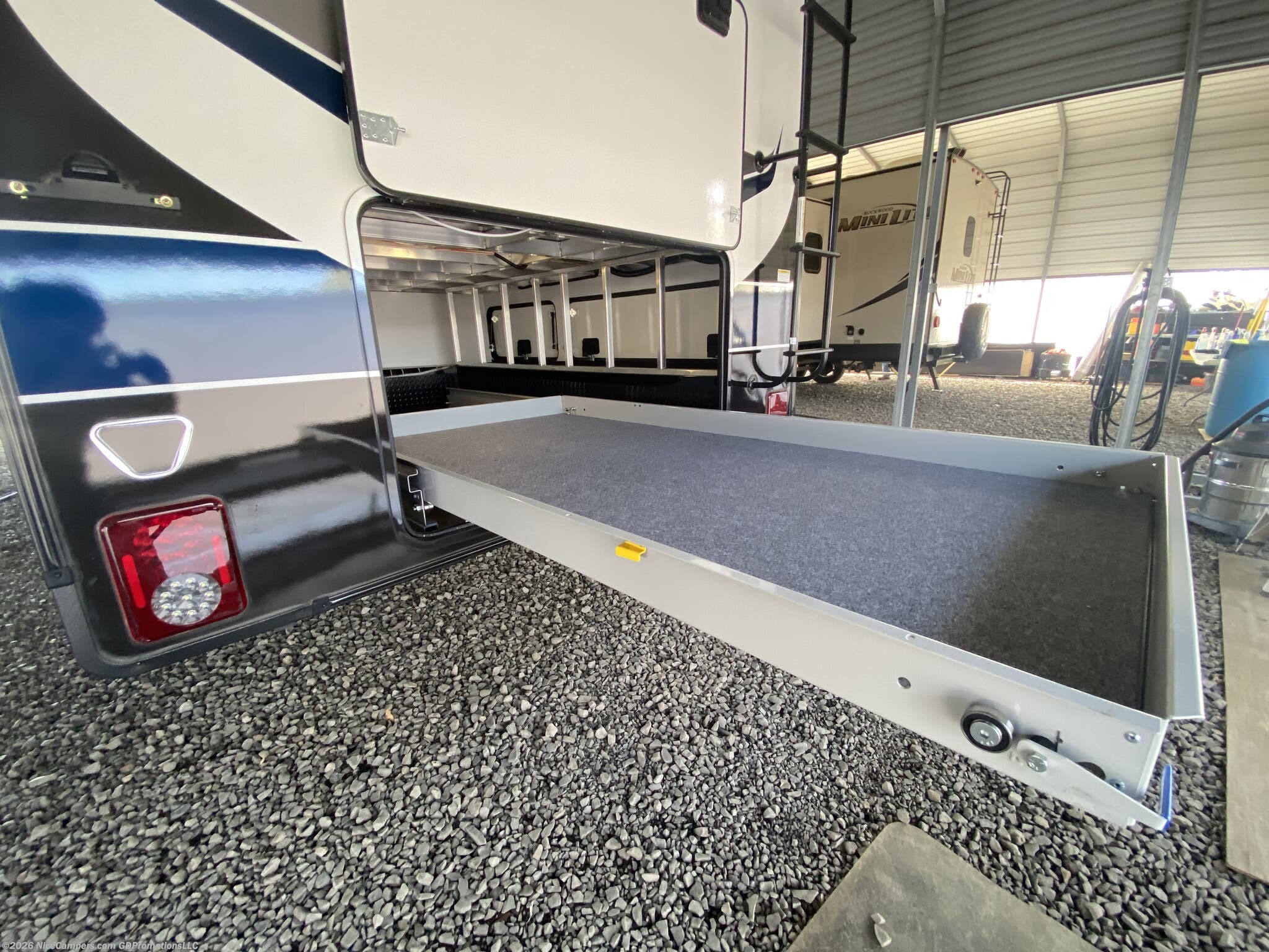 Awning, Black Tank Flush, Detachable, Enclosed Underbelly, Fiberglass Sidewalls, Hitch, Ladder, Skylight, Slideout -