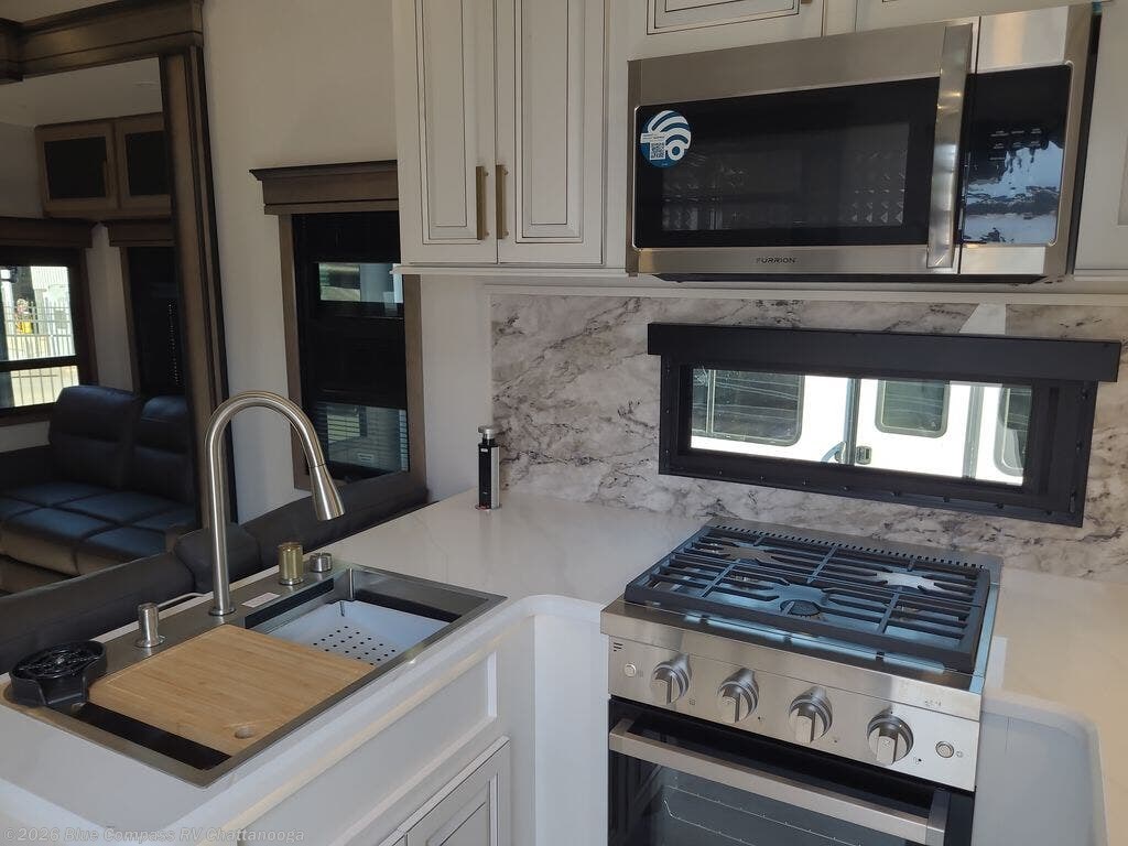 Traveling with friends and family is easier than ever with this fifth wheel in tow! There are two master suites; one for you and one for guests! The front master suite includes a king bed slide out, two closets plus additional storage, plus stackable washer/dryer prep if you want the option to make wash day easier. There is also convenient underbed storage, a dresser with a Smart HD TV, plus a private entrance into the dual entry bath. Head to the rear master suite to find just as much comfort with a queen bed slide out, dual closets and a dresser, plus a full rear bath where the second entry door is located. There is also a loft area above this room with three bunk mats for more campers! The middle kitchen and living area includes many comforts, like the power theater seating across from the 50" Smart TV and hide-a-bed sofa, plus the U-shaped kitchen with ample counter space and a 24" range. You'll also find food storage in the pantry and 18 cu. ft. residential refrigerator with an ice maker, or you can choose the slightly larger optional 20 cu. ft. refrigerator!