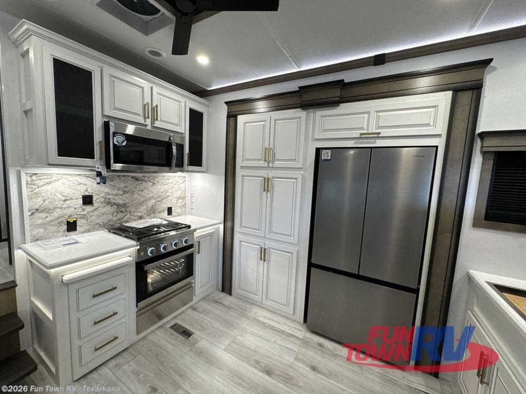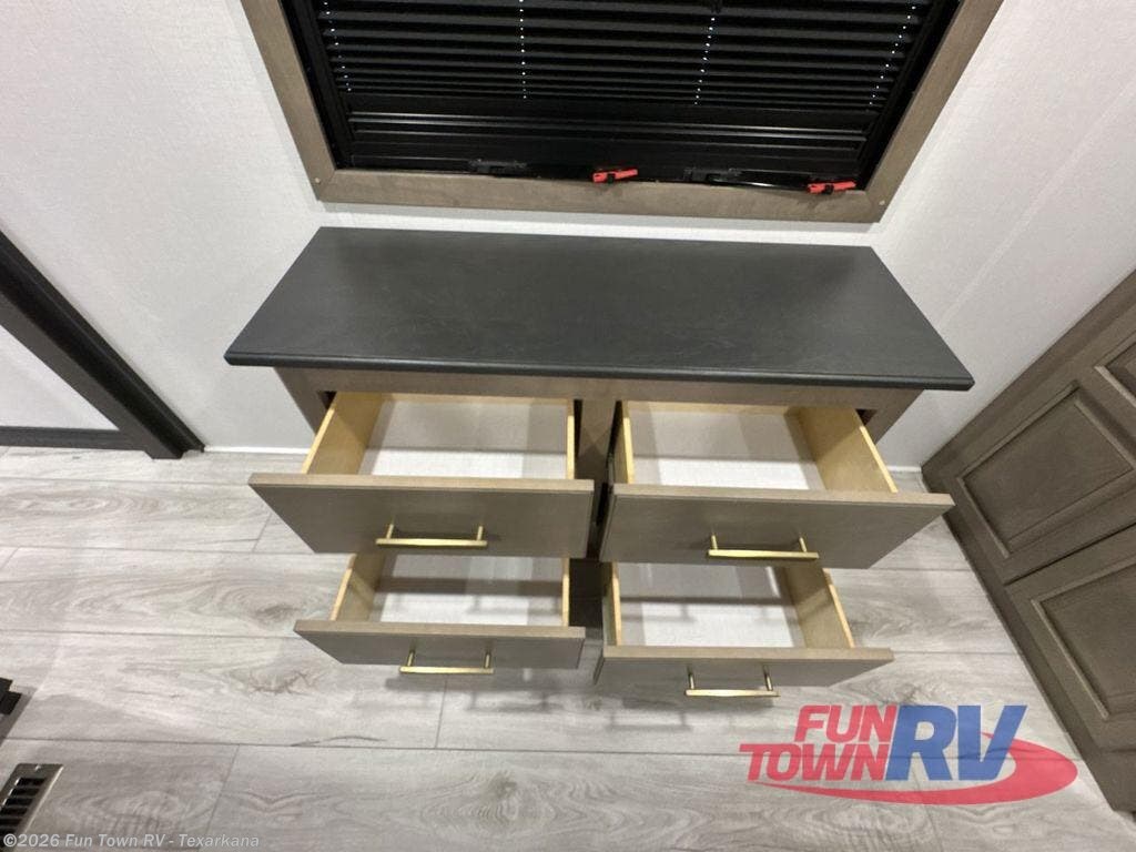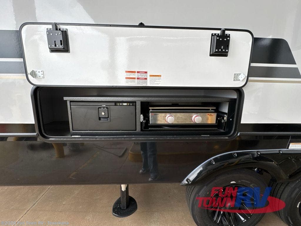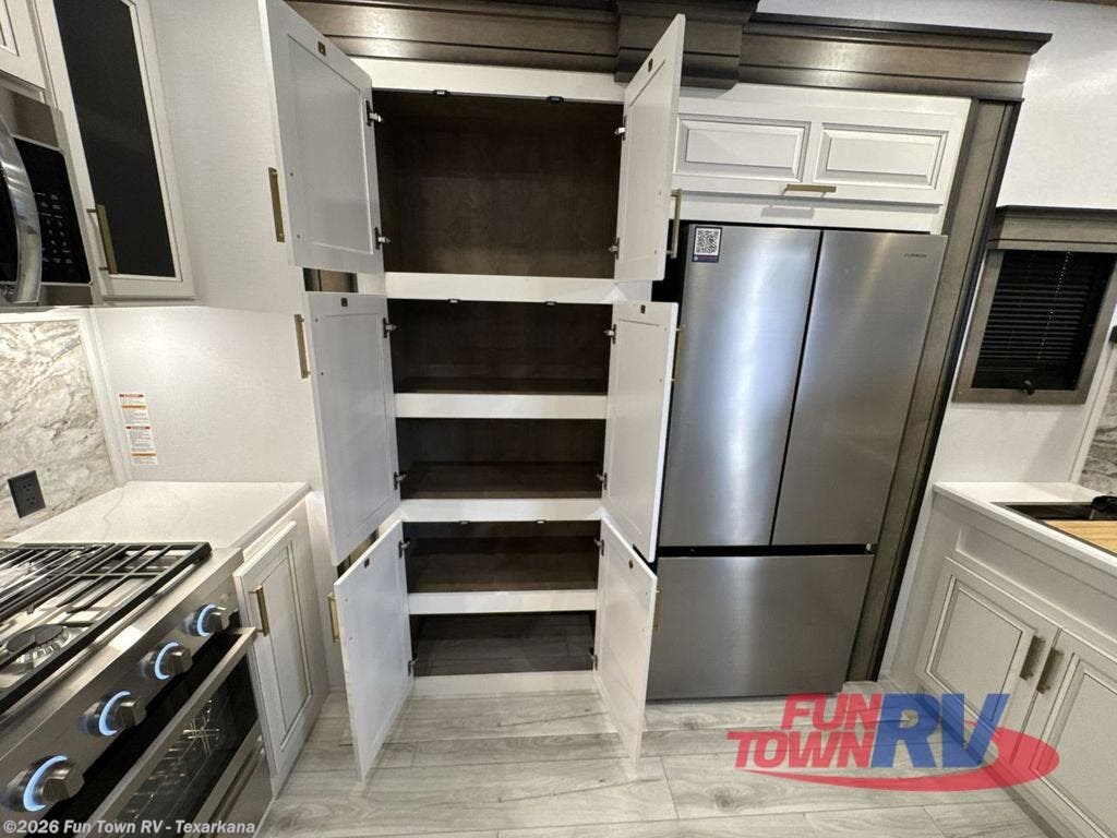 Life will be easier at the campground in this fifth wheel with five slides and an outdoor kitchen! The spacious full bathroom has a 48" x 30" fiberglass shower with a seat and skylight above, a linen closet to keep your towels close, and a stylish sliding door. The bedroom has a king bed slide with storage underneath across from a dresser with a 32" HDTV, as well as a large closet and an additional closet with stackable washer and dryer prep. The chef can prepare their best meals with extra counter space provided by the roll-out counters and the glass top range with a convection microwave, plus there is a pantry and a pivot dinette to enjoy your meals at. The front of this fifth wheel is where it stands out above the rest; there is a spacious living area with two hide-a-bed sofas, power theater seating, and a private front office, complete with a desk, storage, and counter space!