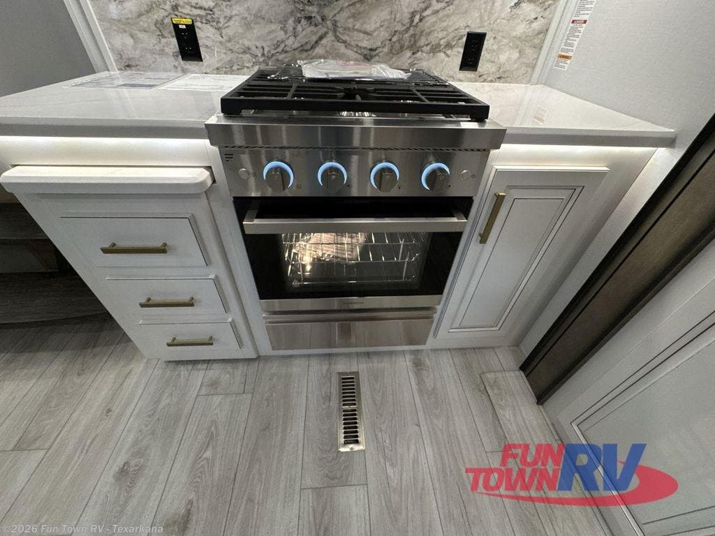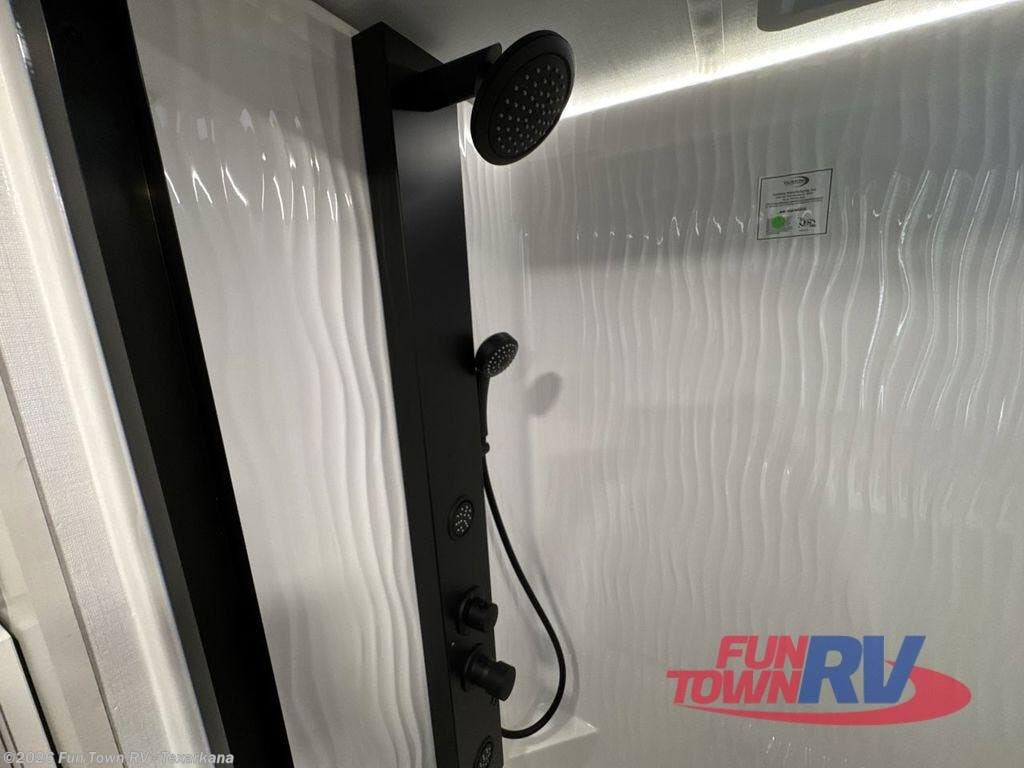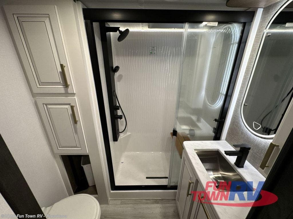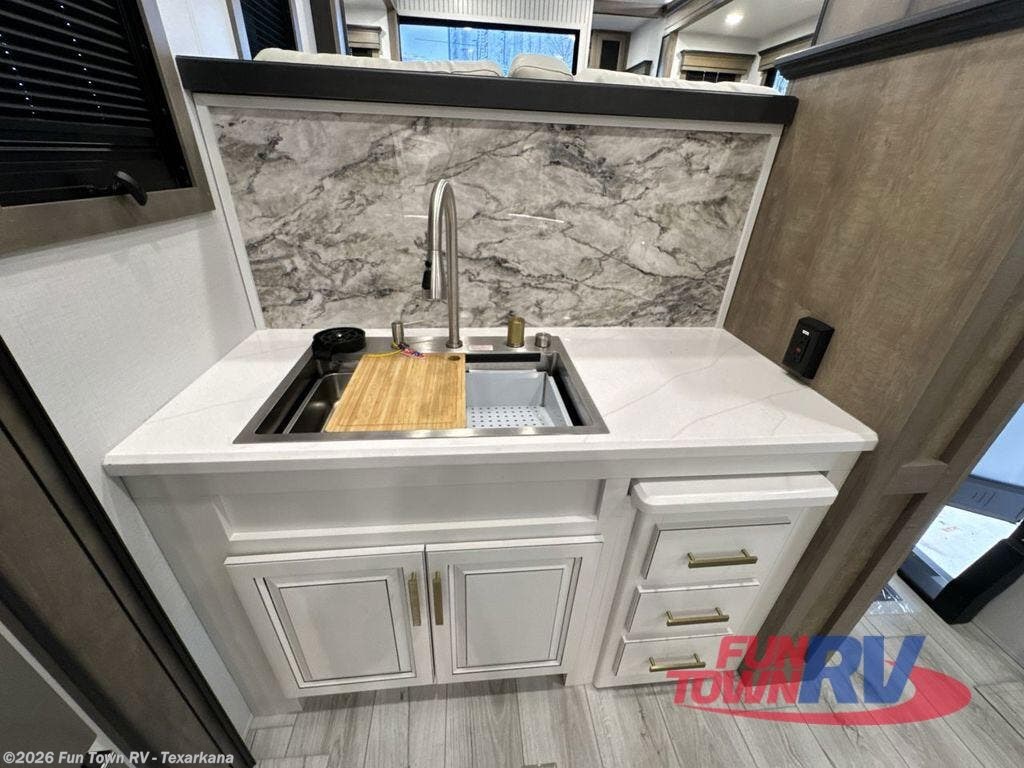 Life will be easier at the campground in this fifth wheel with five slides and an outdoor kitchen! The spacious full bathroom has a 48" x 30" fiberglass shower with a seat and skylight above, a linen closet to keep your towels close, and a stylish sliding door. The bedroom has a king bed slide with storage underneath across from a dresser with a 32" HDTV, as well as a large closet and an additional closet with stackable washer and dryer prep. The chef can prepare their best meals with extra counter space provided by the roll-out counters and the glass top range with a convection microwave, plus there is a pantry and a pivot dinette to enjoy your meals at. The front of this fifth wheel is where it stands out above the rest; there is a spacious living area with two hide-a-bed sofas, power theater seating, and a private front office, complete with a desk, storage, and counter space!