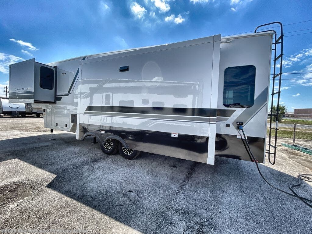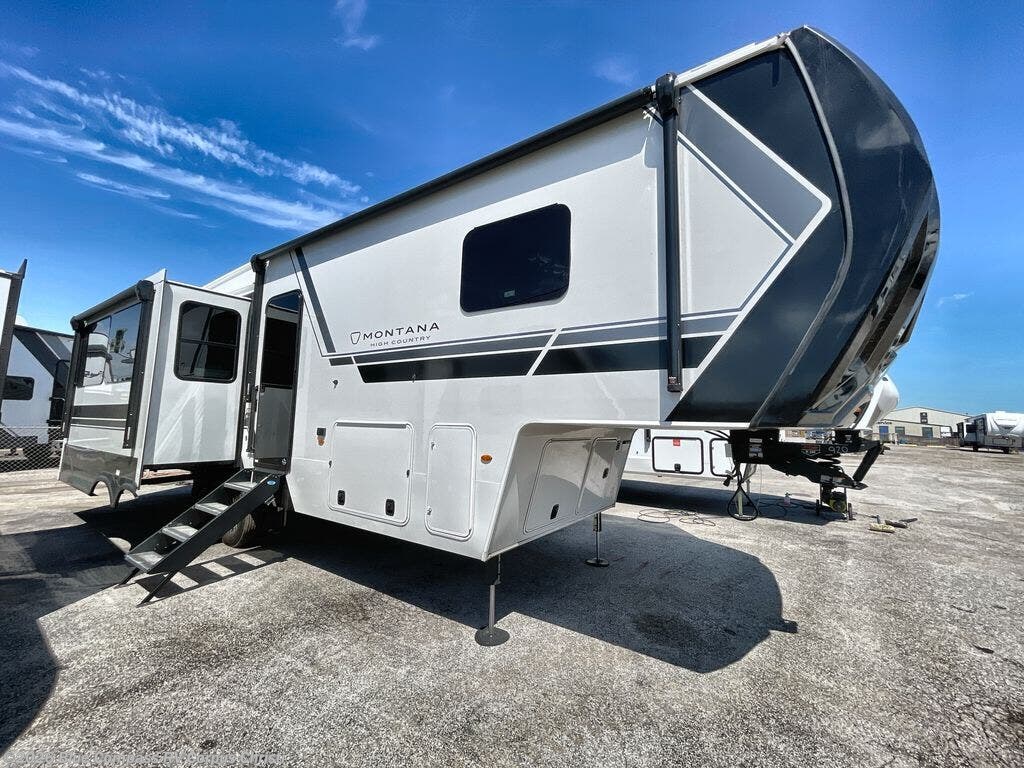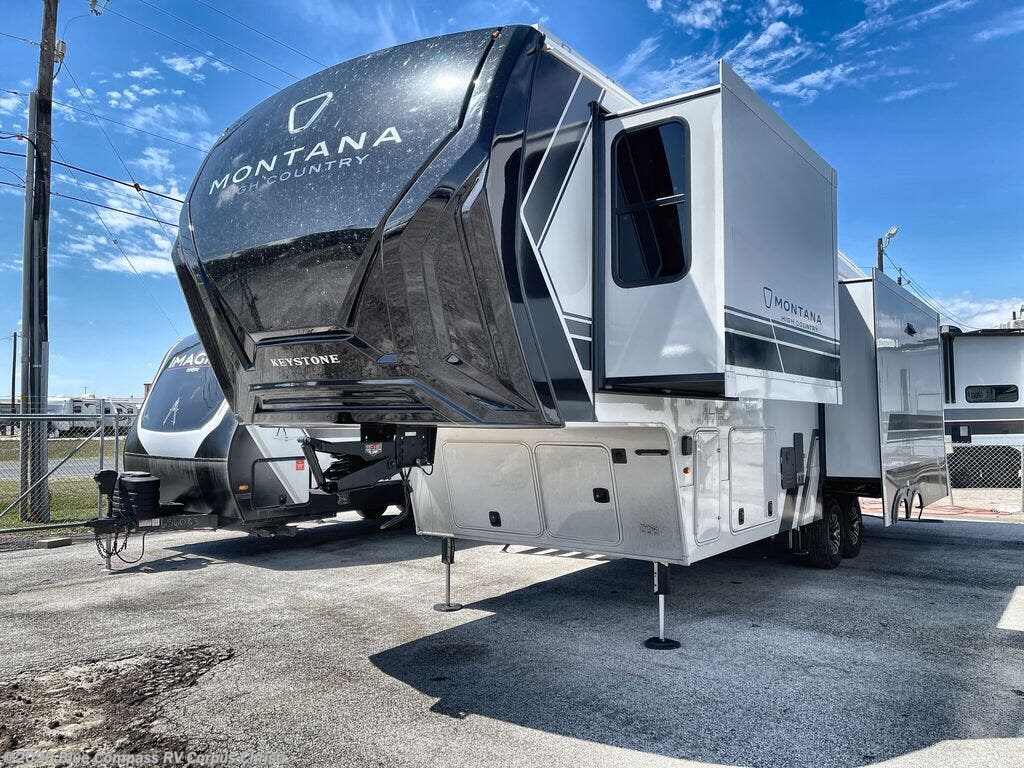 With any Montana High Country fifth wheel by Keystone, you'll find comfort and convenience at every turn! Each unit is built with a fully walkable roof with an Alpha seamless TPO membrane system, 2" thick composite backed high-gloss fiberglass sidewalls, plus an insulated underbelly with forced hot air and electric tank heaters for added protection against the elements. The Blade Pure airflow system provides efficient cooling, and the Tru-Fit slide construction is a durable slide design that minimizes functional motor structural stress and resists leaking. Inside, you'll find roller shades throughout, premium solid surface kitchen countertops, bedside USB and 110V outlets, plus a porcelain foot flush toilet in the bath to name a few comforts.