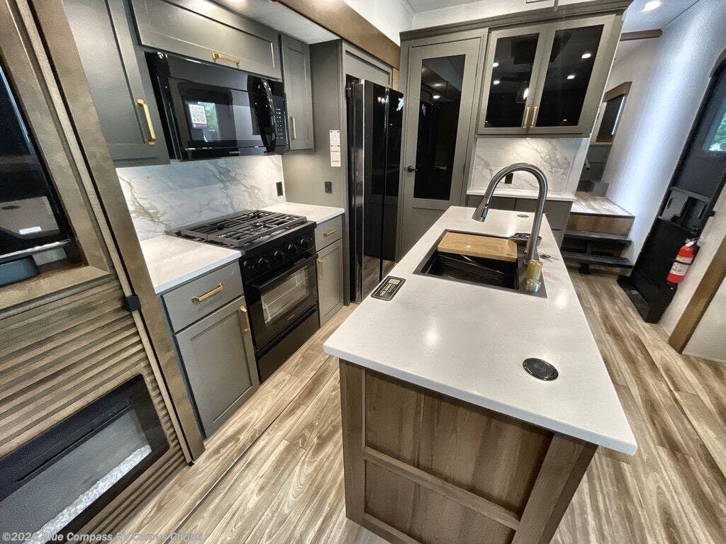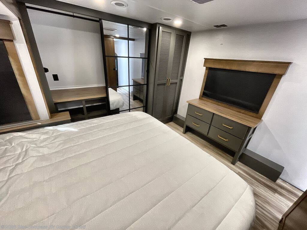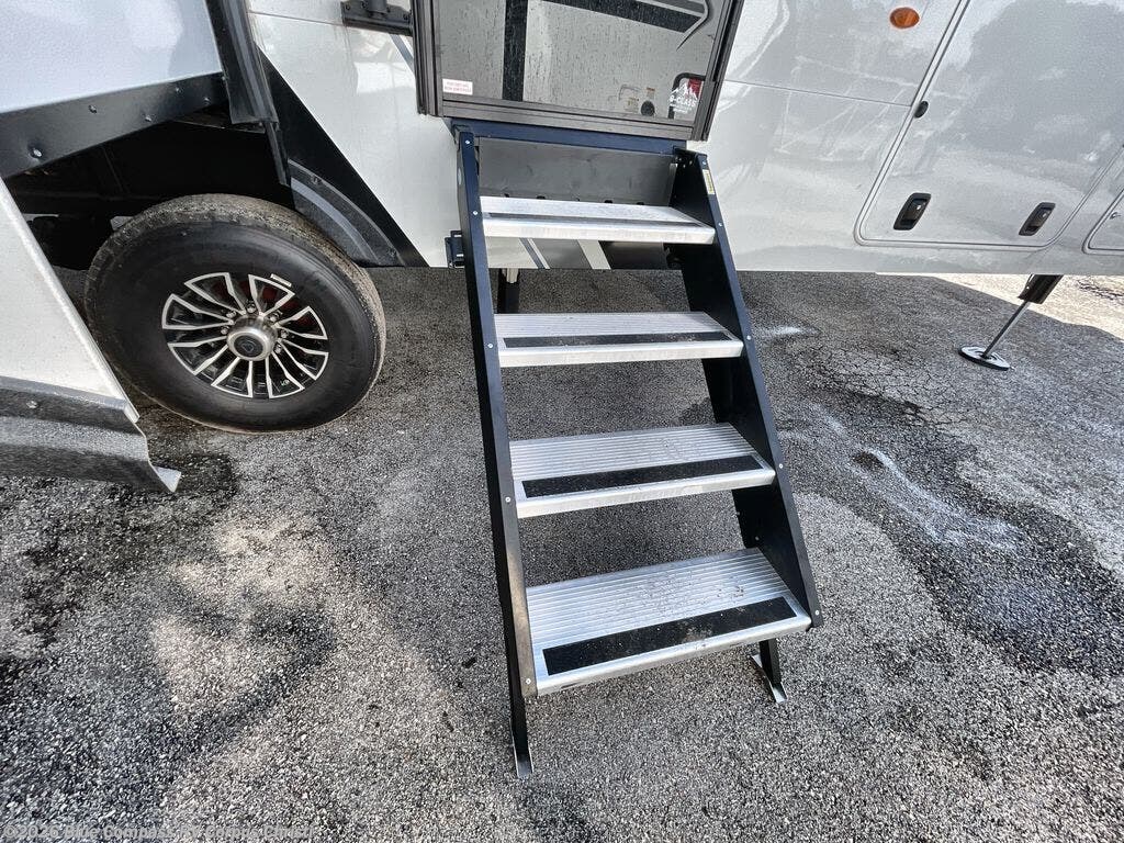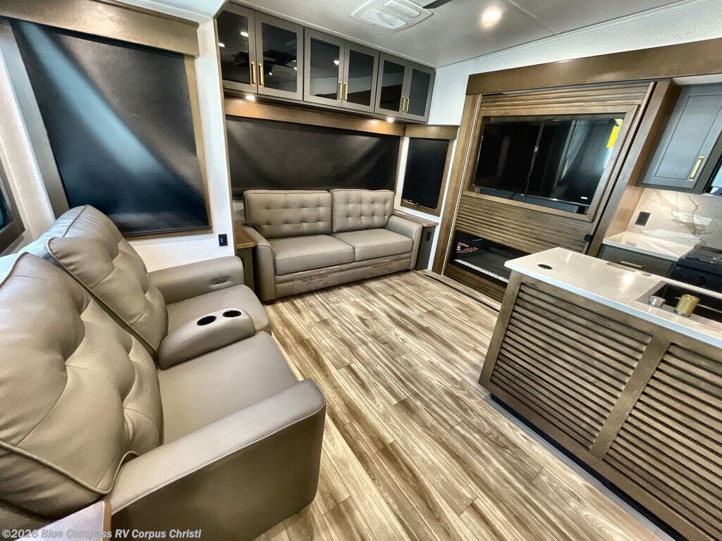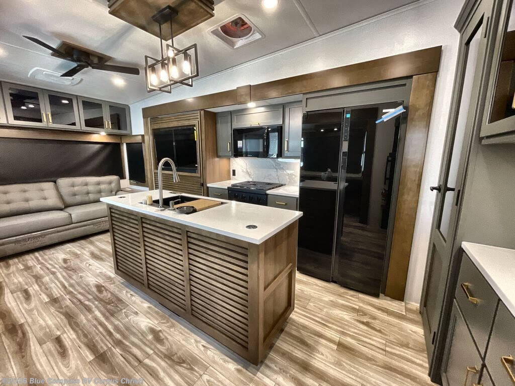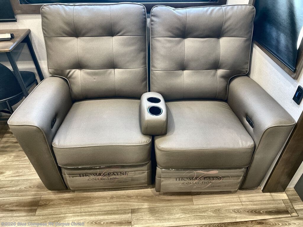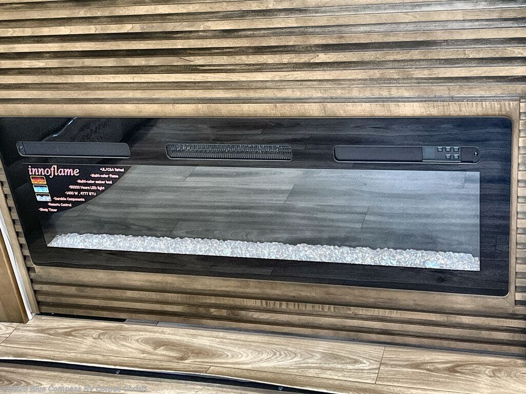 You'll love camping in this fifth wheel with a rear living room and triple slides for ample interior space! The sofa, theater seating, and adjustable sliding 'Deskette" with chairs will provide comfortable seating, dining, and working space, and the entertainment center with a fireplace will make it feel more like home. A large kitchen island gives you more counter space when making meals in the full kitchen, and the spacious full bath is a comfort you won't want to camp without. Up front, you'll find a private bedroom with a king bed slide, storage space and TV prep if you want the option to watch movies in bed.
