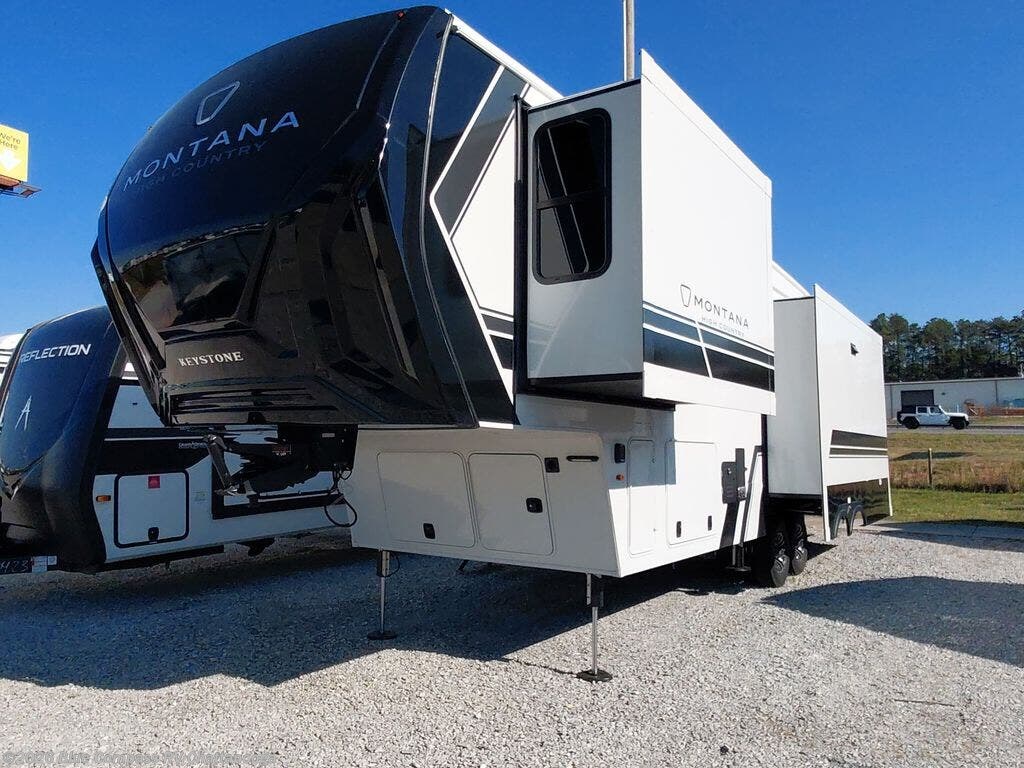 With any Montana High Country fifth wheel by Keystone, you'll find comfort and convenience at every turn! Each unit is built with a fully walkable roof with an Alpha seamless TPO membrane system, 2" thick composite backed high-gloss fiberglass sidewalls, plus an insulated underbelly with forced hot air and electric tank heaters for added protection against the elements. The Blade Pure airflow system provides efficient cooling, and the Tru-Fit slide construction is a durable slide design that minimizes functional motor structural stress and resists leaking. Inside, you'll find roller shades throughout, premium solid surface kitchen countertops, bedside USB and 110V outlets, plus a porcelain foot flush toilet in the bath to name a few comforts.