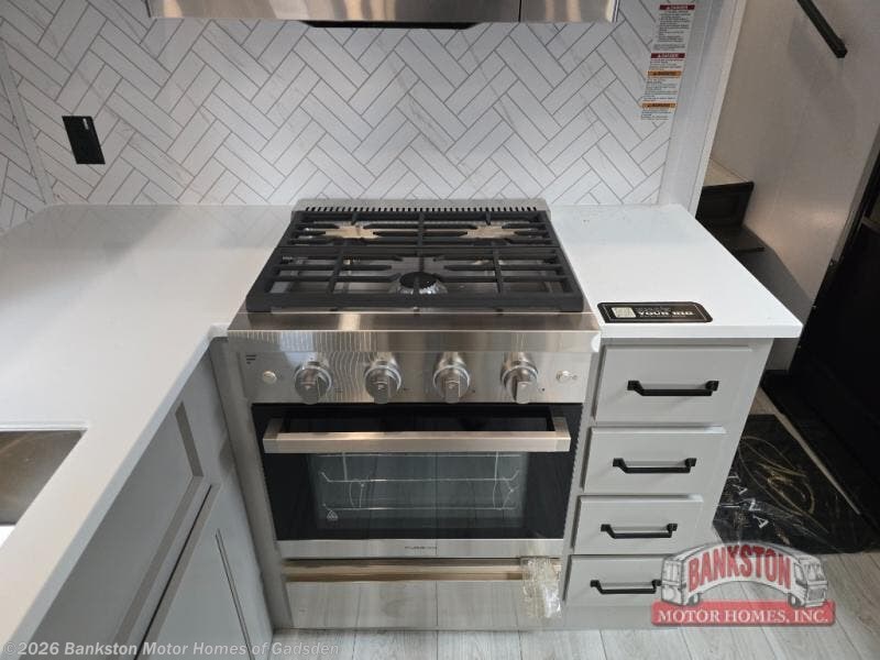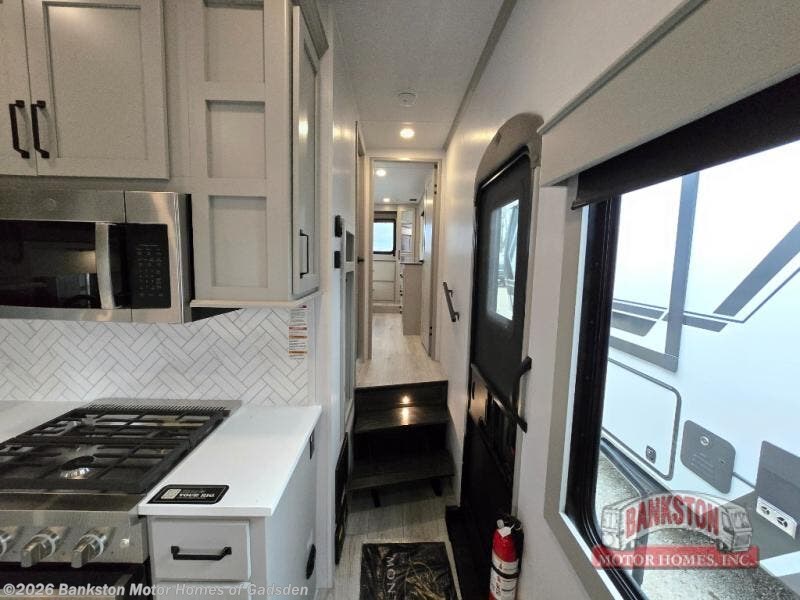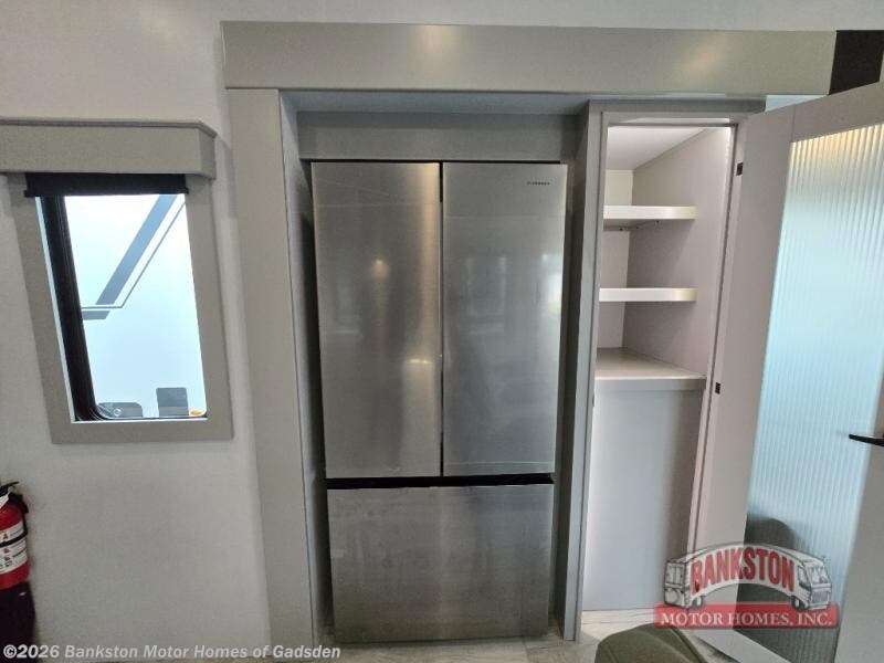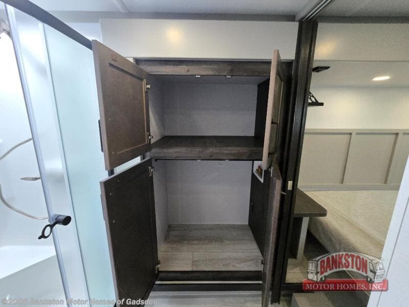 This couples coach will have you excited about traveling to all of your favorite places, and new locations too! The triple slide unit features an open concept living/dining area with dual opposing slides at the very back featuring a hide-a-bed sofa along the curbside, and a dining space opposite with a booth dinette or choose the optional table and four chairs. Power theater seats will be a comfortable place to kick back for a movie, and you will love the all-new entertainment center design featuring a fireplace, Smart TV, and overhead cabinets. In the evening, head up to your private retreat with a spacious bath including dual entry doors from the hall at the top of the stairs or from within the private bedroom. Get cleaned up in the large radius shower with seat and snuggle up in a king bed slide. The bedroom slide also features a large wardrobe that has been prepped for a washer/dryer if you choose to add the convenience. You will find plenty more storage spaces for your clothing and belongings in the two dressers or dual wardrobes along the full front wall. Another bonus with this unit is the outdoor kitchen which gives you a choice to cook inside or out!