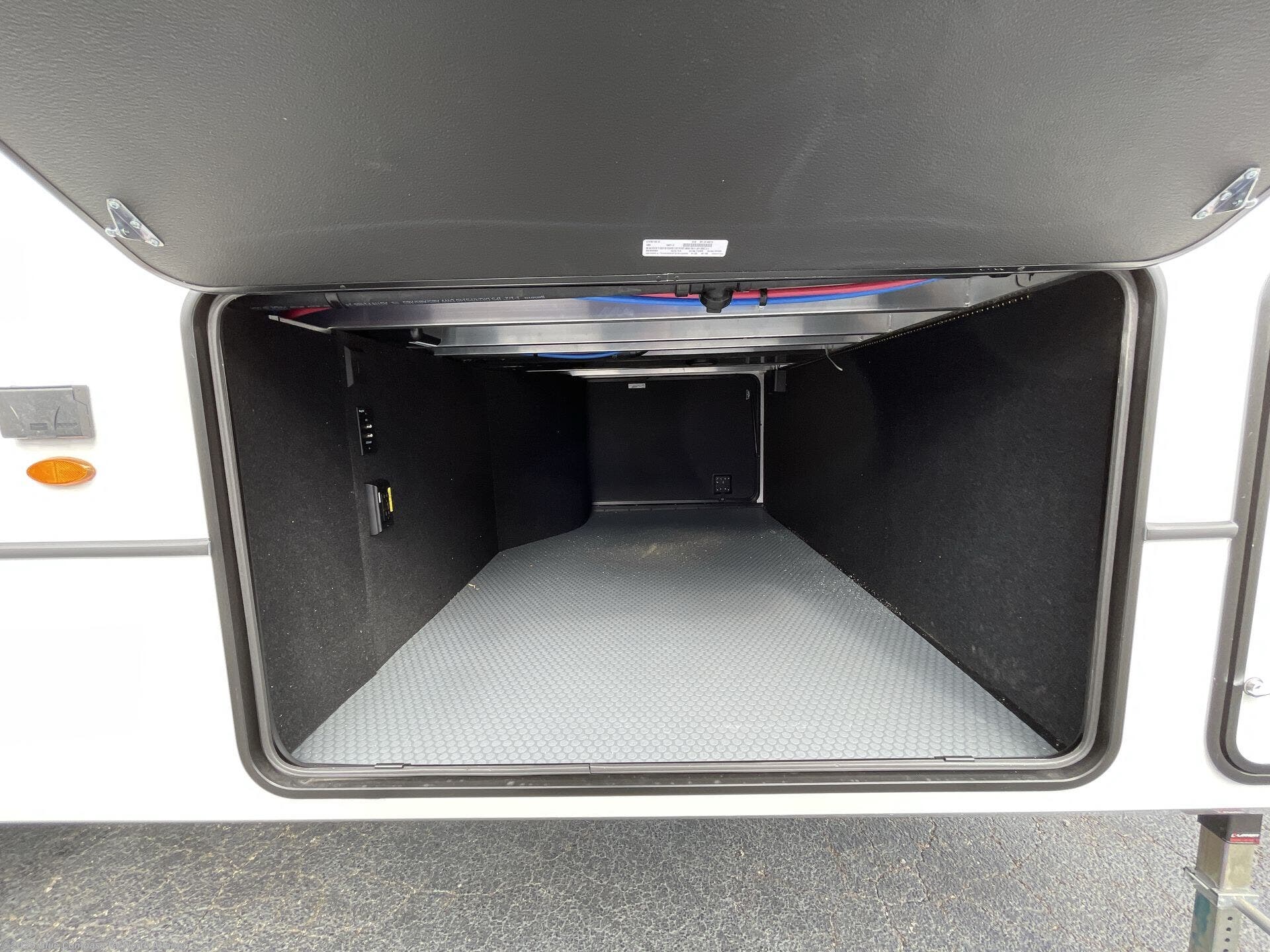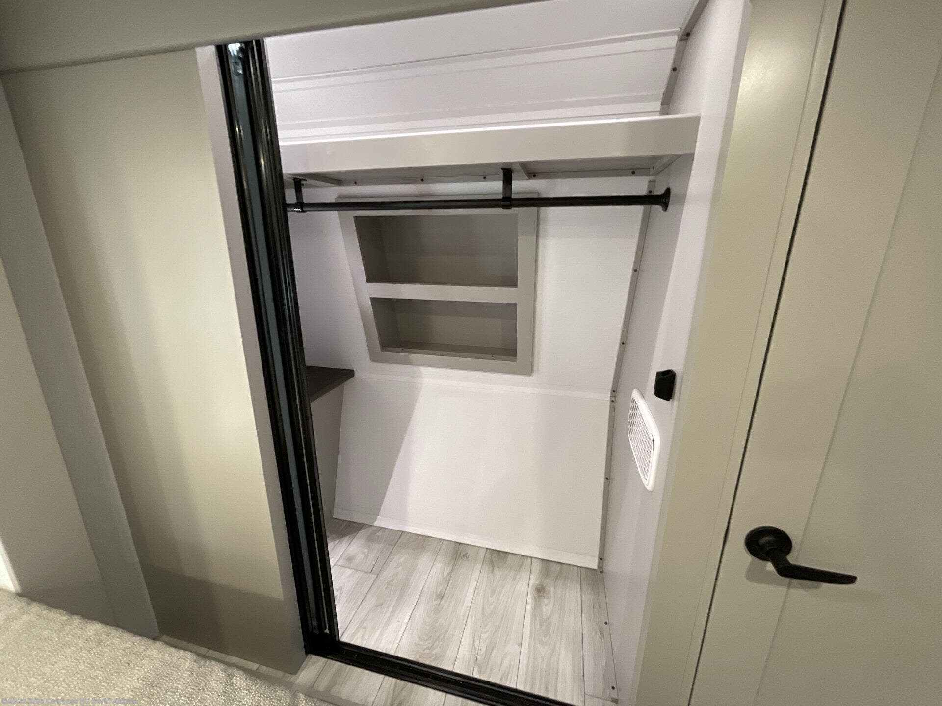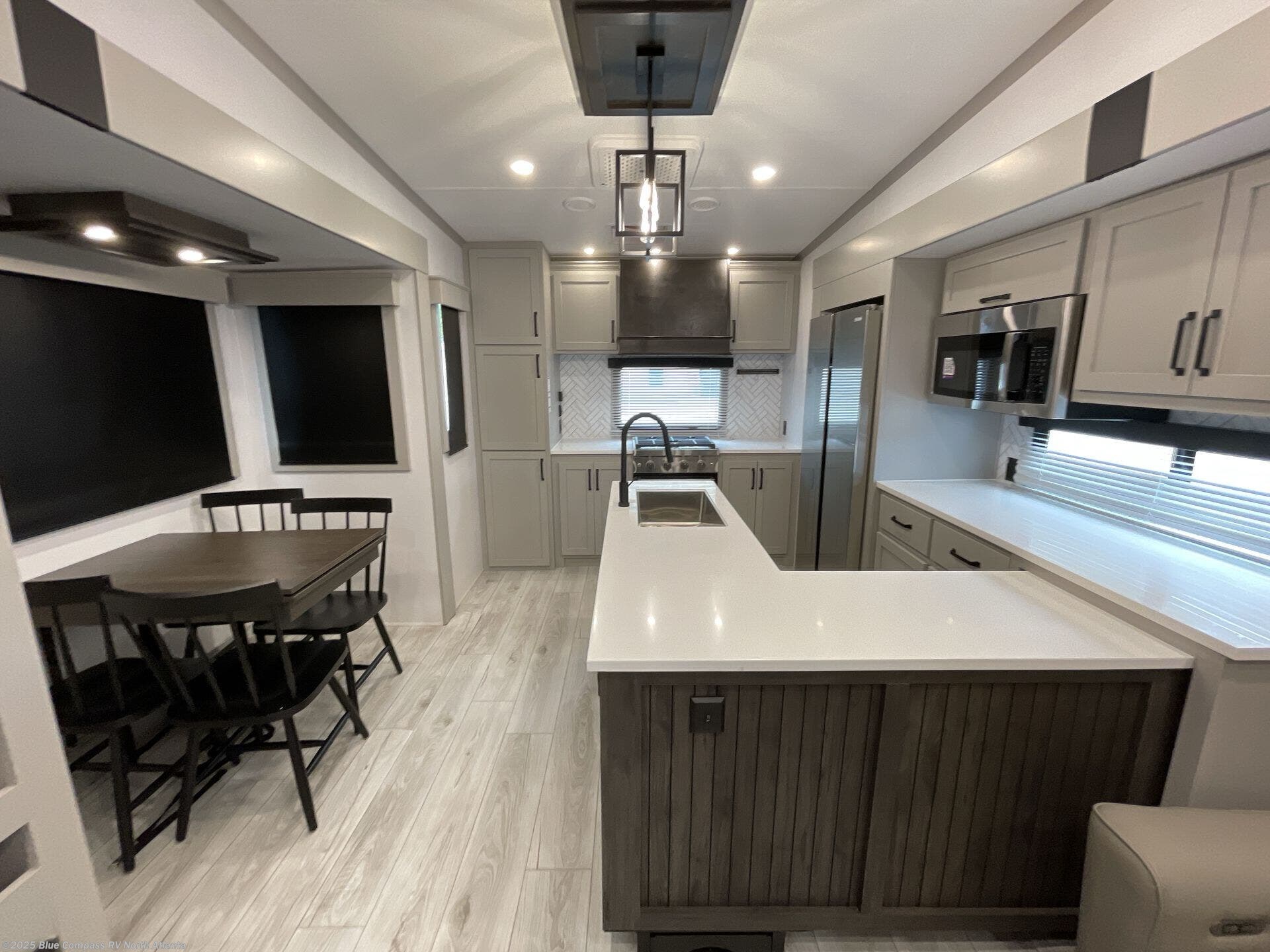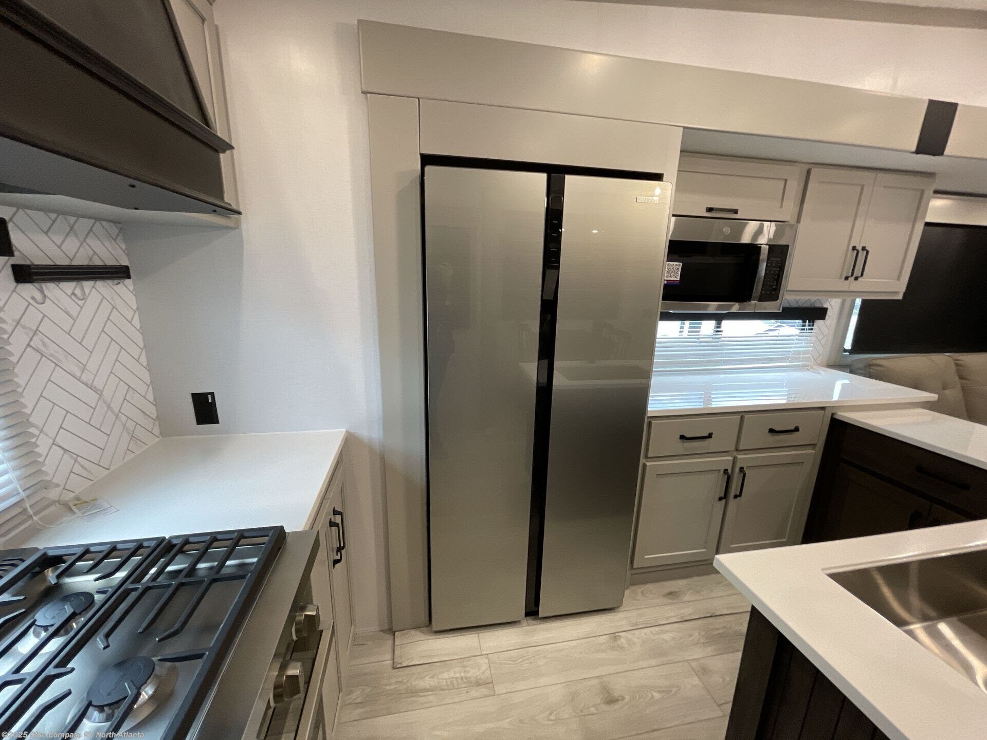 This rear kitchen fifth wheel features ample counter space, an L-shaped counter, plus a spacious pantry and residential refrigerator for food storage. Your crew can relax on the hide-a-bed sofa and power theater seating, or dine at the booth dinette. There is also an entertainment center and fireplace with a hidden pantry behind it for board games and movies. A full bath includes a shower with a seat for added comfort, and the front private bedroom with a king bed slide is sure to bring a great night's rest. You'll find a spacious wardrobe and a dresser to keep your clothes organized, plus washer and dryer prep if you want to add these appliances.