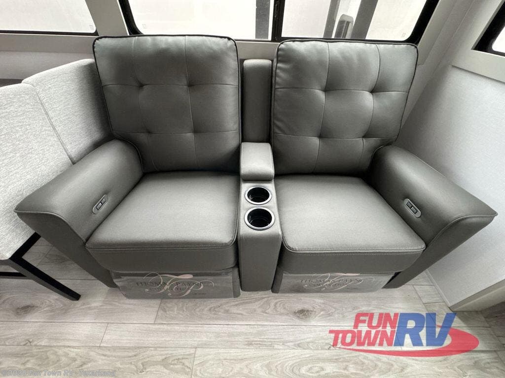 You can live life to its fullest in this Montana High Country fifth wheel! There are opposing slides in the main living area for more space, and the fireplace adds coziness to this space. Spend time relaxing on the power theater seating, and use the hide-a-bed sofa as an extra bed when you have friends turn into overnight guests. The pantry will help you keep your snacks stored away, and full bathroom has a dual-sink vanity and 48" x 30" shower with seat for a convenient way to get clean. The front bedroom has a king bed slide with storage underneath the bed, and the wardrobe and dresser provide more storage space.