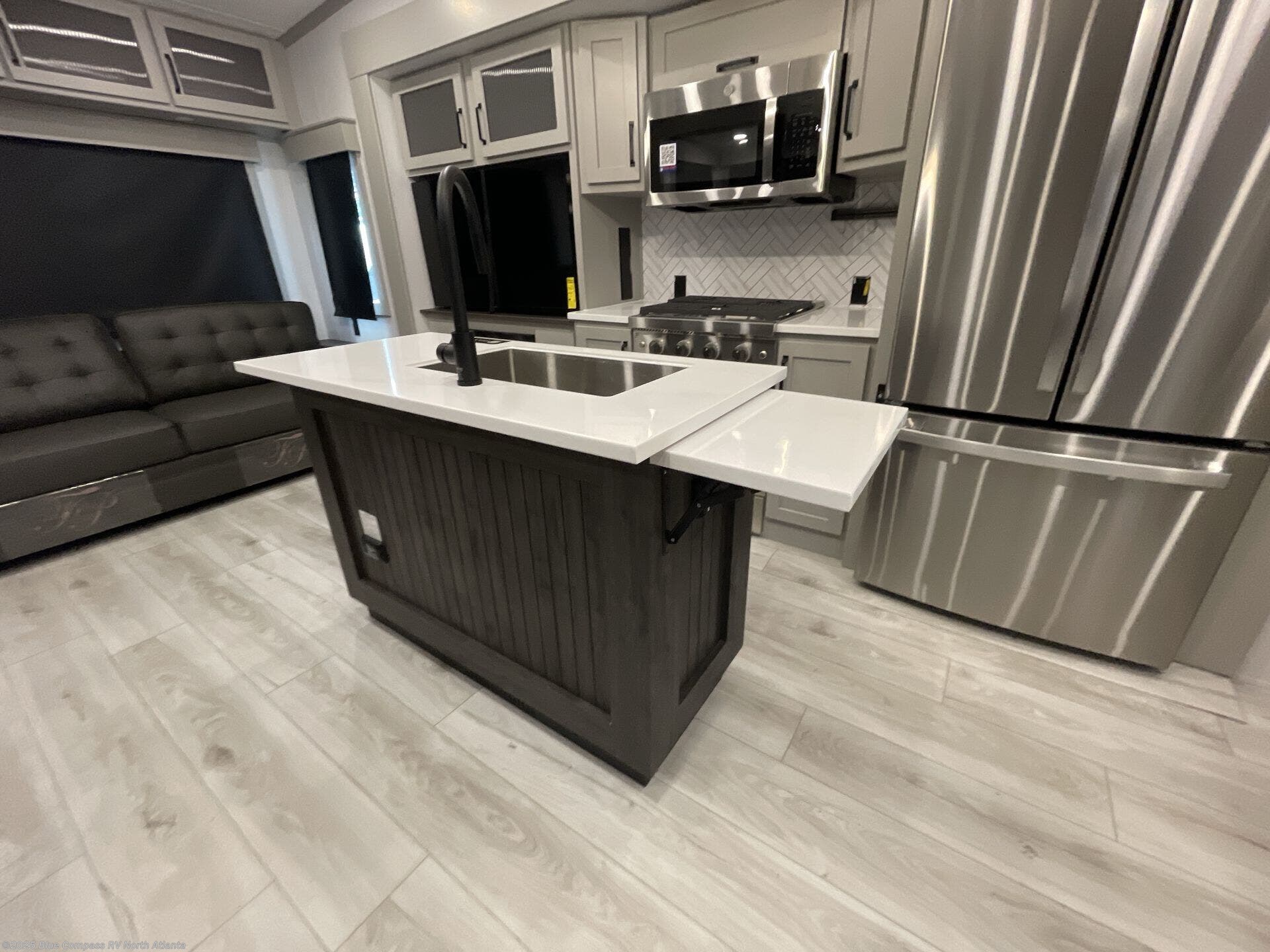 Just one look at this Montana High Country fifth wheel will impress you! There is an extra middle room that can be used for many different purposes, like an office, a guest bedroom, a craft room, or a hangout room. The hide-a-bed sofa sits on a slide for more space in this room, and there is a desk that can be used to get some work done. Above this room is a loft, so you have even more sleeping space. You also have a hide-a-bed sofa in the living area, and the king-size bed in the front private bedroom has storage underneath. The power theater seating sits across from the fireplace and 50" LED TV for nighttime entertainment, and the kitchen island has a countertop extension for more prep space.