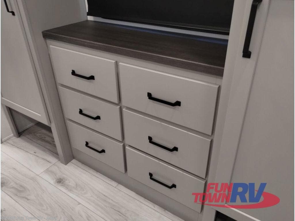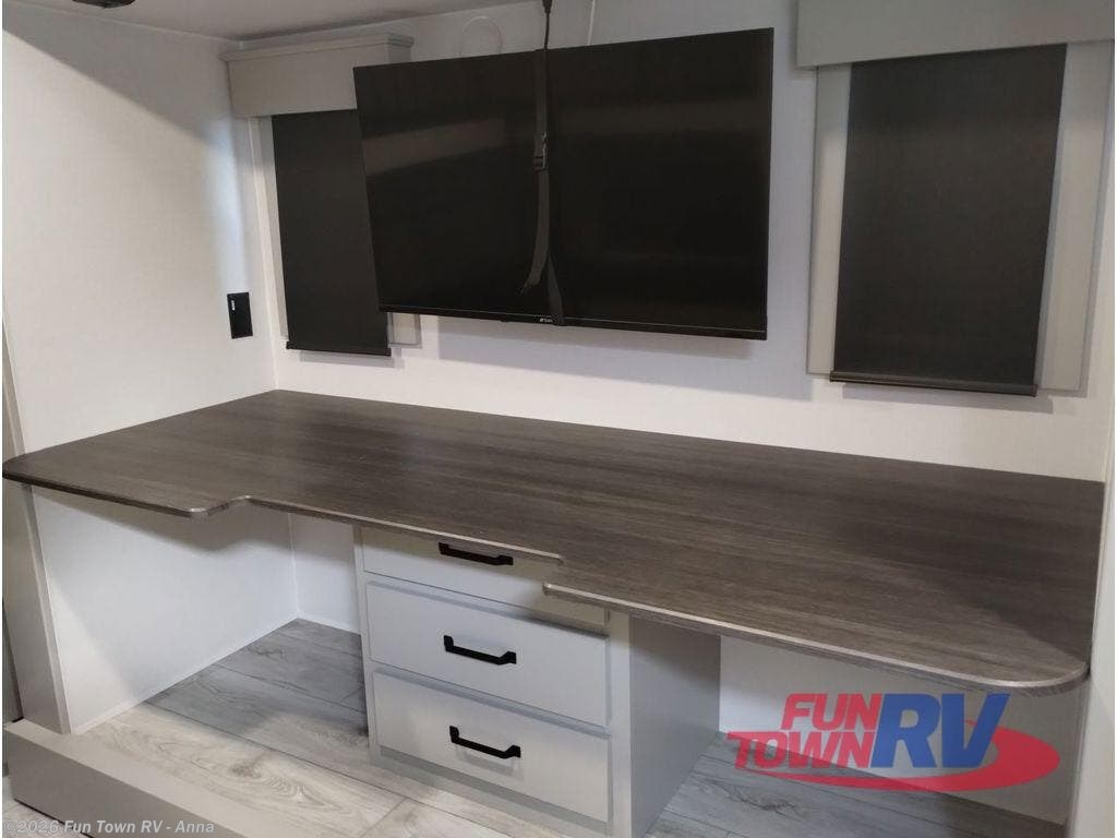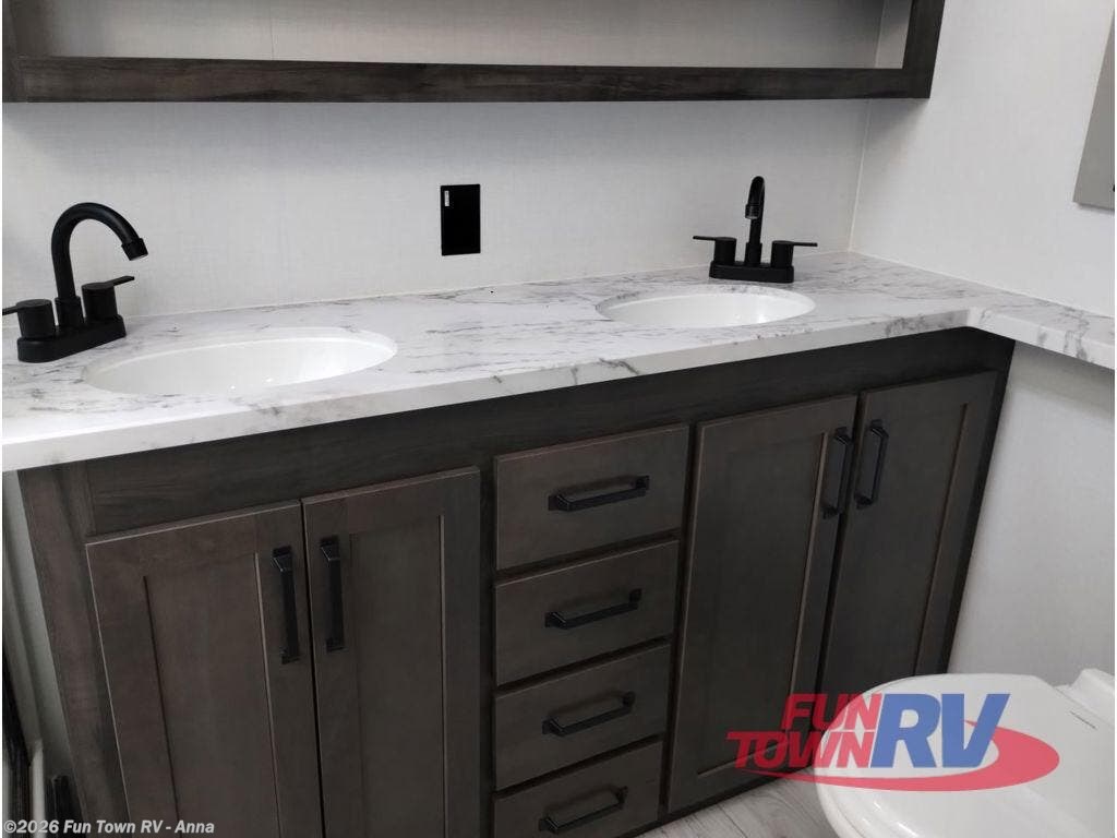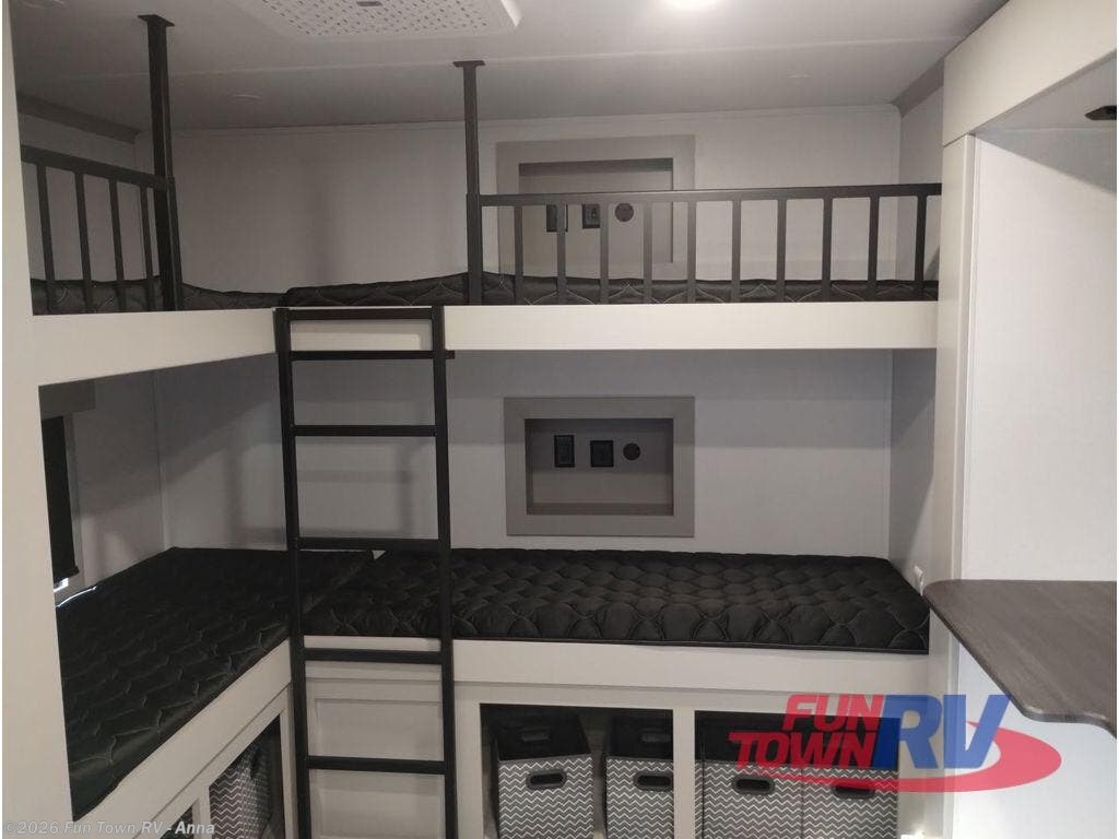 You'll love every minute spent in this spacious fifth wheel! It's perfect to camp with a larger group since there are bunk beds in the front bunkhouse suite plus a second suite in the back. The bunkhouse also includes two desks with chairs and storage drawers, a full bath, plus washer and dryer prep if you plan to go full-time. The rear suite features a king bed slide, two closets, a bedroom countertop plus a full rear bath with dual bath sinks; how convenient! Everyone will love to meet in the combined kitchen and living area in the morning. Here, you'll find two large opposing slides for tons of space, a large sofa and kitchen island, plus three pantries for all the snacks, canned goods, and paper products!