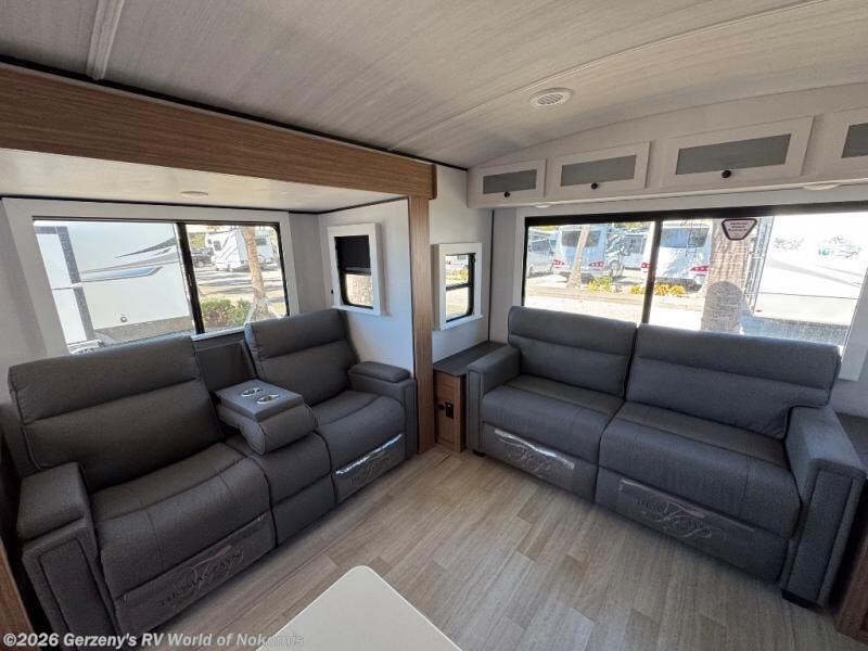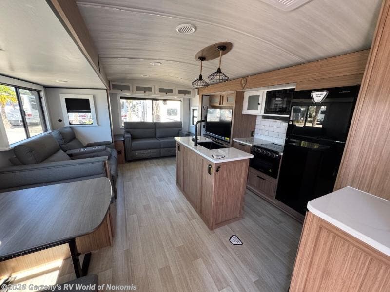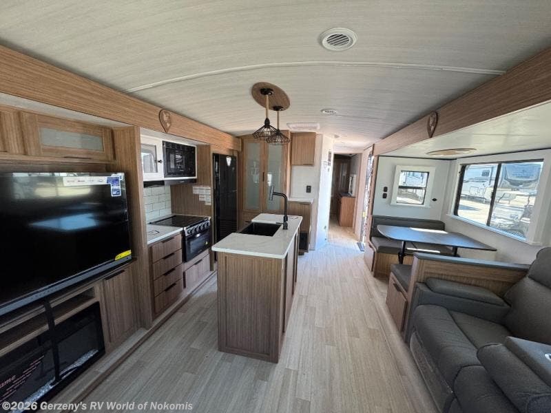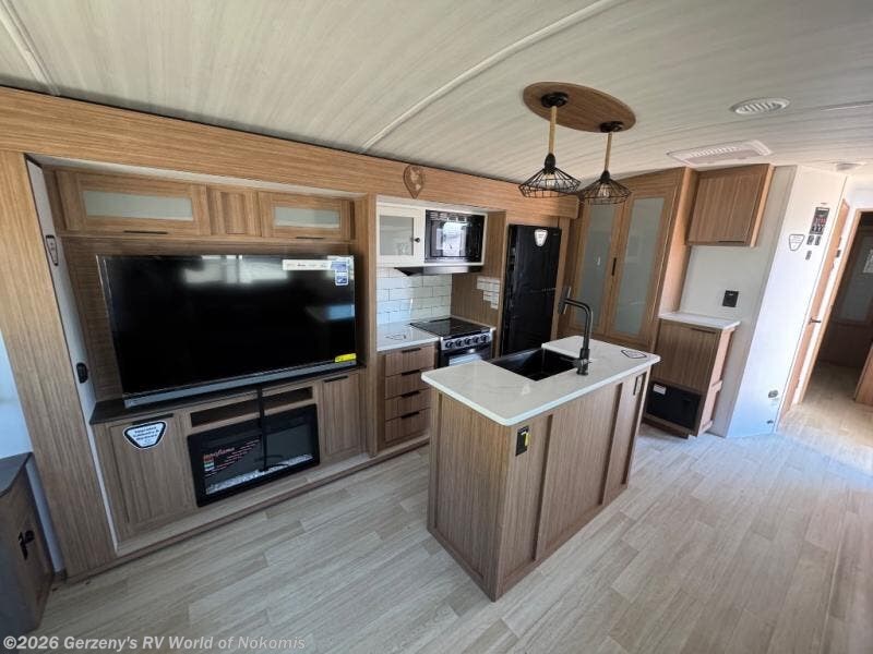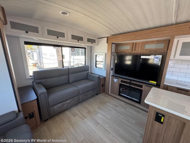 You will feel right at home in this travel trailer! The front private bedroom has a king bed slide to lay your head on at night, a front closet with washer and dryer prep, plus a dresser with a flip-up top and TV prep. Just outside the bedroom is the full bathroom with a shower with a skylight for added natural lighting as you get ready. Now that you're ready for the day, you can head to the fully equipped kitchen complete with a kitchen island to whip up some delicious cinnamon rolls that can be enjoyed at the Do-More Dinette table. The rear living area not only has luxury cinema recliners, but also a tri-fold sofa by an entertainment center with a fireplace!