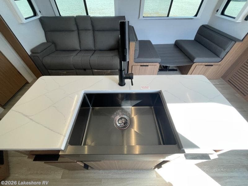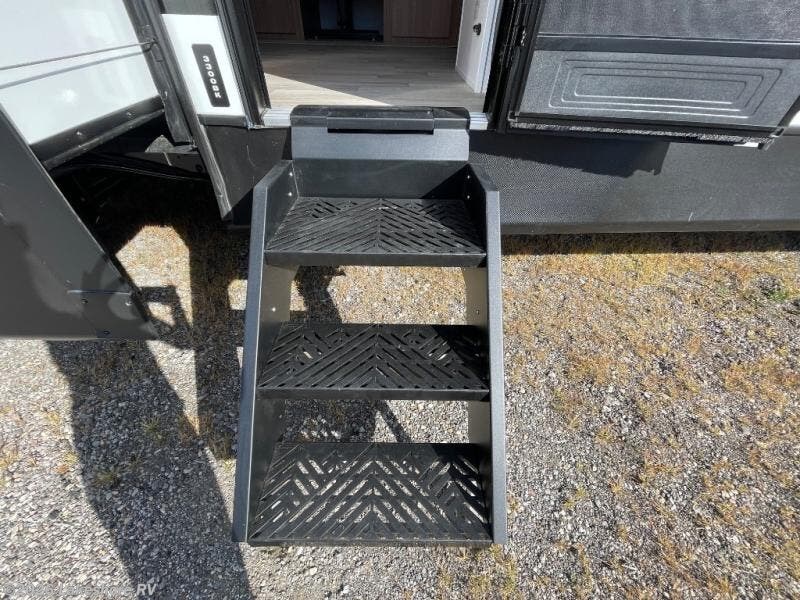 You won't believe all that this travel trailer has to offer! Starting with the rear private bunkhouse which has a 28" x 74" flip-up bunk above a tri-fold sofa, a 51" x 74" bunk above an entertainment center, and even a half bathroom which has one of the dual entry doors to the unit. The front private bedroom has a queen bed to lay your head on at night with wardrobes on either side. As you exit the bedroom, you will enter the walk-through bathroom. Now that you're ready for the day, you can head to the fully equipped kitchen complete with a kitchen island to whip up some delicious cinnamon rolls that can be enjoyed at the Do-More dinette table. You even have an outside kitchen with a griddle, sink, and mini-fridge!