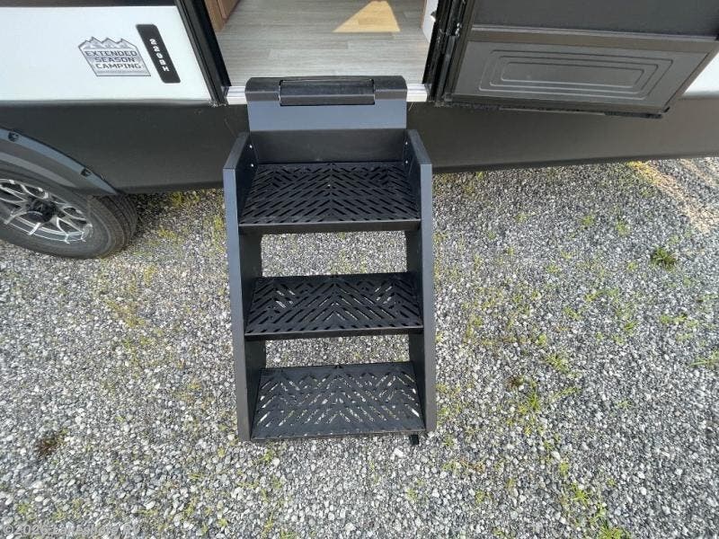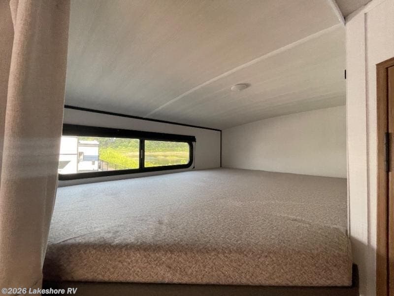 Trips to the lake with a larger group are made easy in this spacious travel trailer! The double-size bunks include a flip-up bunk for added storage, and there is a rear cargo door here so you can easily load gear from outside. The full bath is conveniently located right by the bunks for easy nighttime use, and the pantry is also close by if anyone needs a midnight snack! You will sleep like a baby in the front bedroom that includes a queen bed and dual wardrobes to keep your clothes tidy. In the morning, everyone can meet in the combined living area and kitchen while the chef makes breakfast on the three burner cooktop, and there is a U-shaped do-more dinette table to dine at. If the weather is nice, the chef just may want to cook on the outside kitchen with a griddle, and everyone can sit at the picnic table under the 15' awning!