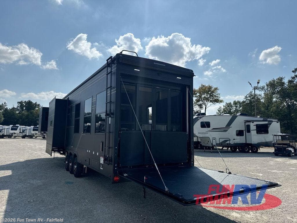 You will have everything you need for a comfortable camping trip and then some with this toy hauler! Load your toys into the 16' garage area with the Lippert Power Play motorized ramp door and secure them with 5,000 lb. frame welded tie-downs. The garage also has an electric bed above dual opposing sofas with a loft with a twin bed and a half bathroom. Create your best meals with the four-burner cooktop and enjoy the company of others sitting at the kitchen island with three bar stools while you prepare it. Relax in true comfort on the 4-seat recliner across from the entertainment center with a fireplace. When you're ready to wind down your nights, take a hot shower in the full bathroom then head directly into the front private bedroom which features a king bed suite with a large front wardrobe for clothing storage, and washer/dryer prep in case you wish to add appliances so you can wash your clothes while you are away!