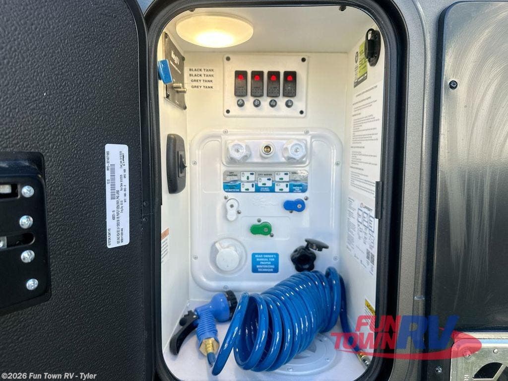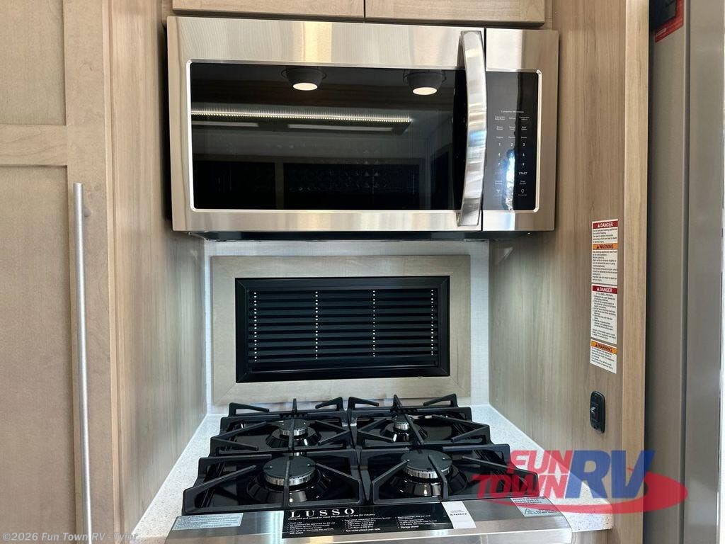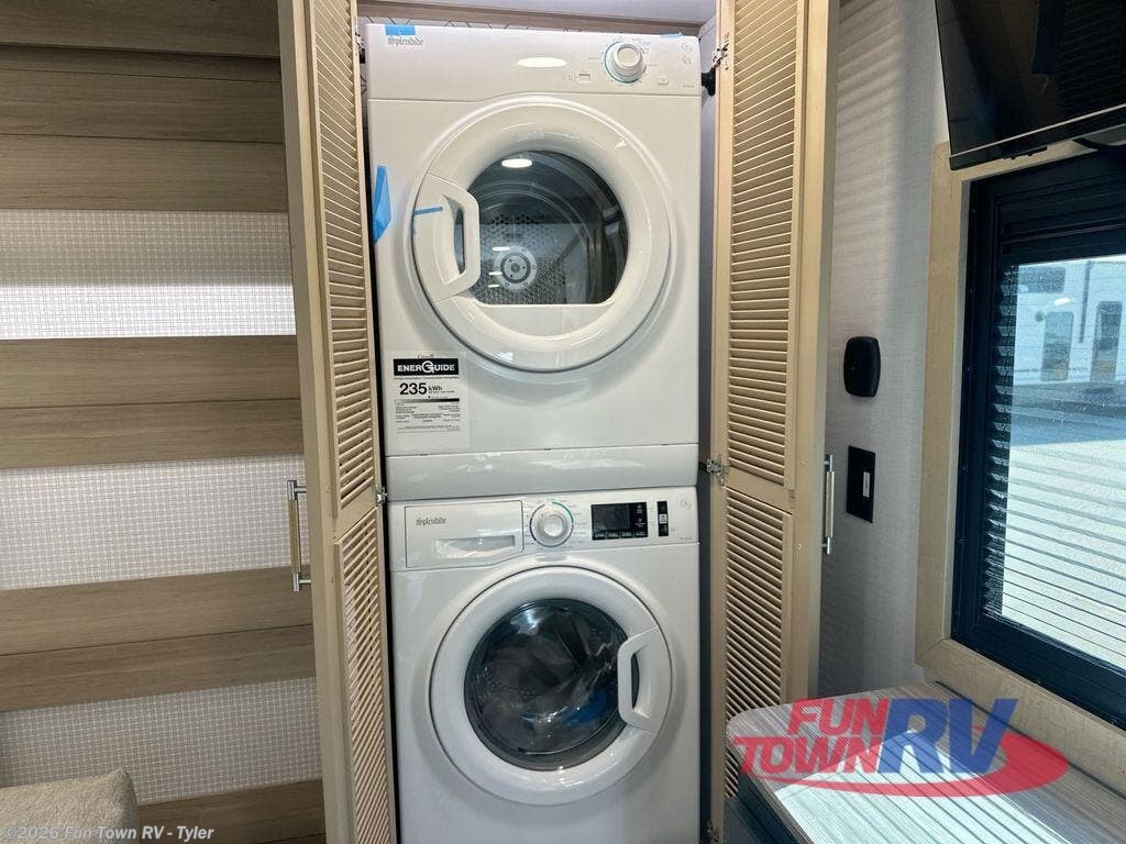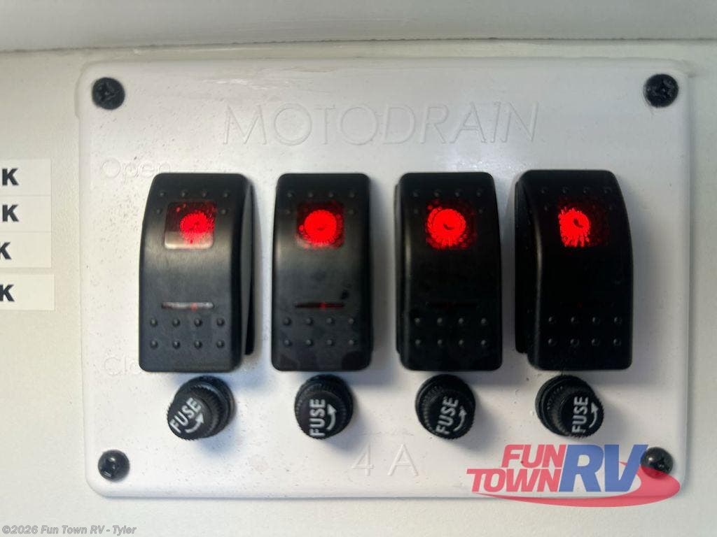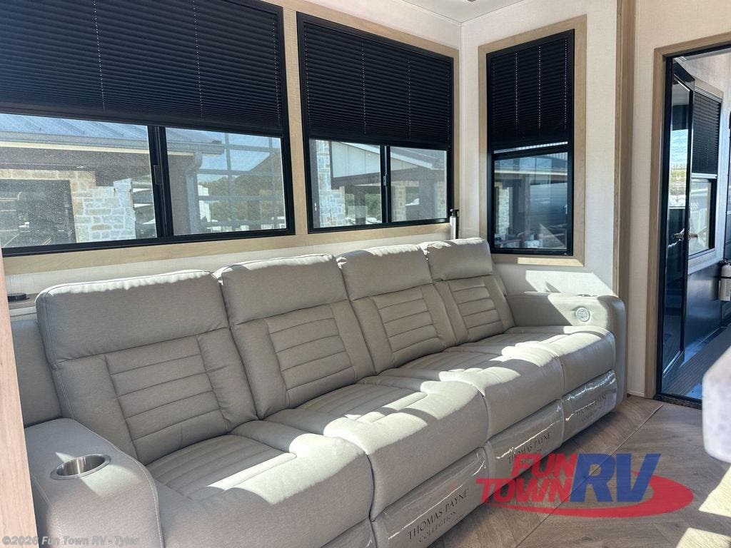 You will have everything you need for a comfortable camping trip and then some with this toy hauler! Load your toys into the 16' garage area with the Lippert Power Play motorized ramp door and secure them with 5,000 lb. frame welded tie-downs. The garage also has an electric bed above dual opposing sofas with a loft with a twin bed and a half bathroom. Create your best meals with the four-burner cooktop and enjoy the company of others sitting at the kitchen island with three bar stools while you prepare it. Relax in true comfort on the 4-seat recliner across from the entertainment center with a fireplace. When you're ready to wind down your nights, take a hot shower in the full bathroom then head directly into the front private bedroom which features a king bed suite with a large front wardrobe for clothing storage, and washer/dryer prep in case you wish to add appliances so you can wash your clothes while you are away!