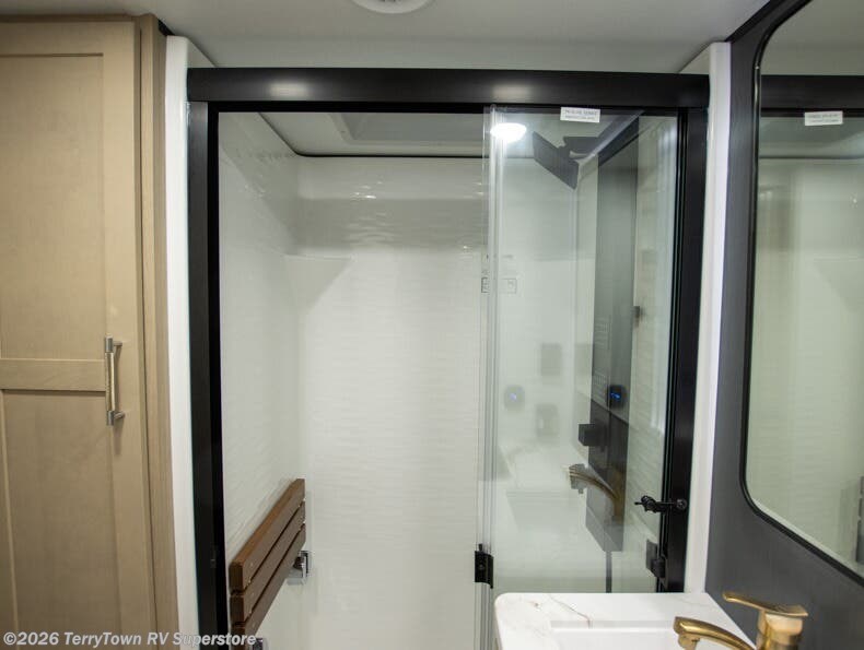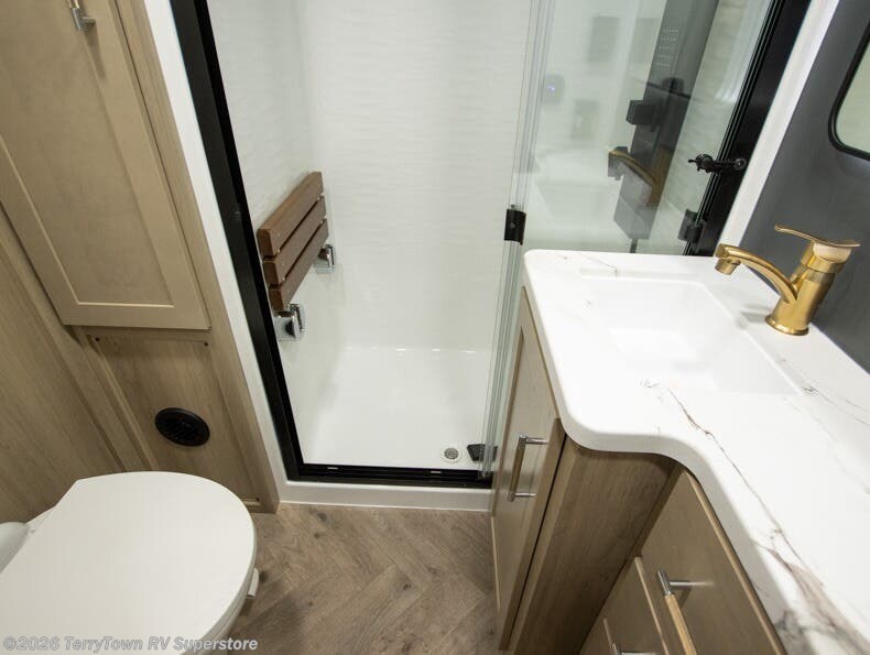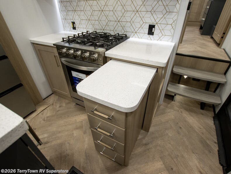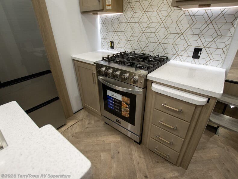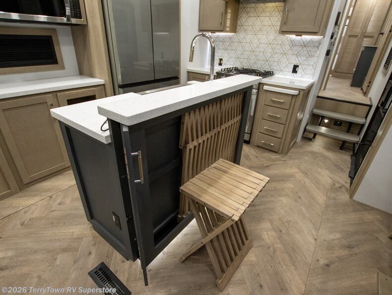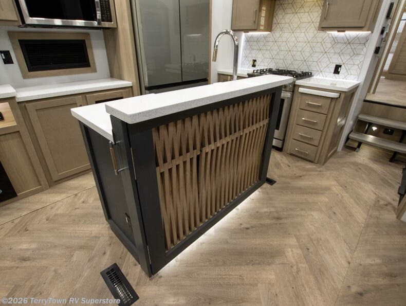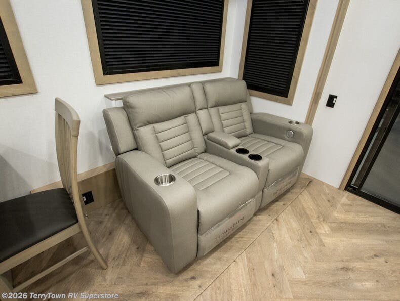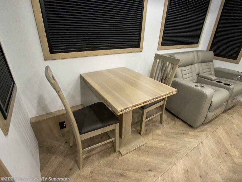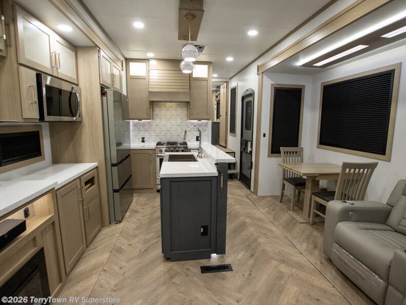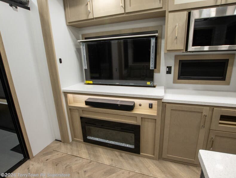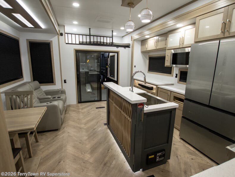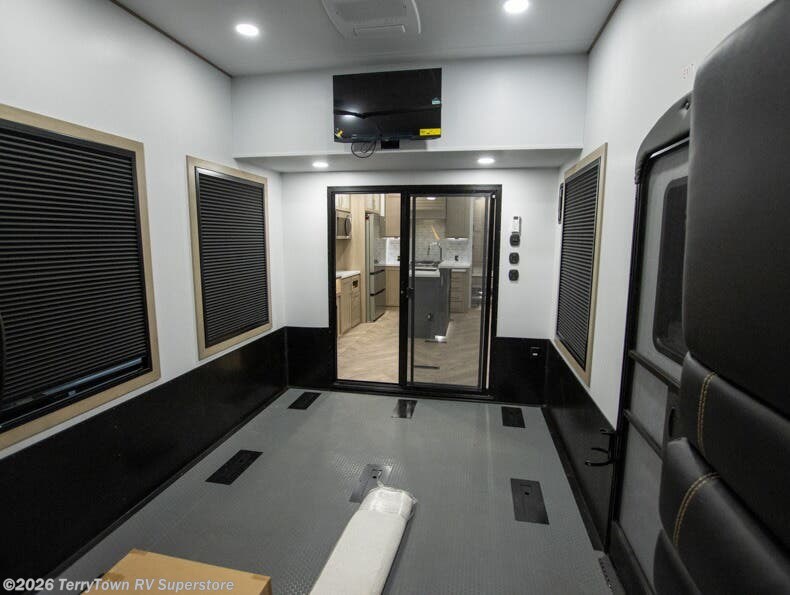 With a 15' garage area, you can bring your favorite off-road toys in this toy hauler! The exclusive ramp door with backup camera makes it easy to load them up and once you have arrived you can set up the dual opposing sofas, the electric bed above them, and the loft with a twin bed, plus there is even one of the dual entry doors to the unit. While the chef is preparing dinner on the Lasus 24" range and oven, three others can sit at the kitchen island with raised countertop and three folding bar stools or at the dinette table to play a game or simply socialize all together. When mother nature is raining on your parade, relax on the reclining theater seating with lumbar and tilting headrest, and enjoy the entertainment center with fireplace and 50" Smart LED TV. The front private bedroom will have you feeling right at home with a king bed slide, a large wardrobe with an area next to it prepped for a washer and dryer, a dresser with hidden storage, and a LED Smart TV. The full bathroom has a 42" x 30" shower with a seat to freshen up in each morning!