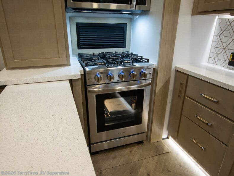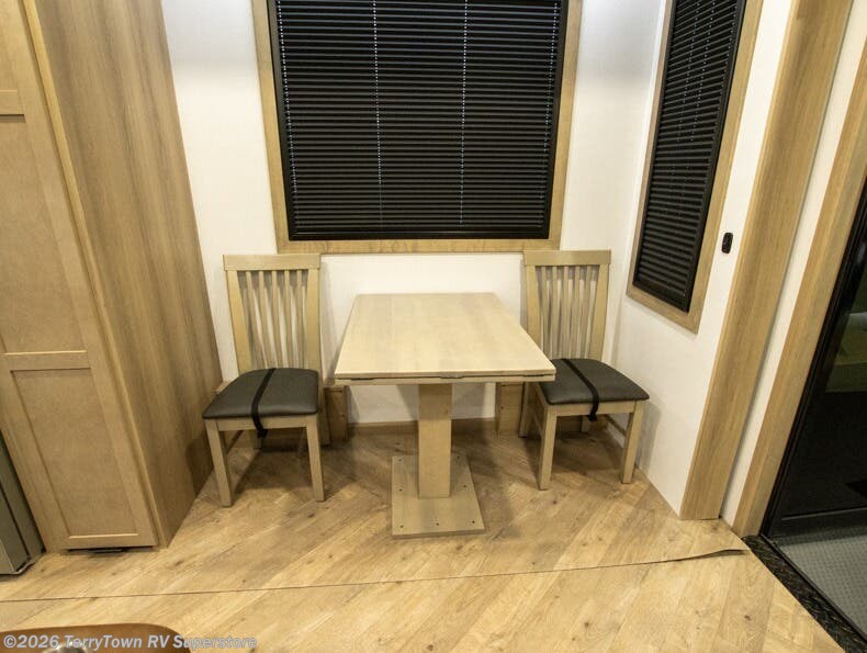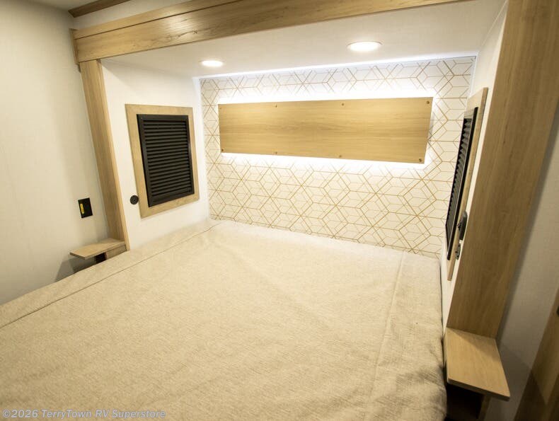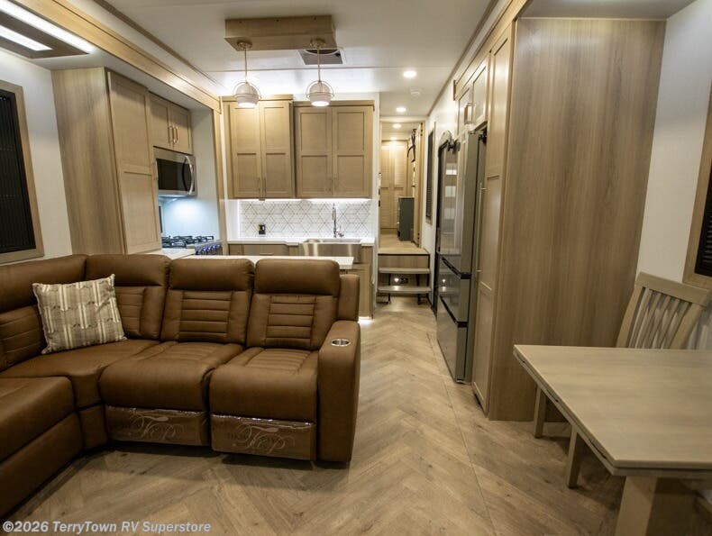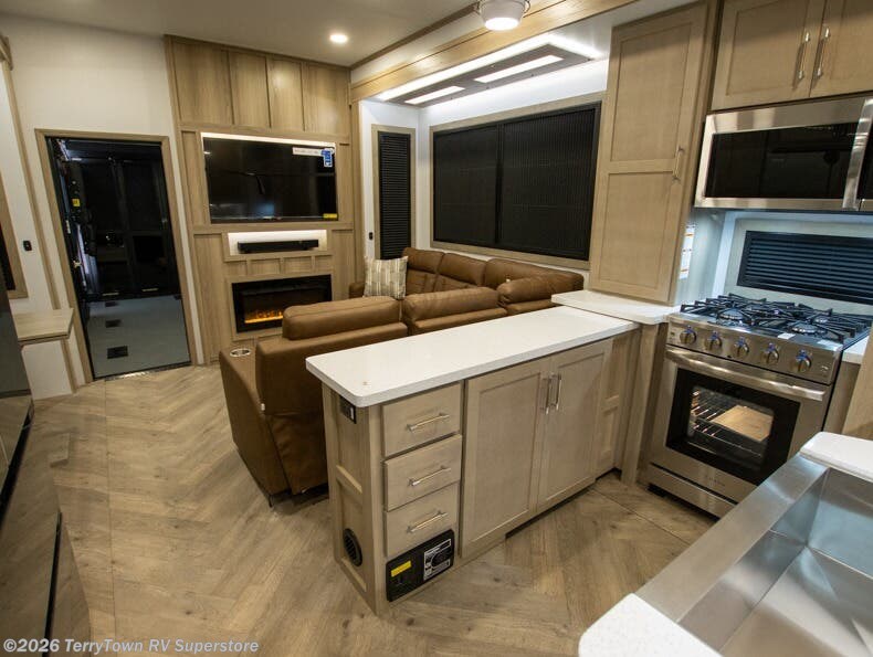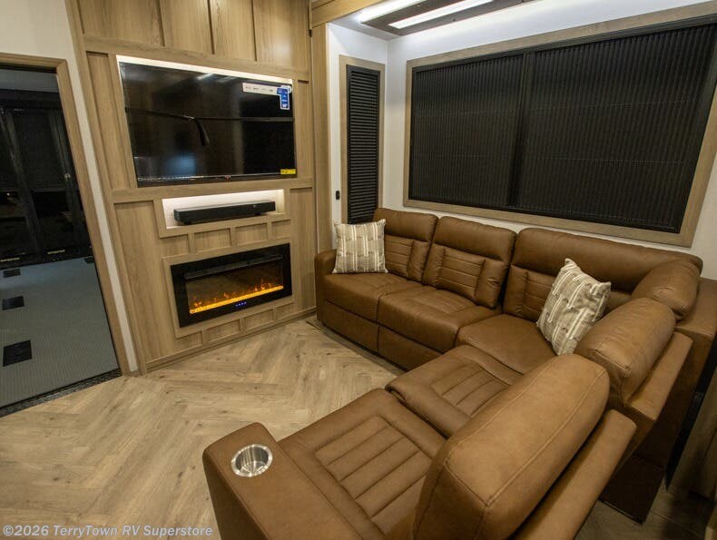 The whole family will love camping in this fifth wheel toy hauler! The front private bedroom has a king bed slide for more interior space, a Smart LED TV, a front large wardrobe, plus washer and dryer prep. Freshen up each morning in the full bathroom with the fiberglass one-piece shower then head to the kitchen to fry up some eggs on the four-burner range and bake some cinnamon rolls in the 24" stainless steel oven. Grab a cold cup of orange juice from the 20-cu. ft. 12-volt refrigerator and enjoy it along with the eggs at the dinette table or in the 15' garage on one of the dual opposing sofas with cupholders. The L-shaped hide-a-bed sofa is conveniently across from the entertainment center with a 50" Smart LED TV and fireplace. As you head into the 15' garage area, you will notice a loft with a twin bed, a queen bed above the opposing sofas, Adjust-A-Track frame welded tie downs, and one of the dual entry doors to the unit!