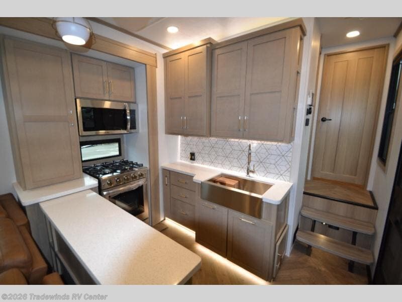 The whole family will love camping in this fifth wheel toy hauler! The front private bedroom has a king bed slide for more interior space, a Smart LED TV, a front large wardrobe, plus washer and dryer prep. Freshen up each morning in the full bathroom with the fiberglass one-piece shower then head to the kitchen to fry up some eggs on the four-burner range and bake some cinnamon rolls in the 24" stainless steel oven. Grab a cold cup of orange juice from the 20-cu. ft. 12-volt refrigerator and enjoy it along with the eggs at the dinette table or in the 13' garage on one of the dual opposing sofas. The L-shaped hide-a-bed sofa is conveniently across from the entertainment center with a 50" Smart LED TV and fireplace. As you head into the 13' garage area, you will notice a HappiJac bed with a queen-size top bed, a loft with a twin bed, plus a convenient half bath!