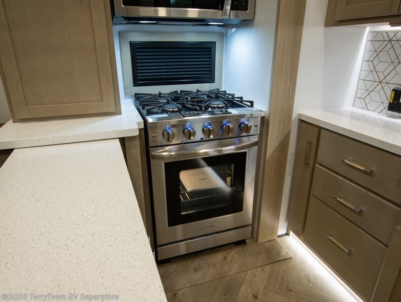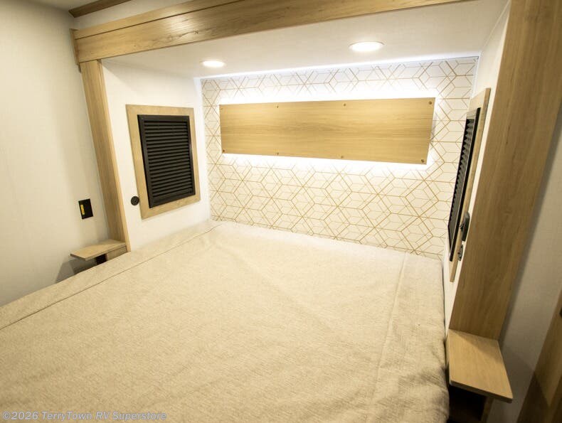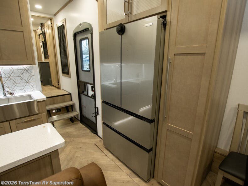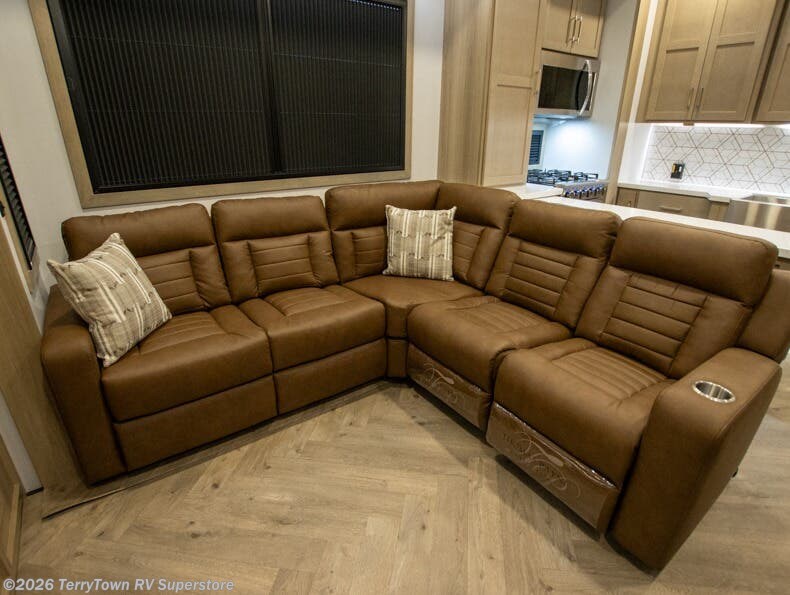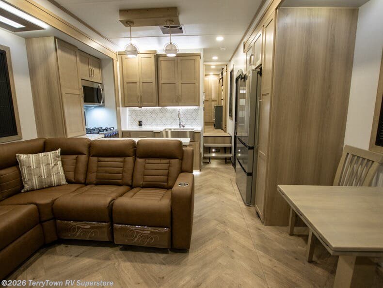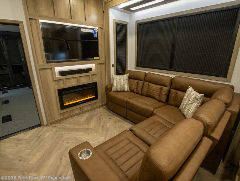 Everyone will love camping in this fifth wheel toy hauler! The front private bedroom has a king bed slide for more interior space, a Smart LED TV, a front large master closet, plus washer and dryer prep. Freshen up each morning in the full bathroom with the fiberglass one-piece shower then head to the kitchen to fry up some eggs on the four-burner range and bake a tasty treat in the 24" stainless steel oven. Grab a cold one from the 20-cu. ft.12-volt refrigerator and even enjoy it outdoors thanks to the three awnings. The L-shaped sofa is conveniently across from the entertainment center with a 50" Smart LED TV and fireplace. As you head into the garage area, you will notice a loft with a twin bed, a queen bed above the opposing sofas, and one of the dual entry doors to the unit!
